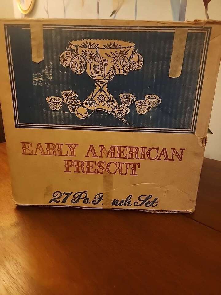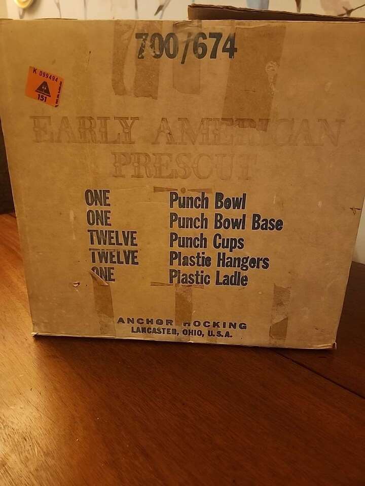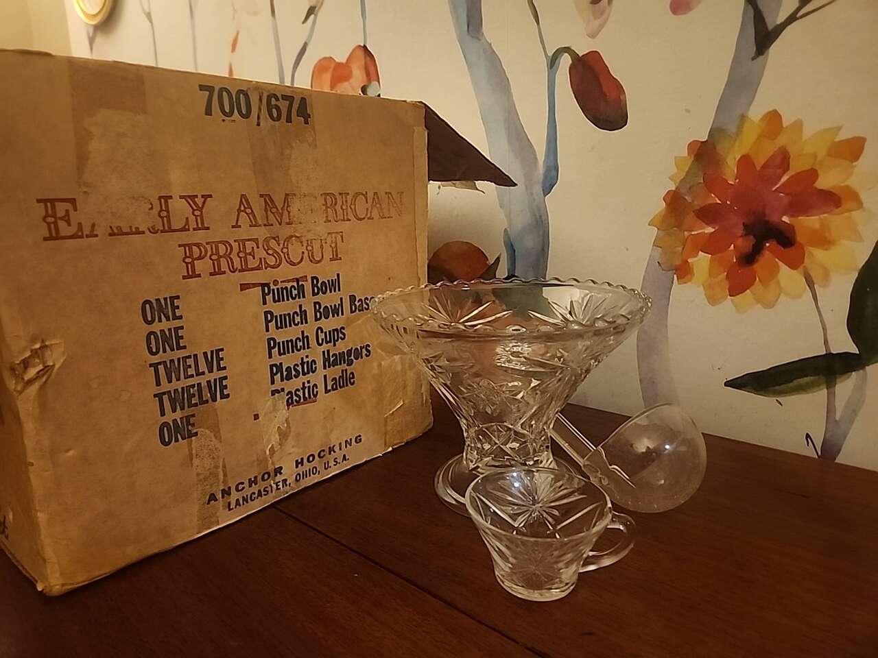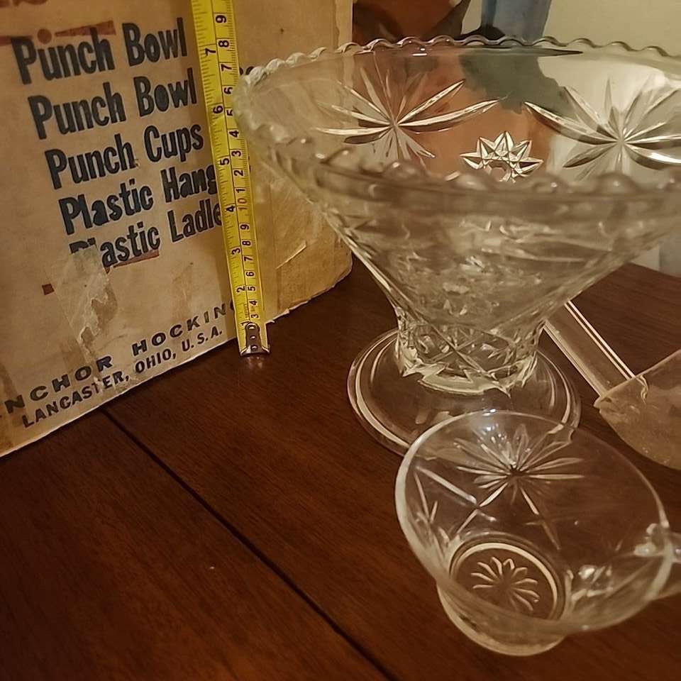 VenmoAdd a vintage touch to your dining table with this stunning Anchor Hocking punch bowl set. The set includes a glass punch bowl, plastic ladle, and 14 glass cups all in clear glass with an etched star of David pattern. This mid-century modern set was manufactured in the United States in the 1960s and is a beautiful addition to any collection.