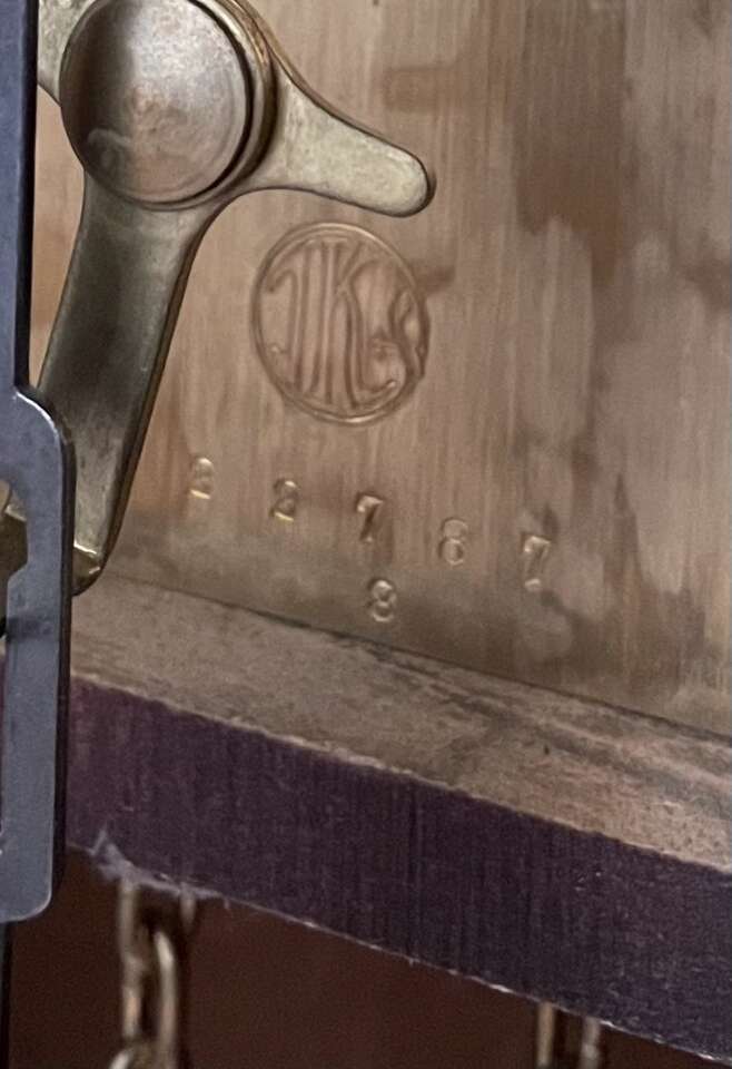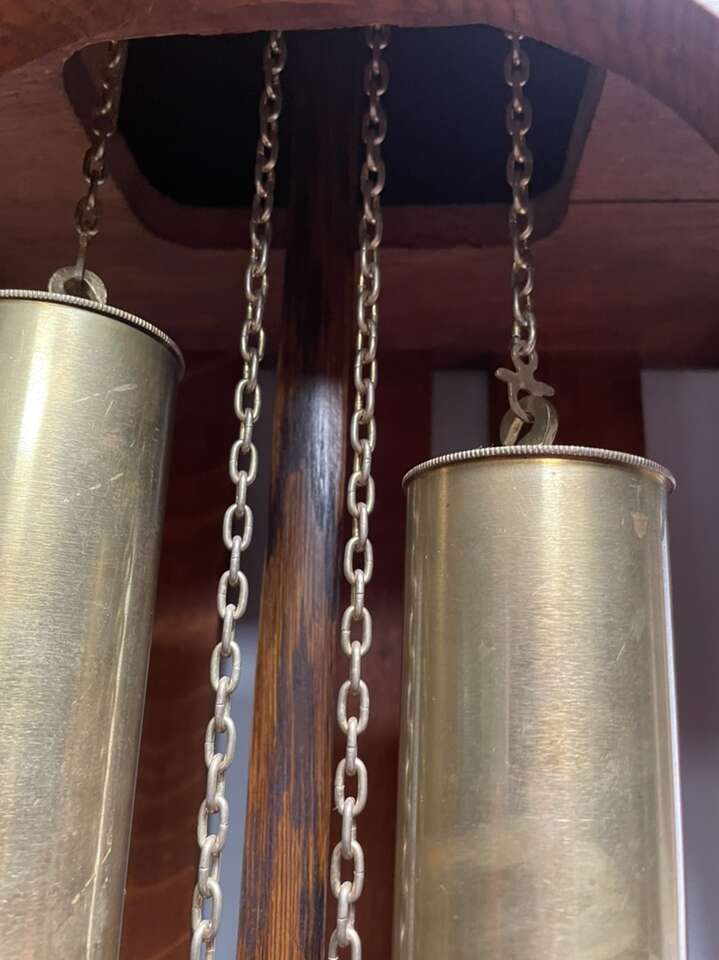 Clock movement manufactured by Josef Kopfer & Sohne GmgH, Furtwangen, with cylindrical brass weights and circular brass pendulum weight. Strikes the hour. Dimensions: 80” tall 20” wide 12” deep Crown 27” wide, 13 ¾” deep Local pick up in Holladay Or, buyer arranges shipping.