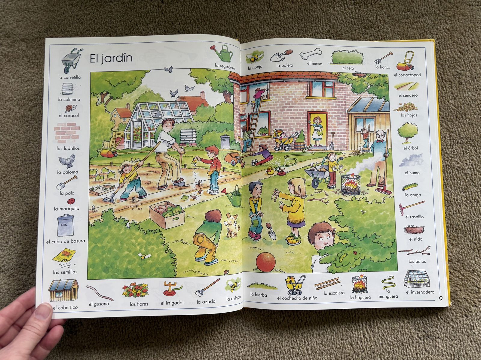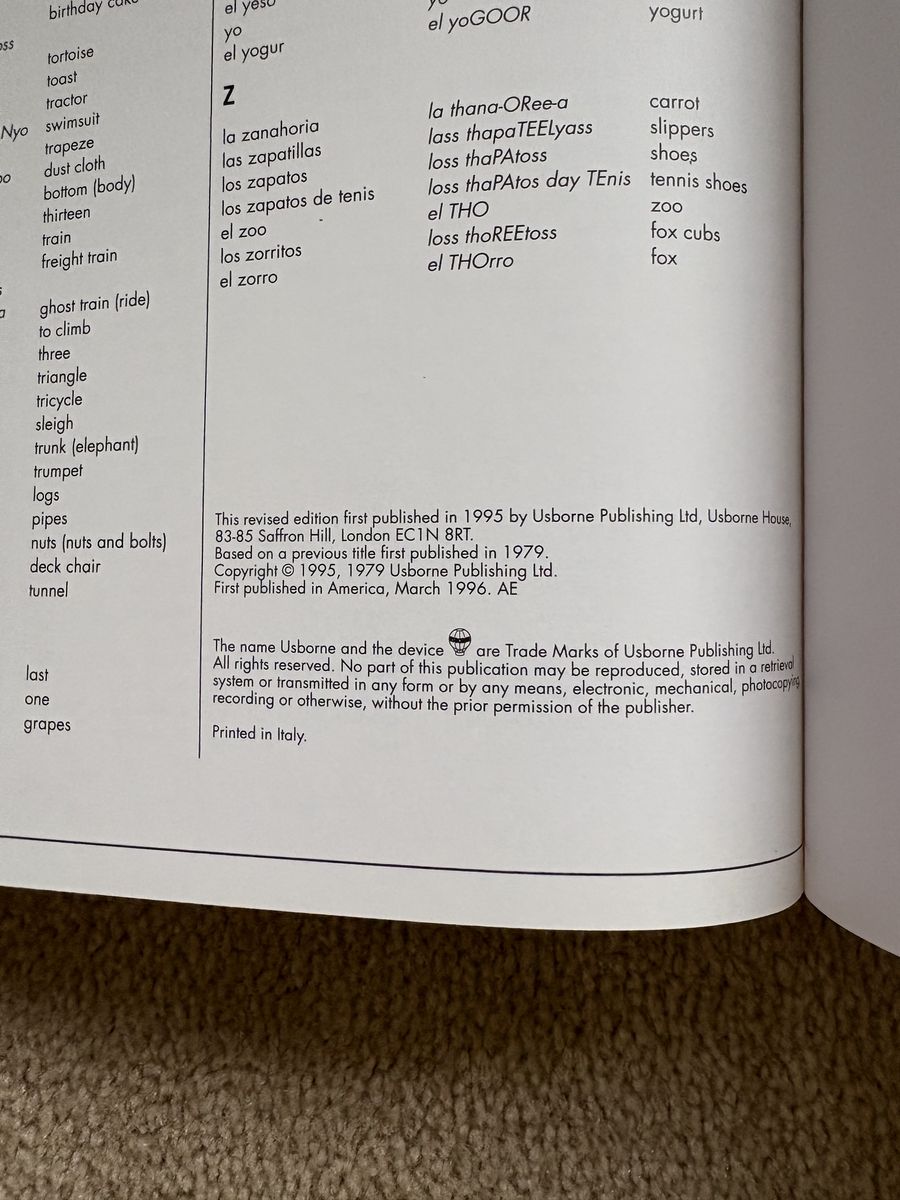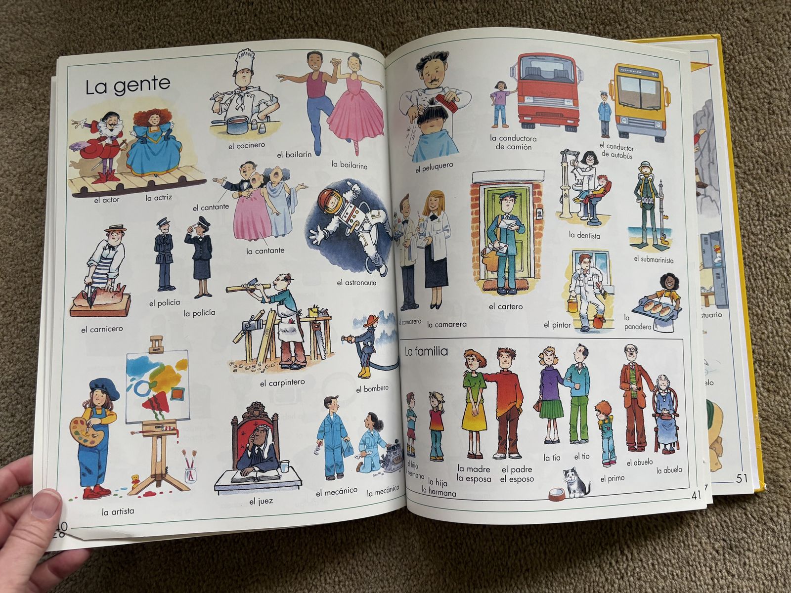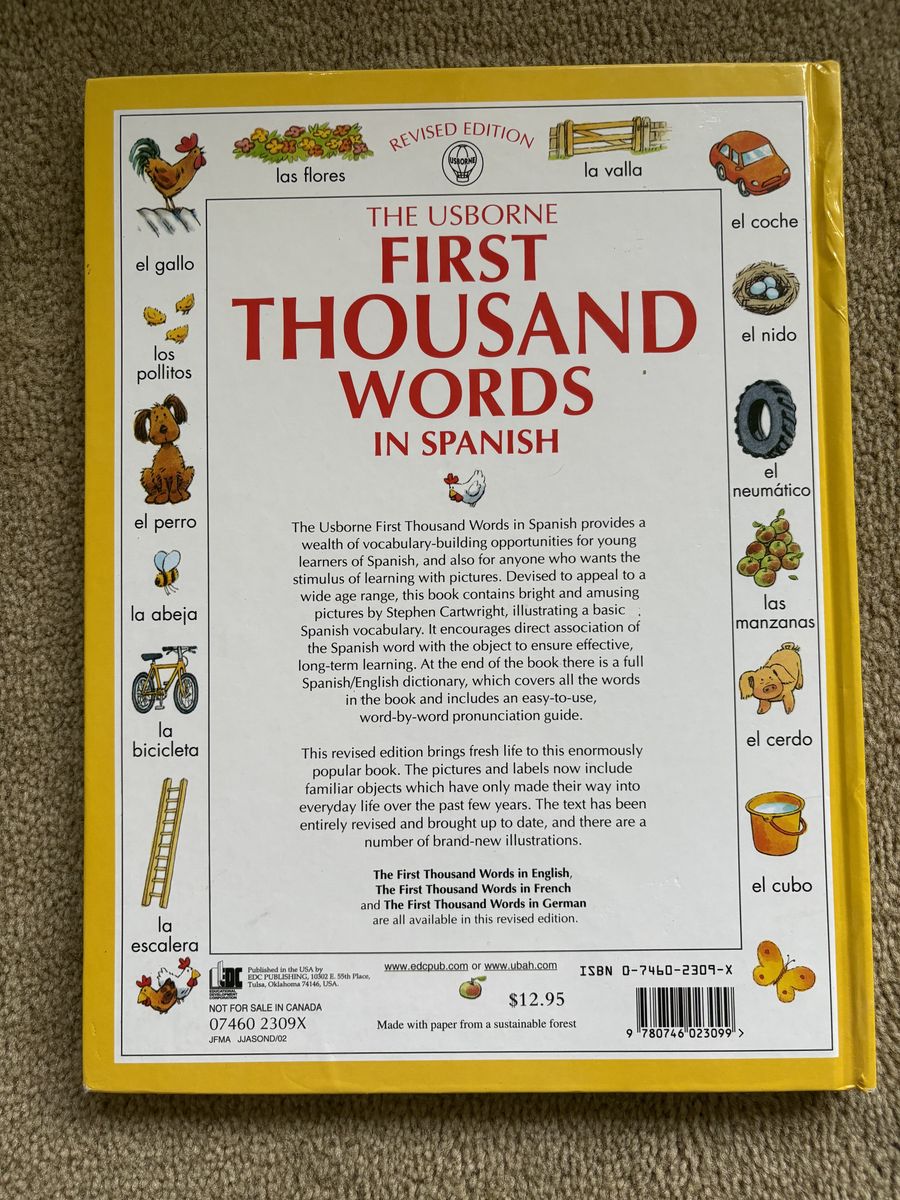 Usborne Internet-Linked First Thousand Words in Spanish, with pronunciation guide. Illustrated by Stephen Cartwright. 1996. Oversized hardback in very good condition. Text only. Cash or Venmo. Discount on multiple items.
