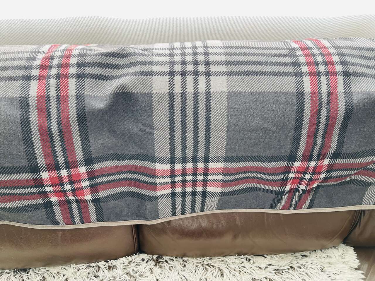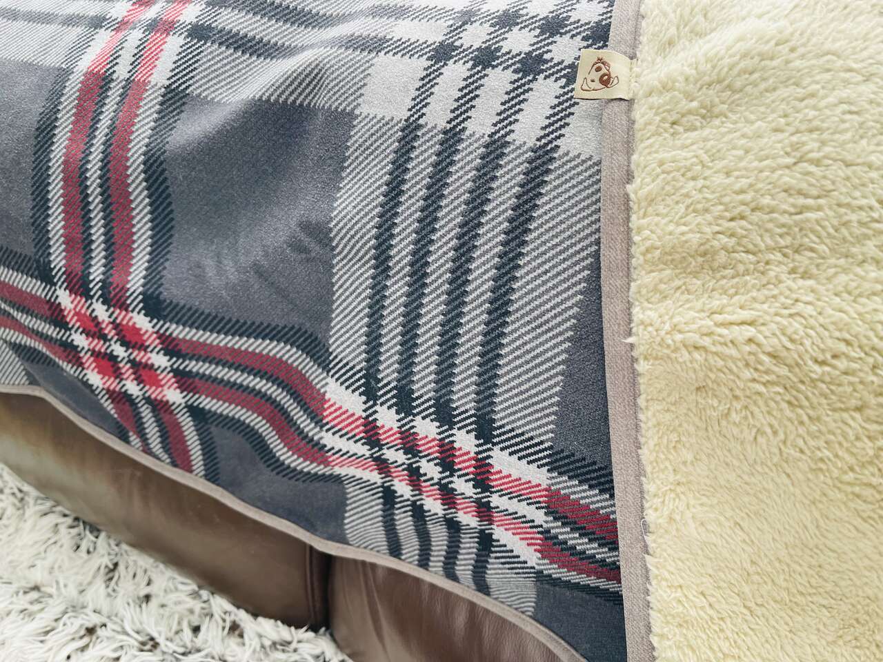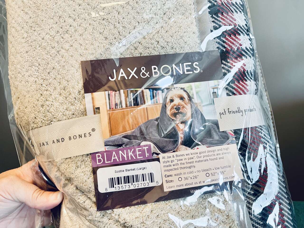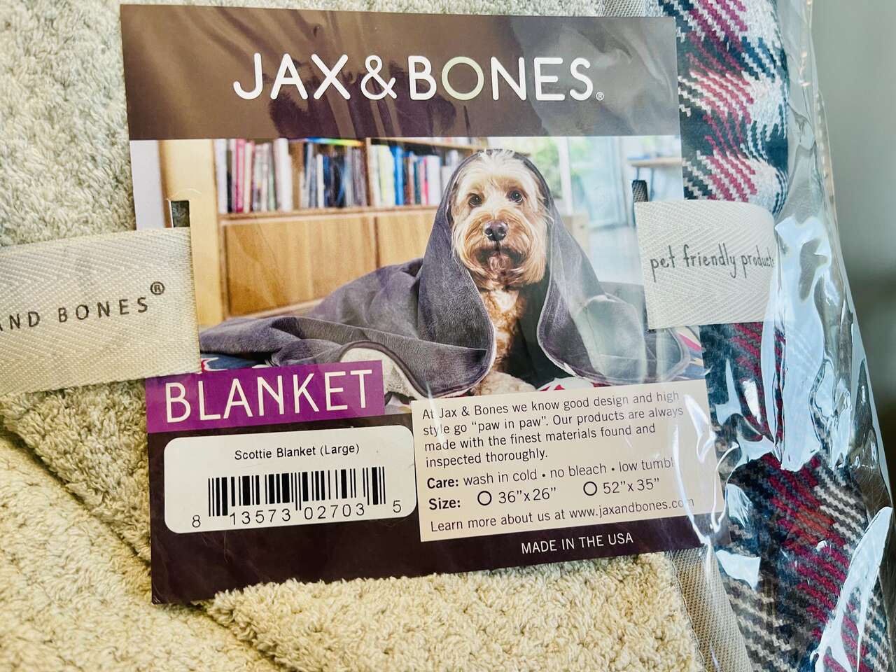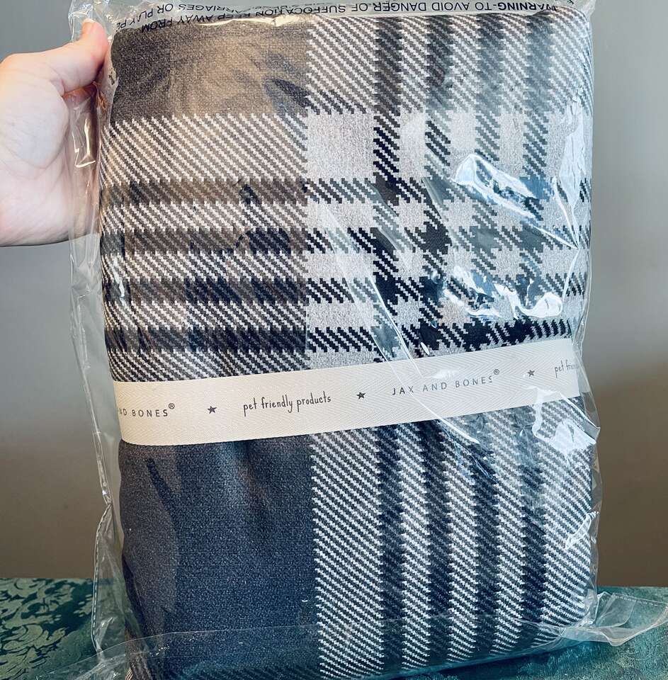 Discontinued rare Luxury double sided durable and soft Jax & Bones Scottie Dog Blanket. 52" x 35" large size. Suitable for dogs up to 70lbs. Durable stylish gray, black, red plaid top side and cloud soft neutral taupe/tan colored Sherpa underside. Machine washable.