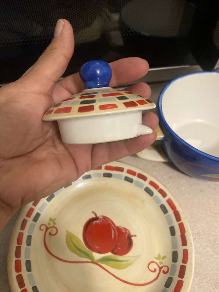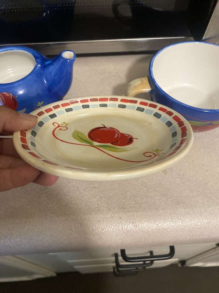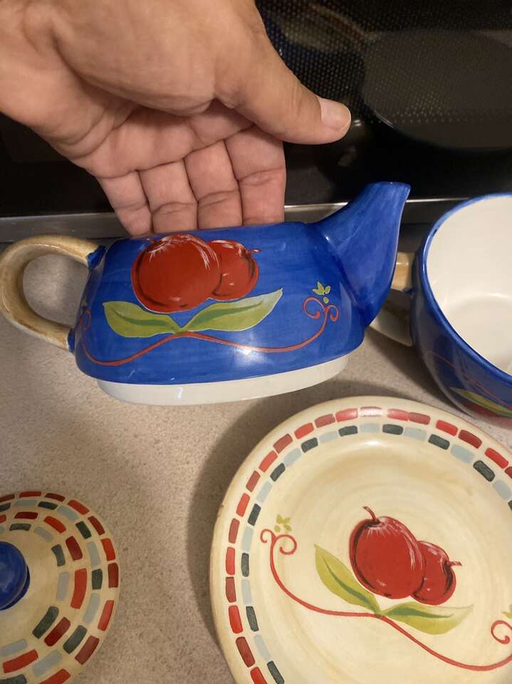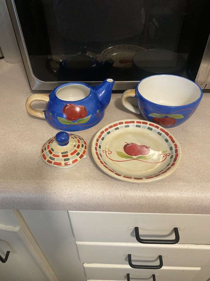 FINAL SALE/Sweet older tea set to add to your collection. No chips or cracks or discoloration. Can be used as a one serving. Color’s blue, red , green and beige.