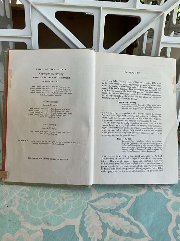 “Sportsmanlike Driving”, updated for 1955, is an educational class book on all aspects of learning to drive and owning a car. Originally in the Granger Senior High library. Somewhat outdated but still relevant information. This book has been heavily used and abused but is a fun memento of the past prior to today’s hectic driving.