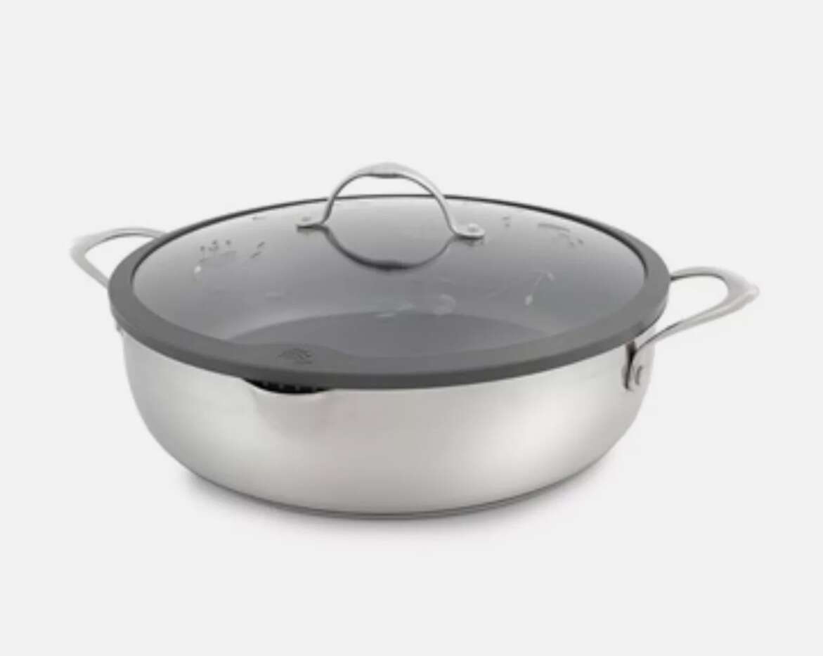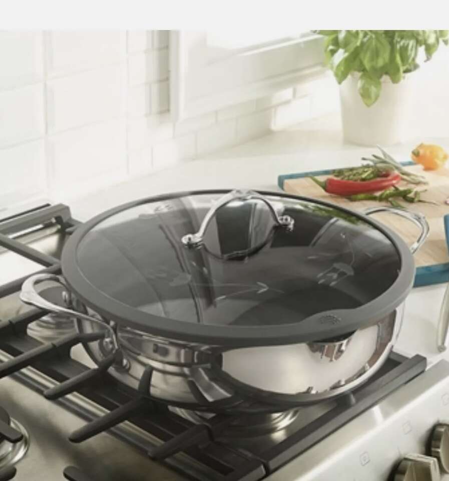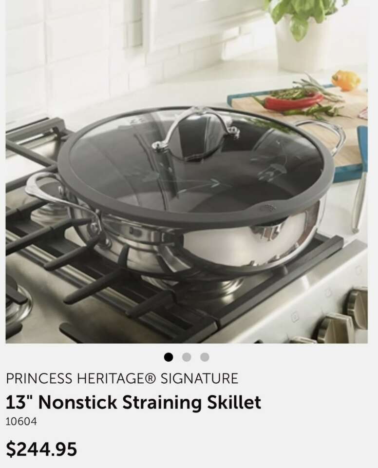 Product Description Our Signature cookware offers the perfect combination of sleek design and modern function. The spouted sides and straining feature on this large skillet allow for easy draining of fats or liquids from cooked foods. It's perfect for preparing ground beef for tacos or shaved steak for fajitas with less fat thanks to the PFOA-free nonstick surface. Features ergonomic, riveted handles along with vented tempered glass lids cut with our exclusive design and rimmed in a wide band of stainless steel. Encapsulated construction with a single layer of 18/10 stainless steel in the cookware body provides corrosion resistance, and a 5mm aluminum disc encased in a magnetic stainless steel base allows for even heat distribution and prevents hot spots.