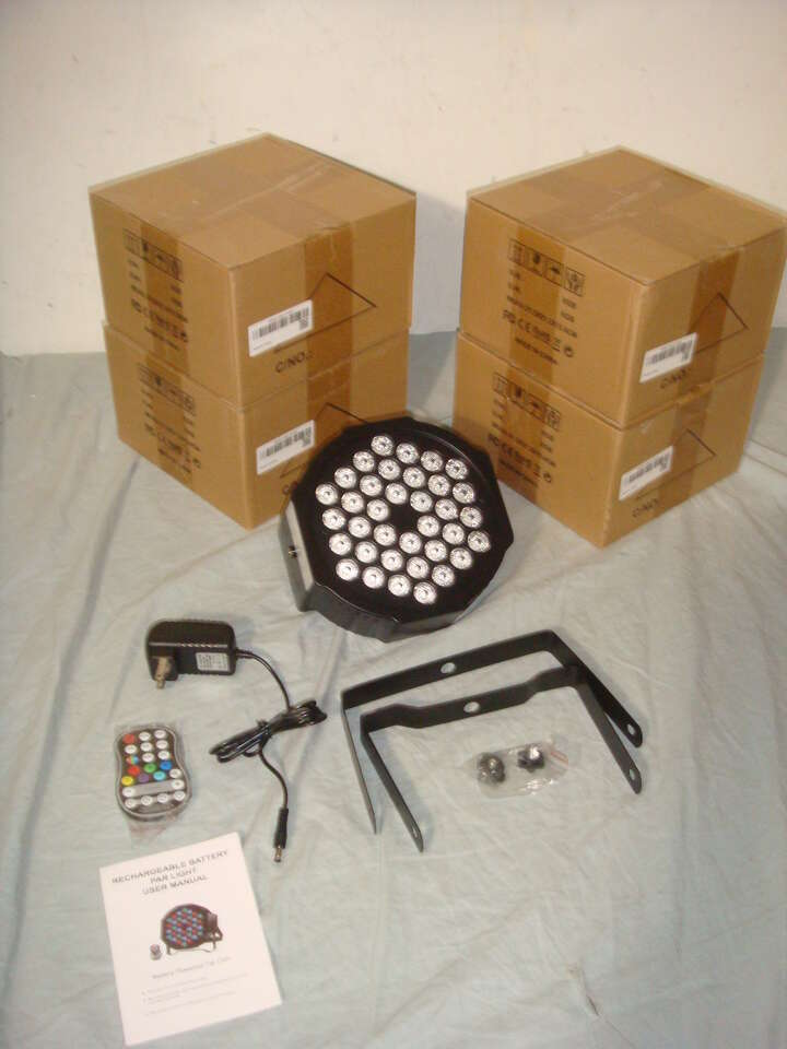 LOT OF 4 U'KING 36 RGB LED RECHARGEABLE STAGE PAR WIRELESS LIGHTS DMX OR REMOTE CONTROL. These are brand new, never used. It comes with everything shown. These are normally $60 each, making this lot worth $240. This is your chance to save big-time so don't miss out!!