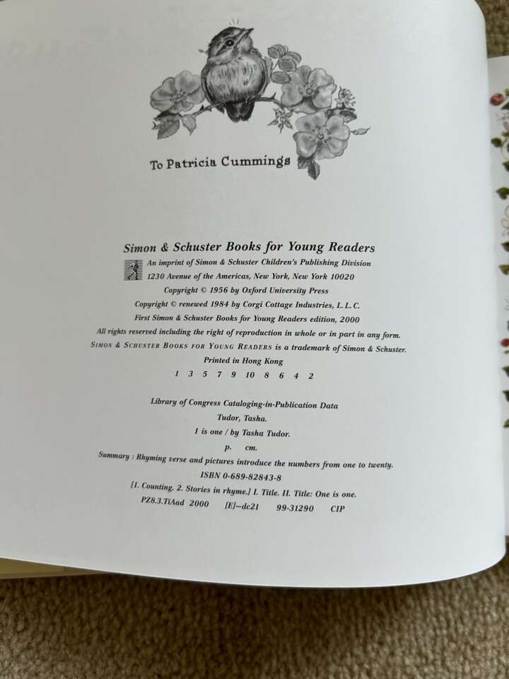 1 is One, by Tasha Tudor. Classic children’s book first published in 1956, this edition 2000. Beautiful illustrations, Caldecott Honor Book. Hardcover in very good condition, including dust jacket. Text only. Cash or Venmo.