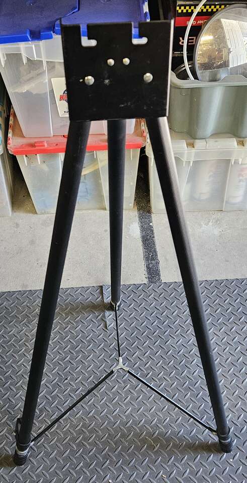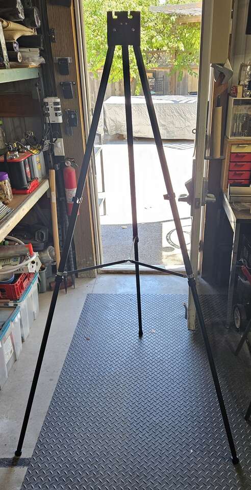 VenmoEasel Adjustable Aluminum Tripod 34" to 74" High Like New Black and very easy to use and sturdier than most. Can be adjusted up or down, titled (leaned back) or straight, can hang or support anything you can put on an easel. There are leg supports for setting a picture, etc on that can be adjusted up and down the legs, there is an adapter plate at the top that apparently was designed to support some pretty heavy loads but would work great for anything that needs a hole for hanging. All three legs adjust and lock as they should. Folded up it is very small so it could be shipped for $20.
