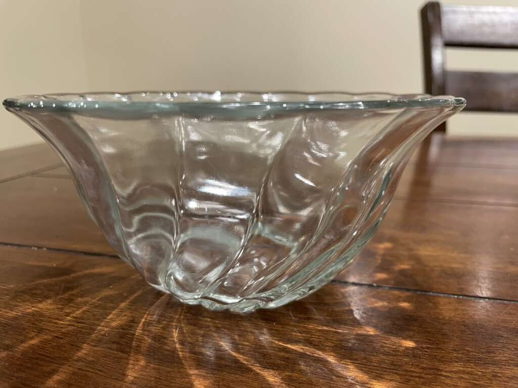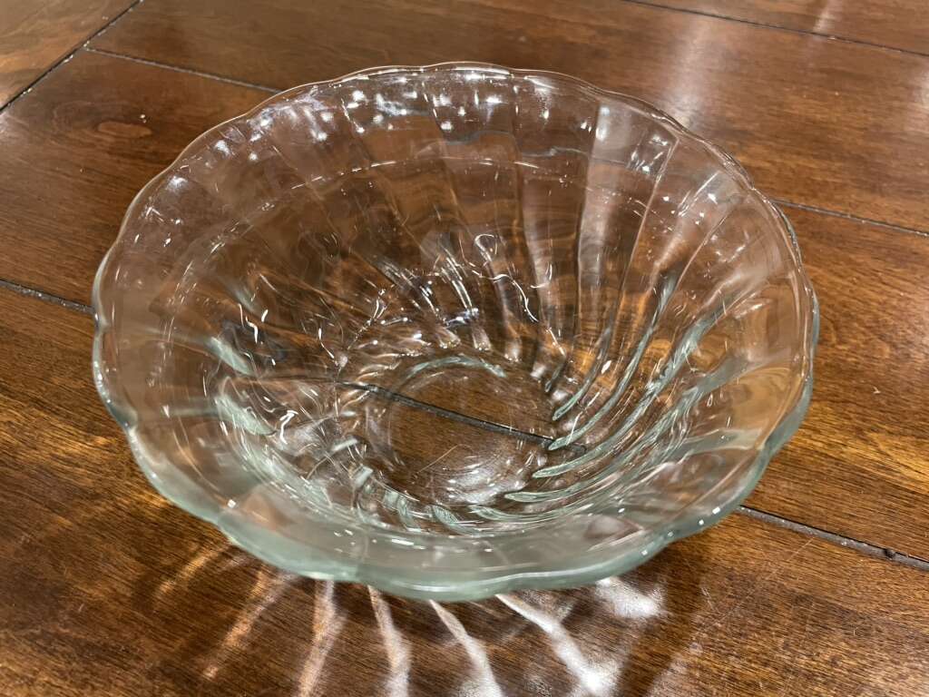I have a small vintage glass bowl with a swirl pattern and a scalloped edge. It is about 6 1/2 inches across and just over 3 inches tall. See my other ads for jewelry, artwork, home decor and more.