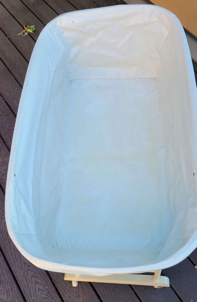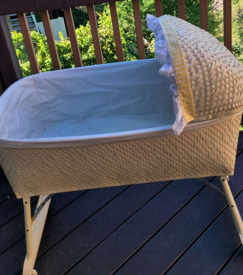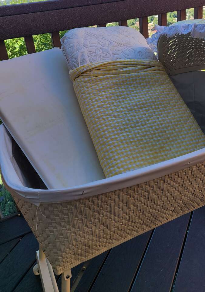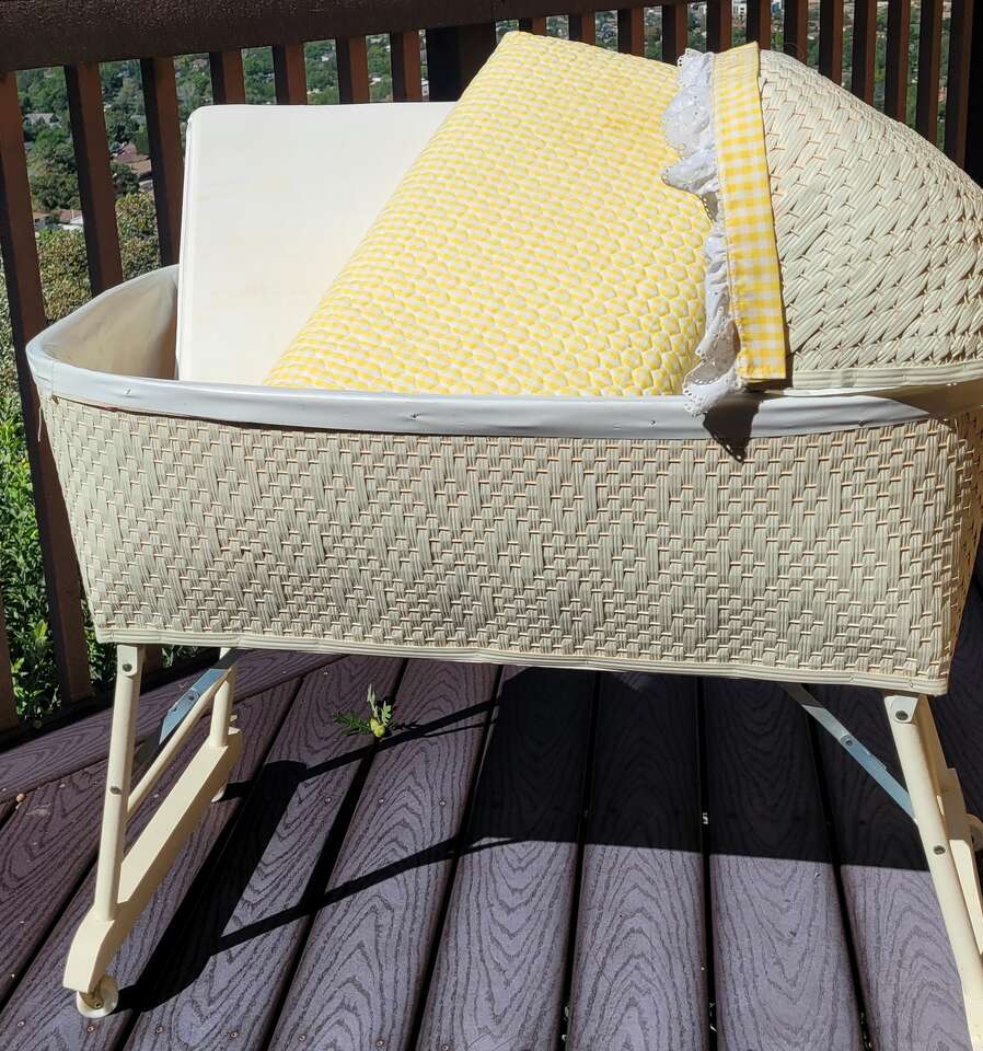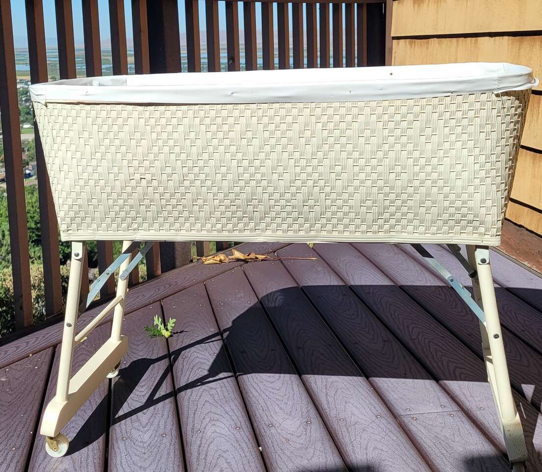 VenmoVintage bassinett is complete with canopy and 2 matress/pads. It is a product of the Badger Basket Company from Edgar, Wisc. which is still in business today. Please look at all the pictures and message me with any questions.