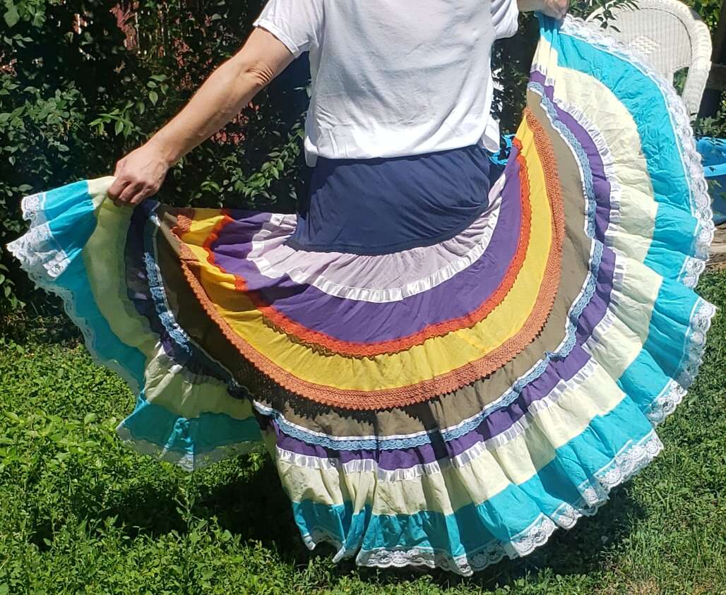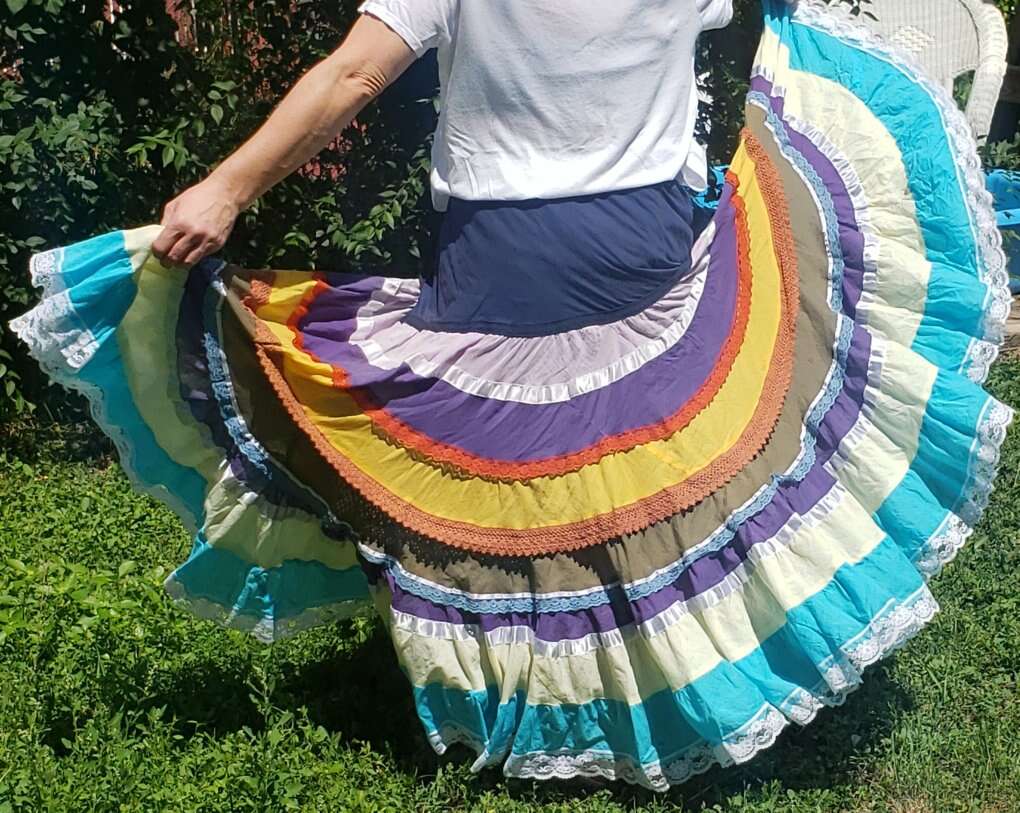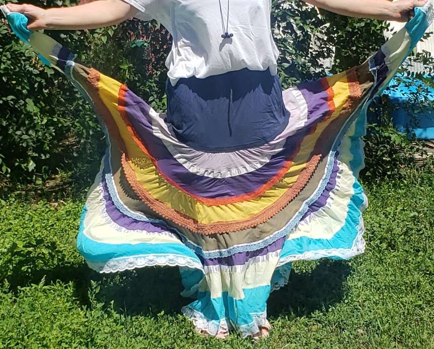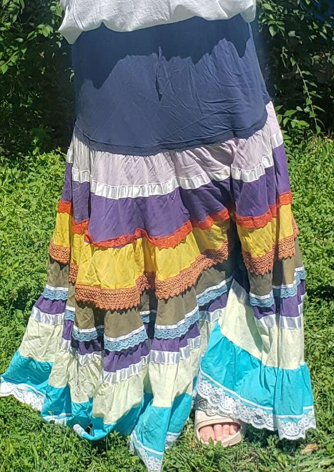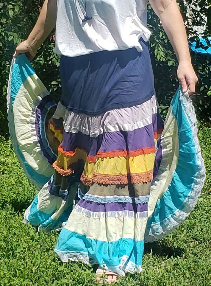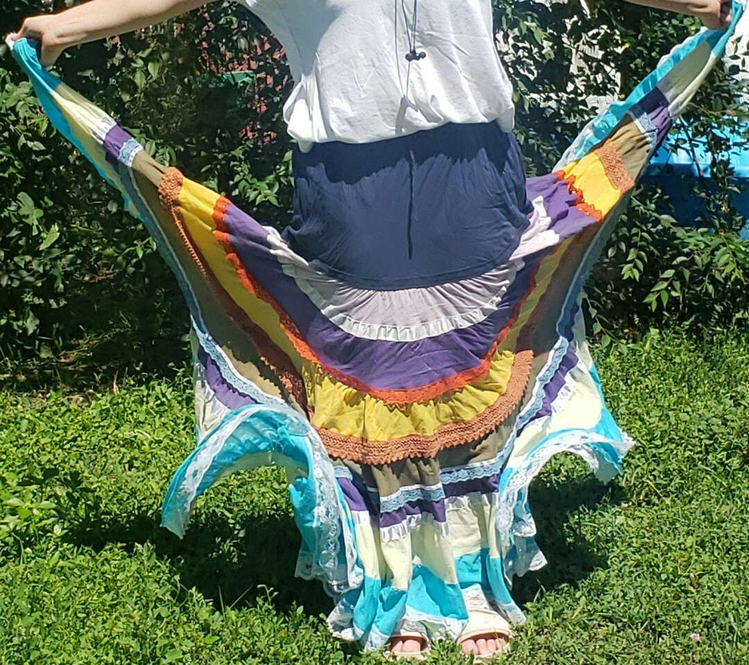 TWIRL DANCE RAINBOW BOHO HIPPIE GEETA SKIRT Medium I don't see a size but I'd call this a medium to large, with a very flexible waist band 13" across waist (So waist would be about 26-27?) Elastic stretches another 4-5 inches easily 37" long Don't mind the long bunchy t shirt that you can see tucked into the back🤠Awesome for twirling and dancing! (801)472-2627