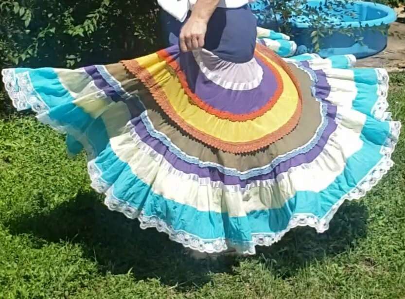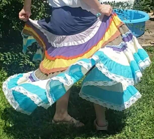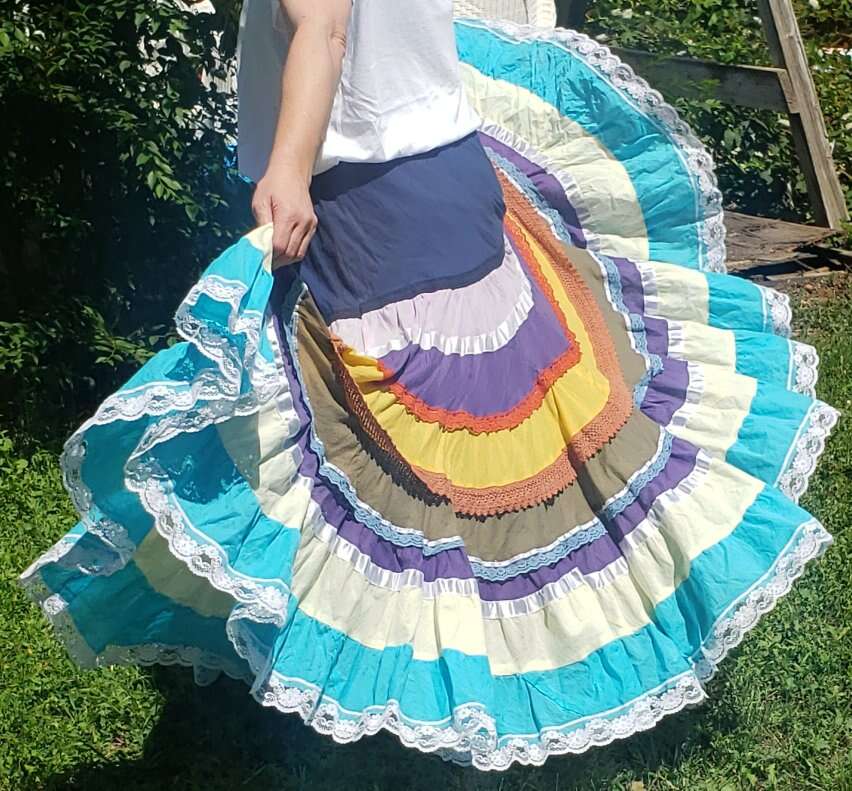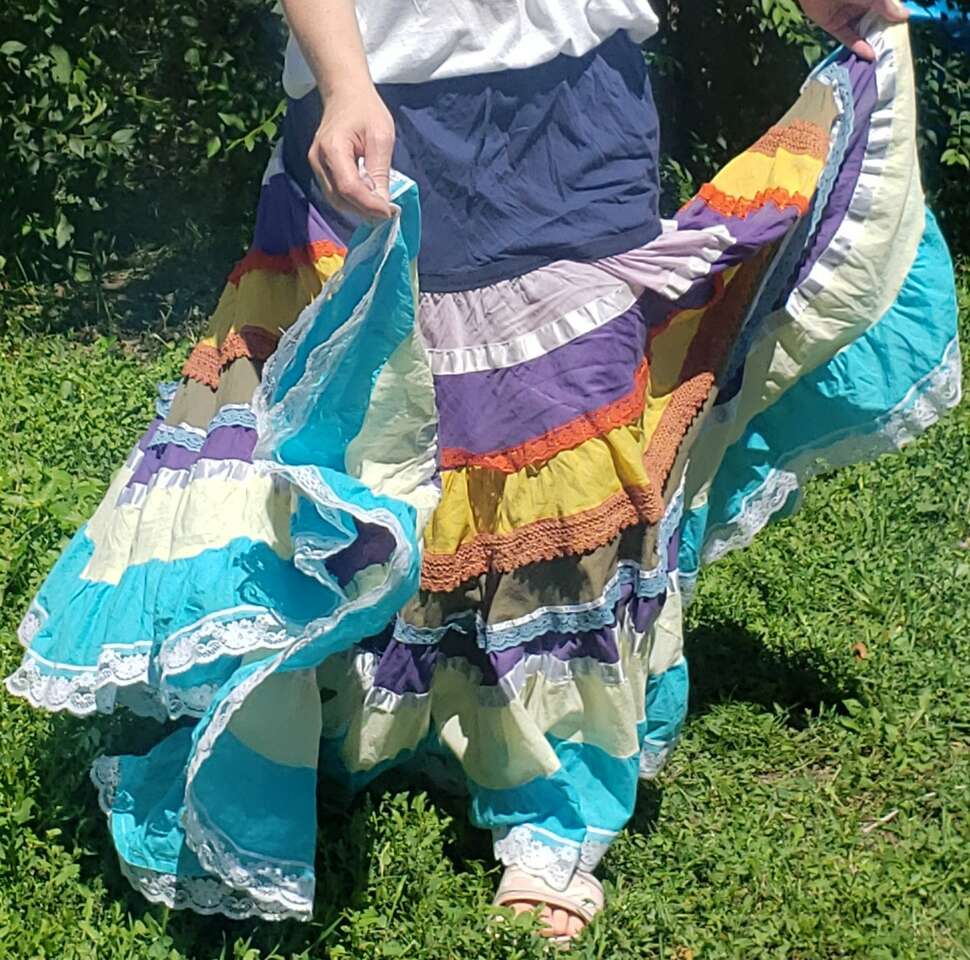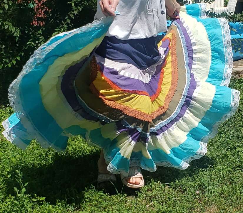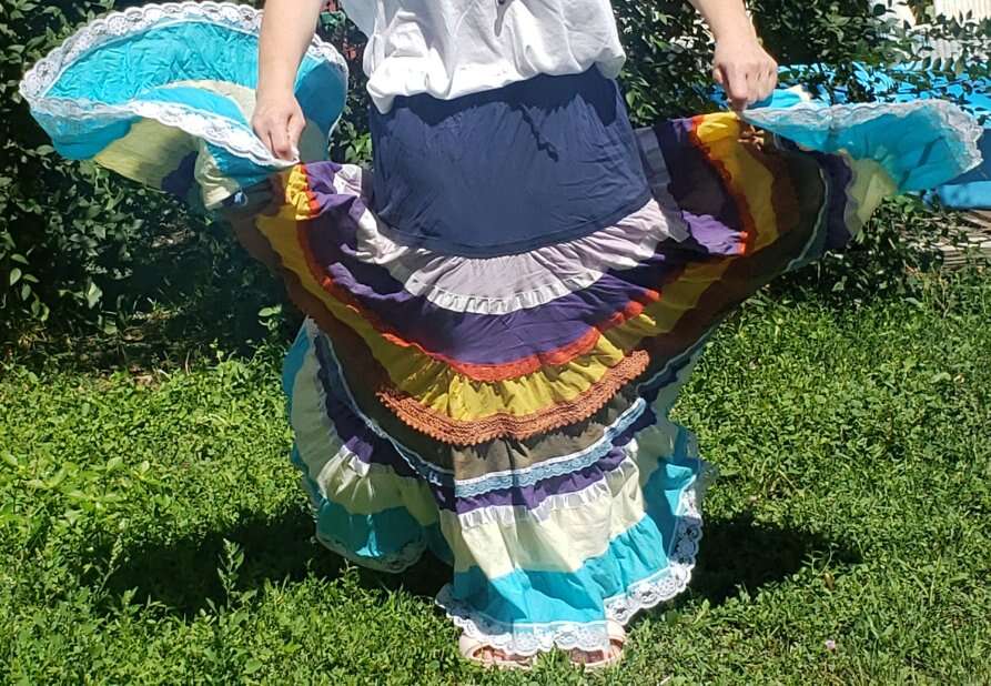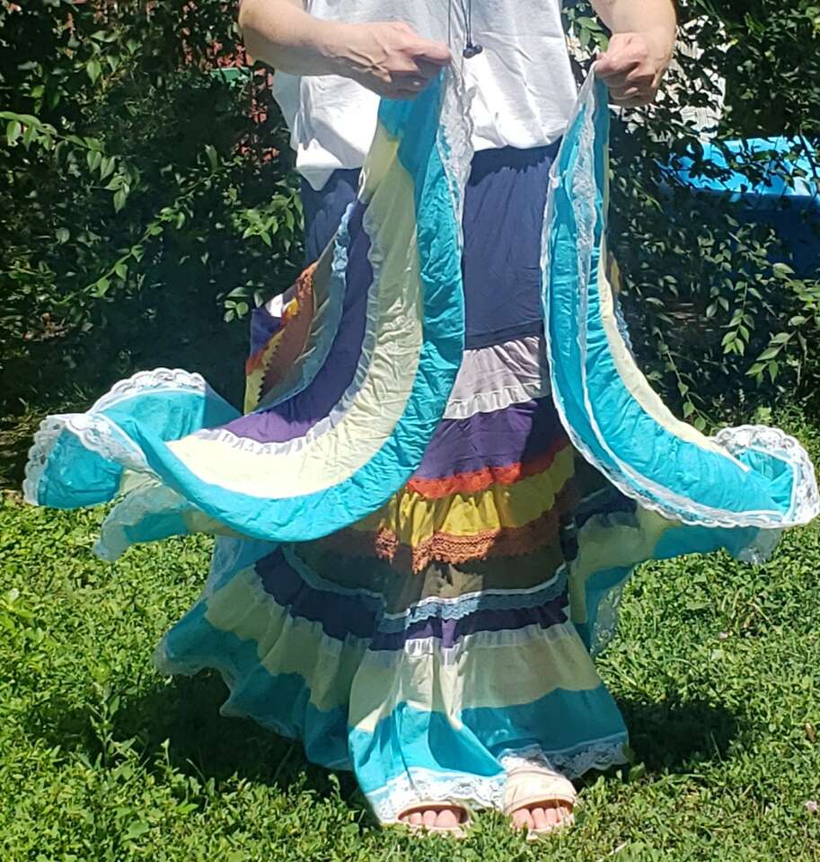 TWIRL DANCE RAINBOW BOHO HIPPIE GEETA SKIRT Medium I don't see a size but I'd call this a medium to large, with a very flexible waist band 13" across waist (So waist would be about 26-27?) Elastic stretches another 4-5 inches easily 37" long Don't mind the long bunchy t shirt that you can see tucked into the back🤠Awesome for twirling and dancing! (801)472-2627