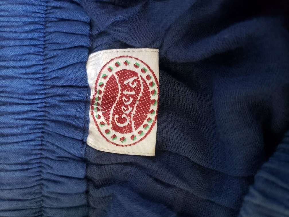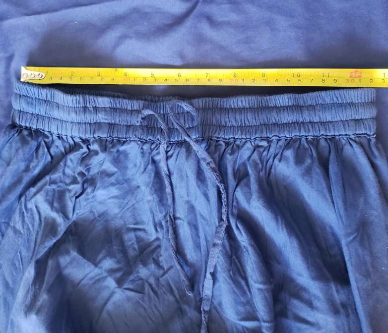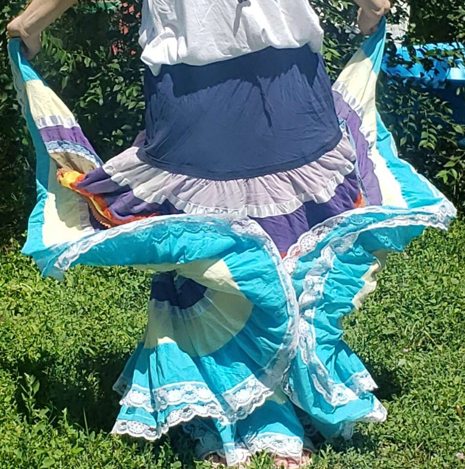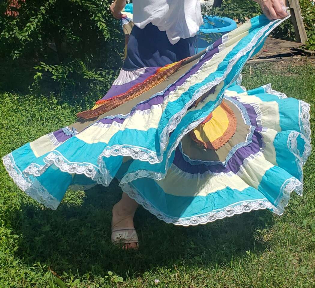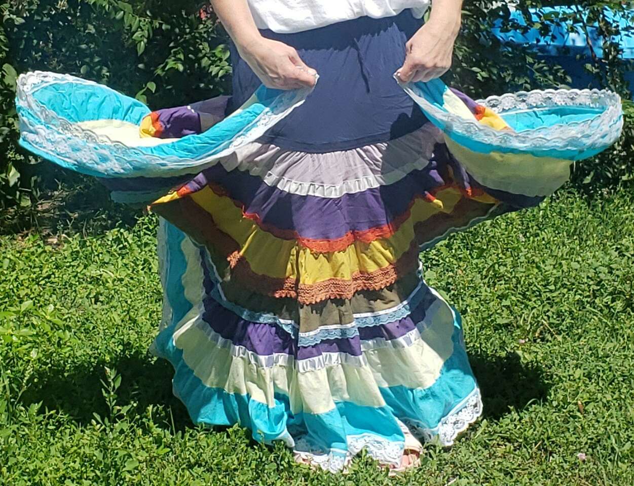 TWIRL DANCE RAINBOW BOHO HIPPIE GEETA SKIRT Medium I don't see a size but I'd call this a medium to large, with a very flexible waist band 13" across waist (So waist would be about 26-27?) Elastic stretches another 4-5 inches easily 37" long Don't mind the long bunchy t shirt that you can see tucked into the back🤠Awesome for twirling and dancing! (801)472-2627