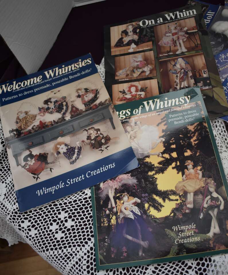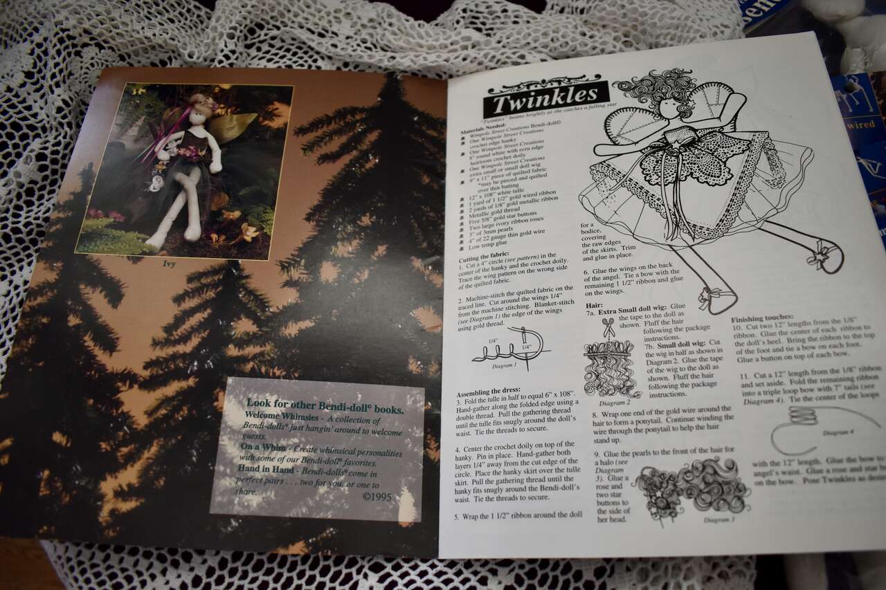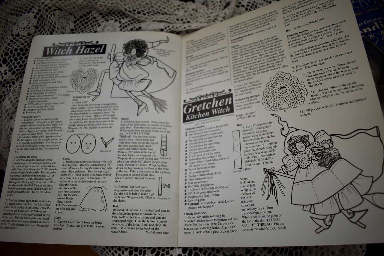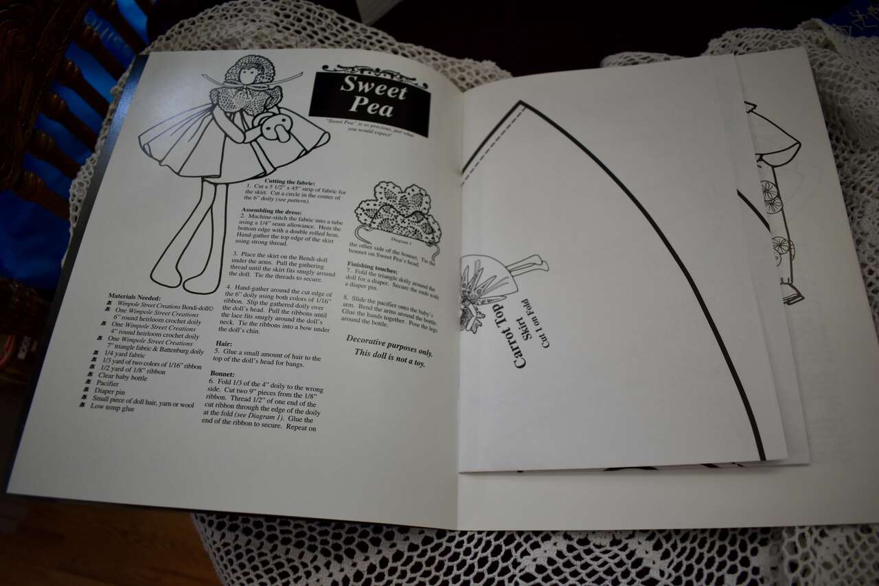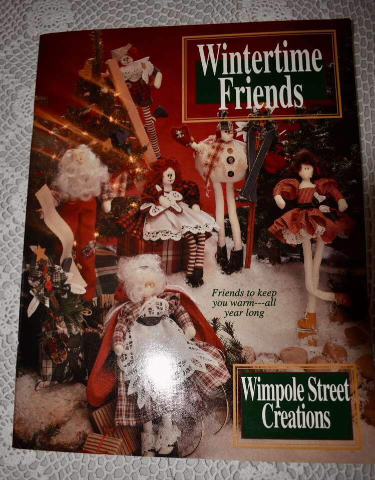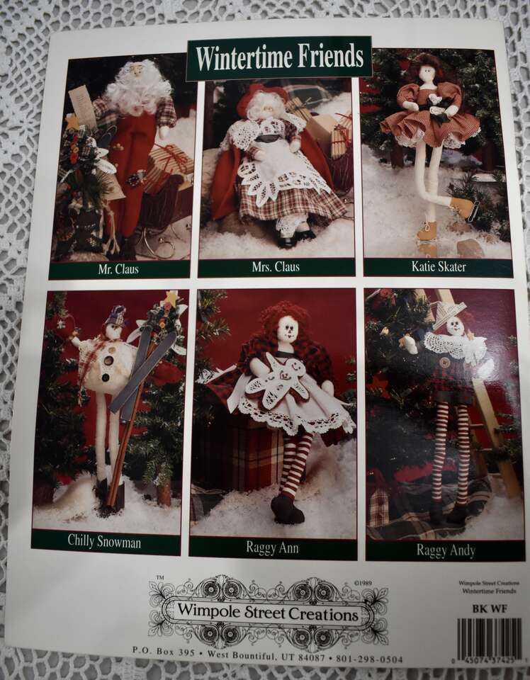 We Also Have The Booklet that is called Wintertime Friends By Wimpole Street Creations.- Friends to keep you warm — all year long!!! It has patterns and instructions for the clothes for Mr.. Claus, Mrs. Claus, Katie Skater, Chilly Snowman, Raggedy Ann, And Raggedy Andy. They all are used with the Wimpole Street Creations BEndi- doll and other fun things like crochet Doilies and other fun fabrics and more…