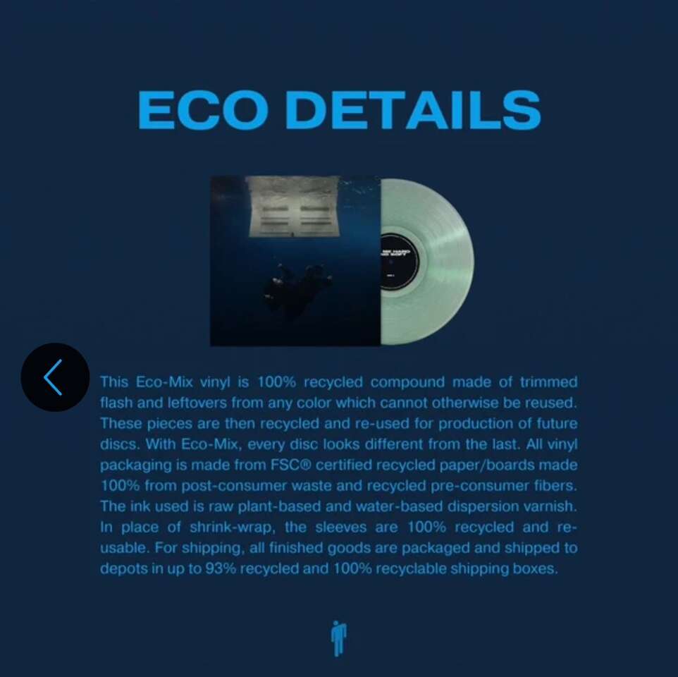 Eco Details: This Eco-Mix vinyl is 100% recycled compound made of trimmed flash and leftovers from any color which cannot otherwise be reused. These pieces are then recycled and re-used for production of future discs. With Eco-Mix, every disc looks different from the last. All vinyl packaging is made from FSC® certified recycled paper/boards made 100% from post-consumer waste and recycled pre-consumer fibers. The ink used is raw plant-based and water-based dispersion varnish. In place of shrink-wrap, the sleeves are 100% recycled and re-usable. For shipping, all finished goods are packaged and shipped to depots in up to 93% recycled and 100% recyclable shipping boxes.