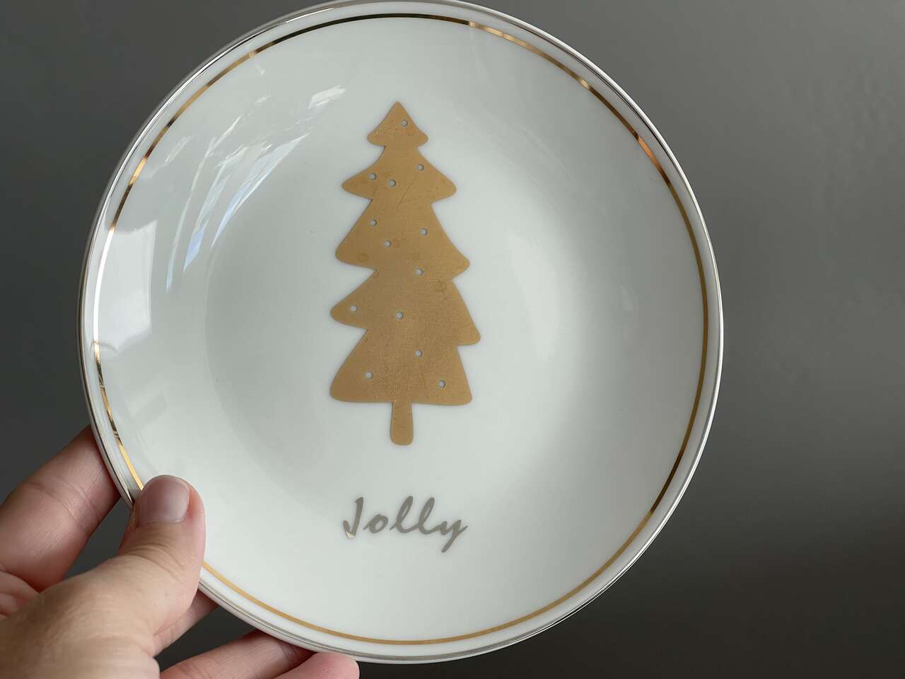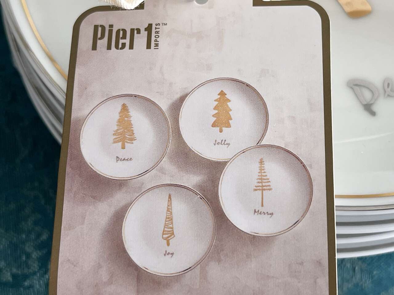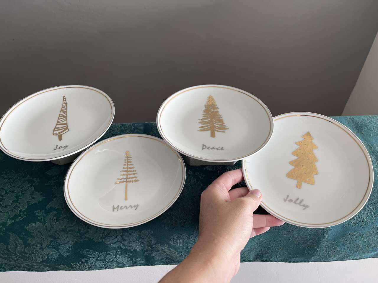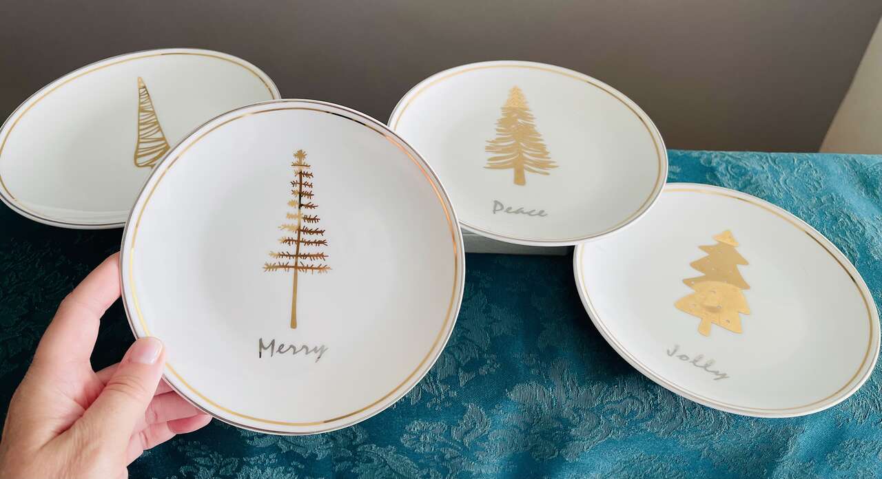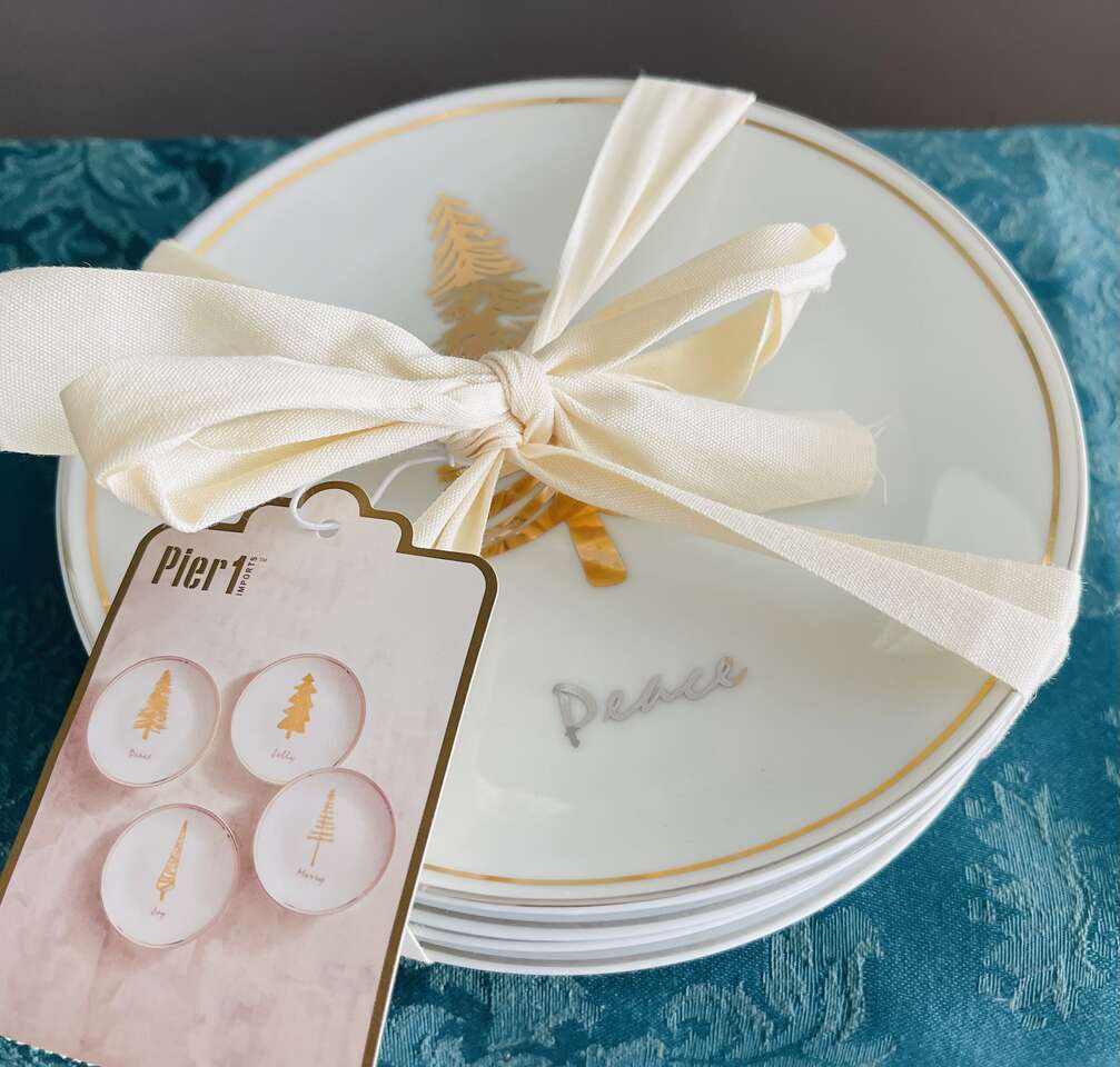 Beautiful festive Pier 1 set of 4 Christmas tree appetizer/dessert plates. White porcelain w/ 4 different gold Christmas Evergreen Tree designs w/ the words Joy, Peace, Jolly, Merry in silver below each tree design. 6" diameter. Dishwasher safe. Not for microwave.