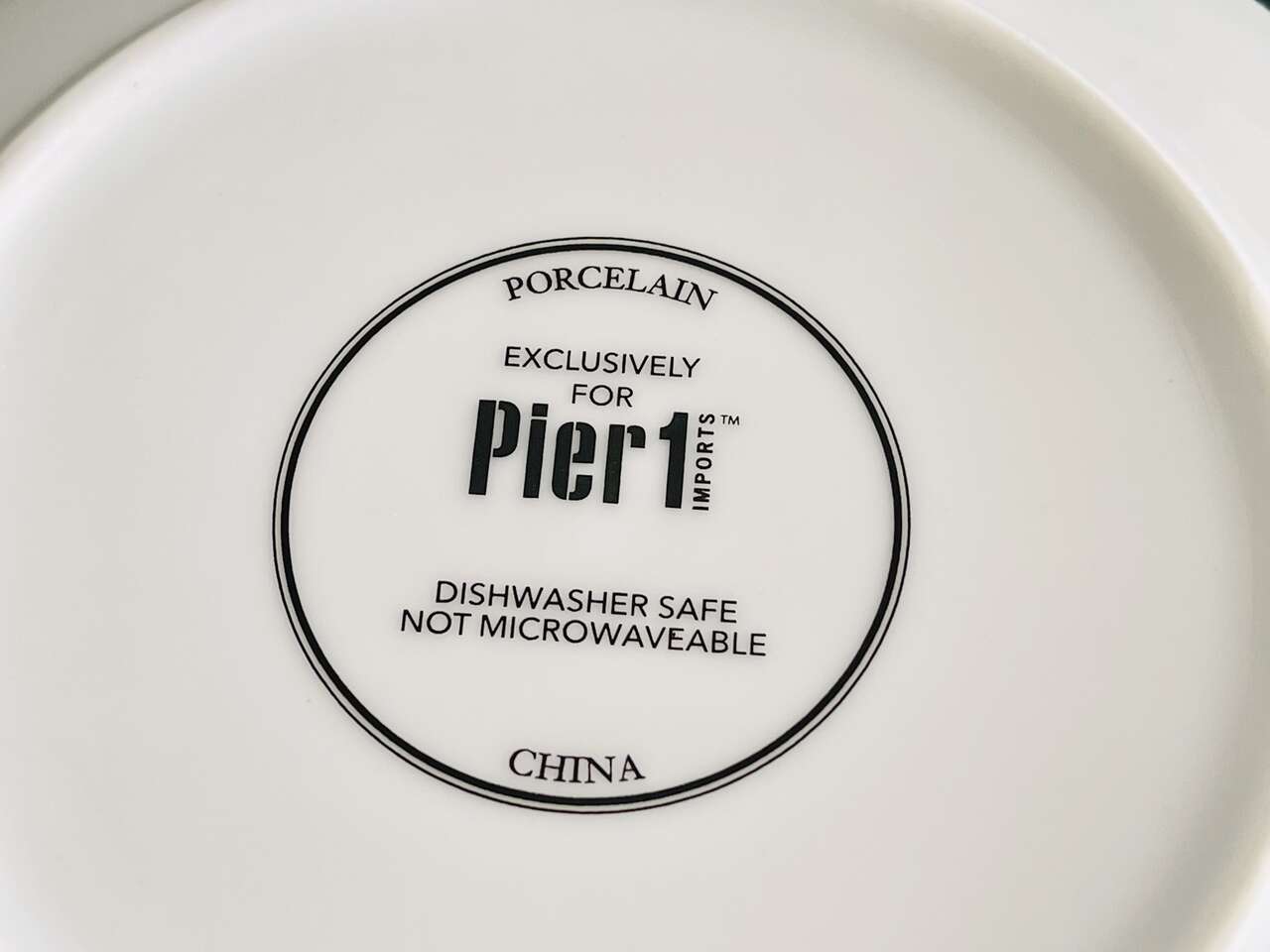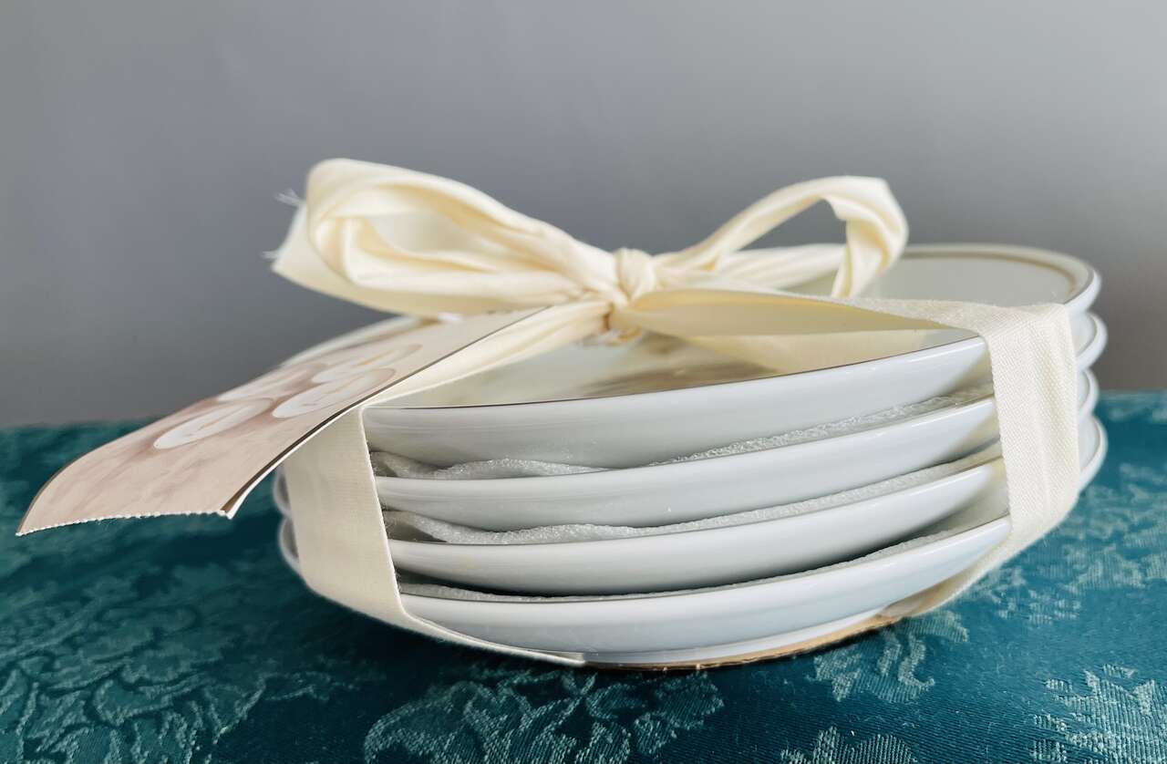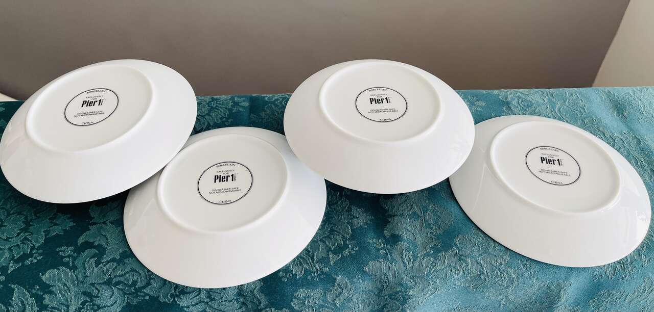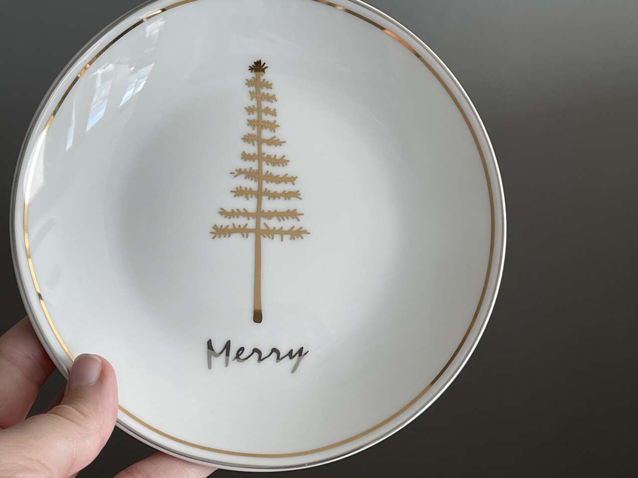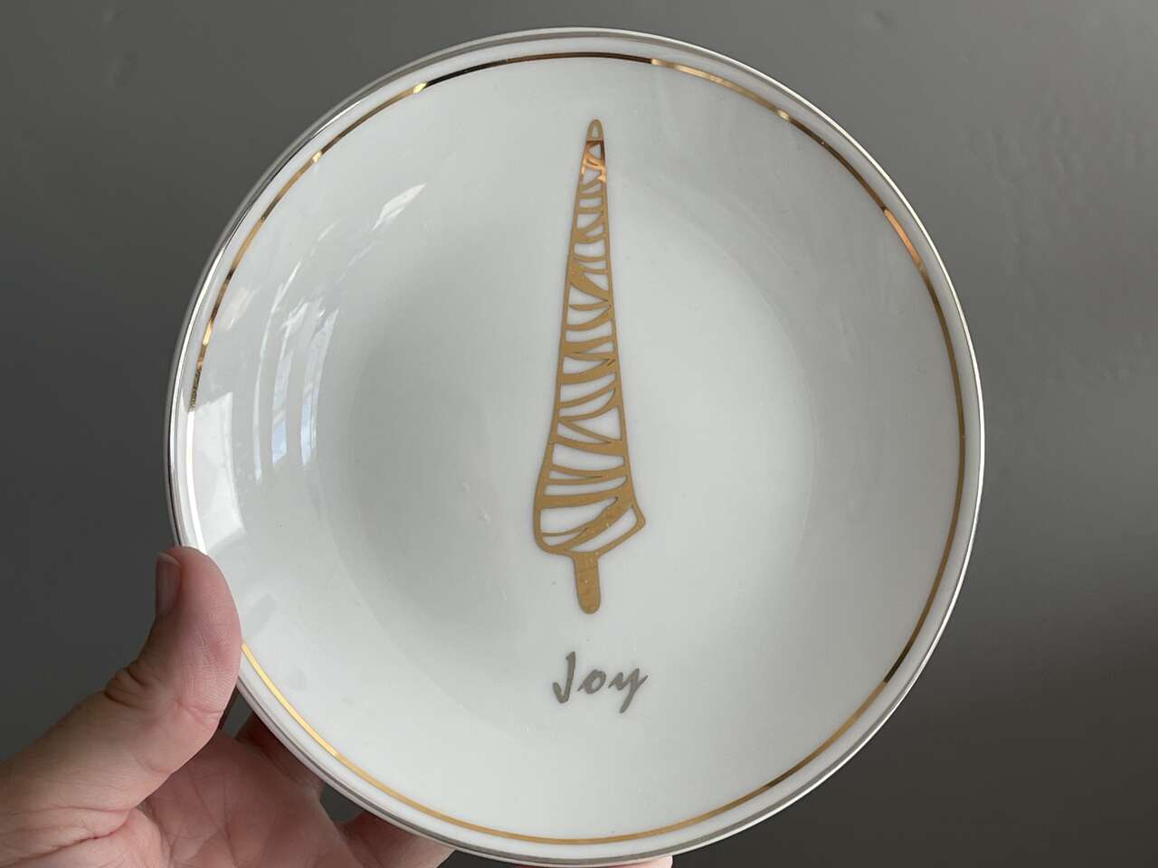 Beautiful festive Pier 1 set of 4 Christmas tree appetizer/dessert plates. White porcelain w/ 4 different gold Christmas Evergreen Tree designs w/ the words Joy, Peace, Jolly, Merry in silver below each tree design. 6" diameter. Dishwasher safe. Not for microwave.
