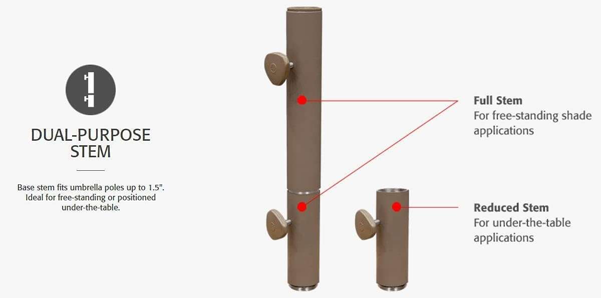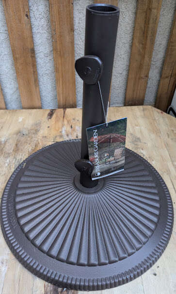 Brand Treasure Garden Care Color Bronze Specific Uses For Product Rain/Sun Recommended Uses For Product Patio, Table About this item Classic Style 50 LB Cast Iron Base in Bronze finish. Dual Purpose Stem for both Table and free standing use 19.3 Inch Diameter provides sturdy and stable footprint Patented: Optional 30 LB Add-On weight Available (BW30). For Use with standard 1 ½ Inch Diameter umbrella Poles.