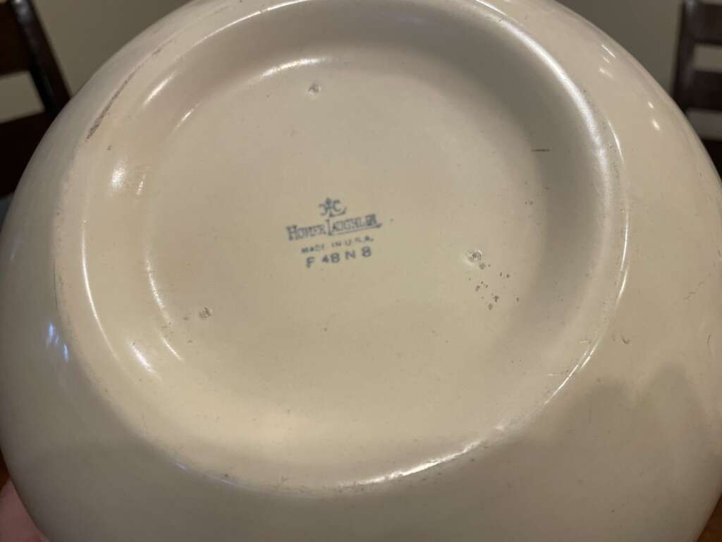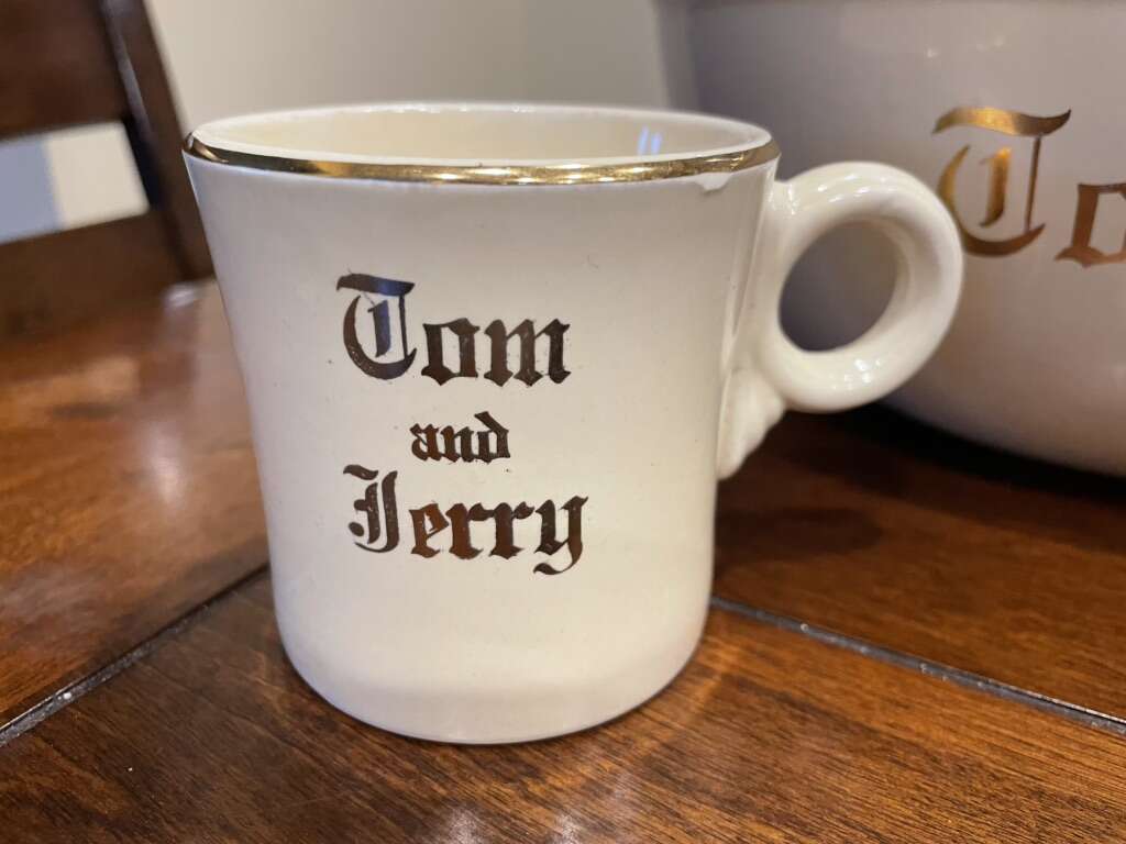 I have a Tom & Jerry punch bowl and 2 cups from the 1940s. The bottom is marked Homer Laughlin. They are cream colored with gold letters and trim. The gold has rubbed thin in a couple of spots along the edges. The bowl is 9 3/4 inches across and just over 4 inches tall. The cups are 3 inches tall. See my other ads for jewelry, artwork, home decor and more.