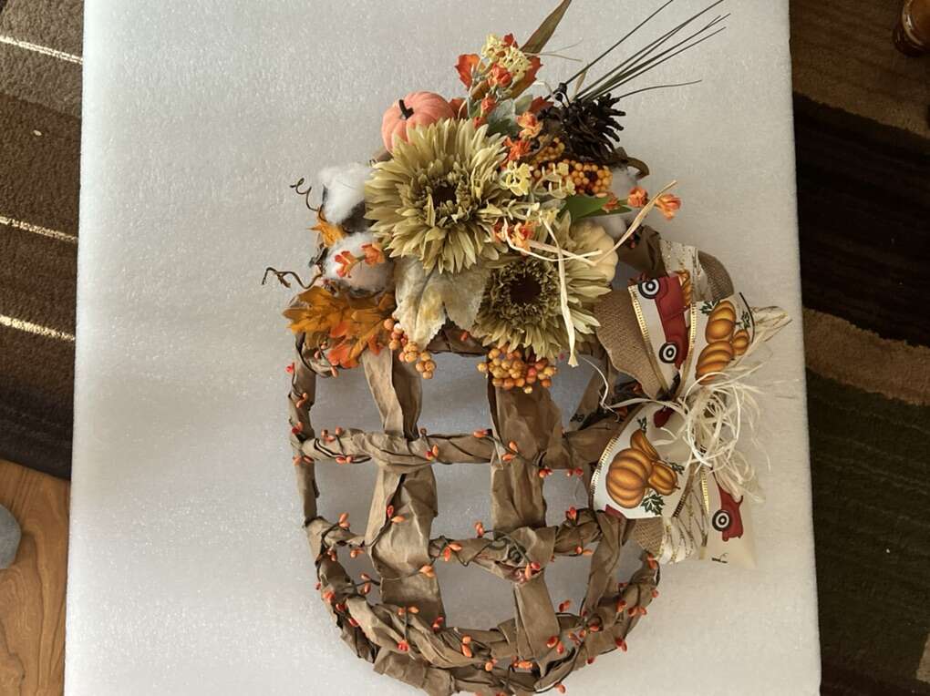 PayPalThis is a handmade wreath it is hand made from a wire pumpkin one paper grocery sack florals hot glue and diligence it turned out very cute. Questions please text.