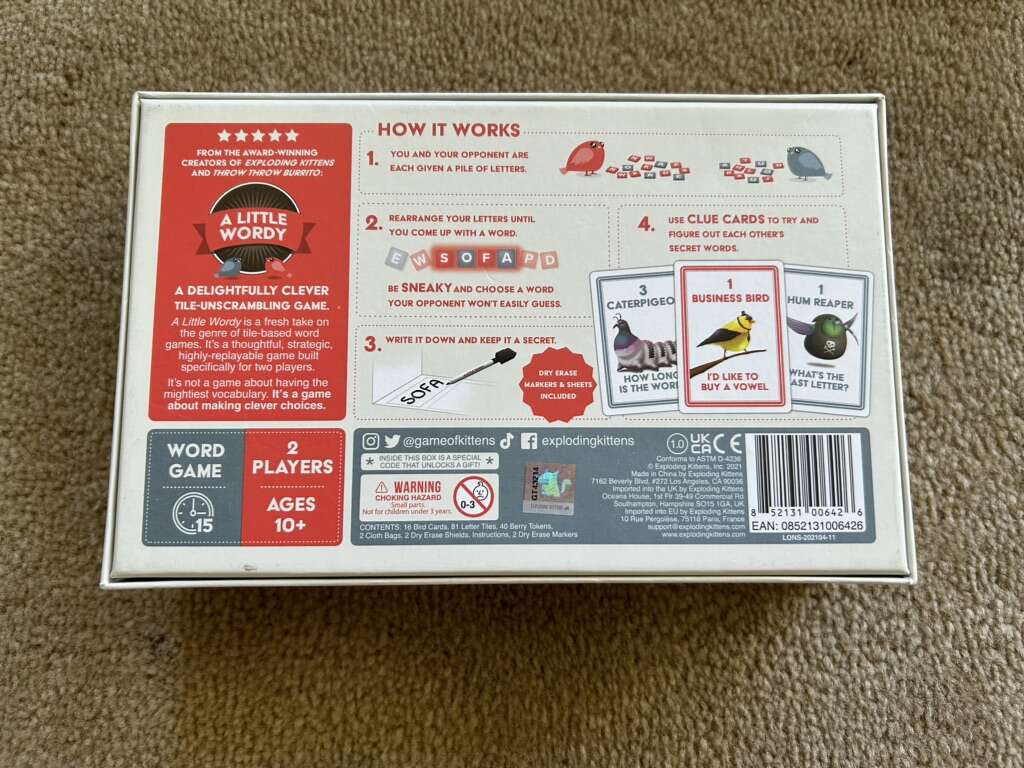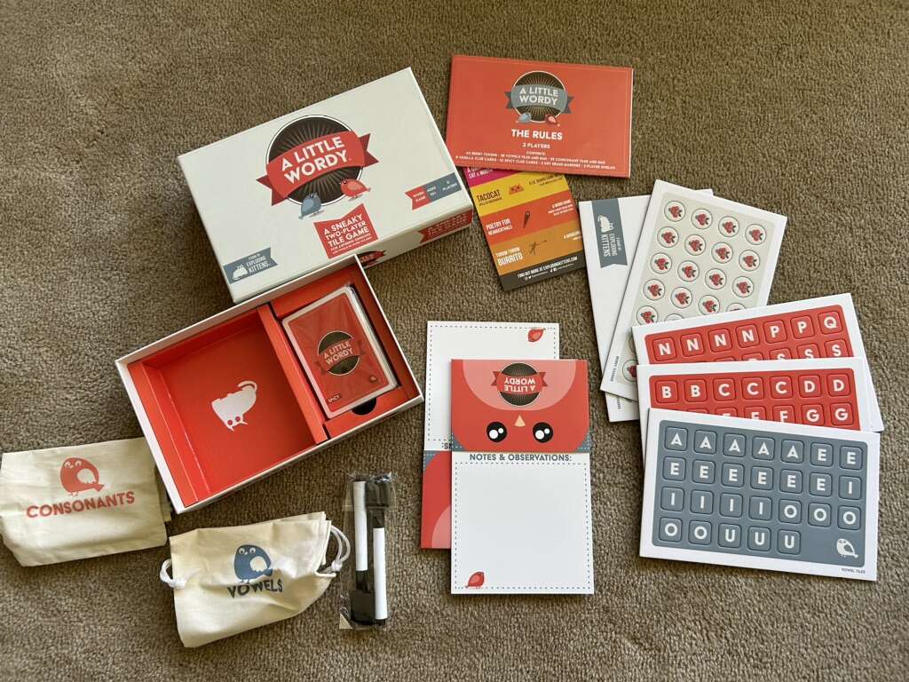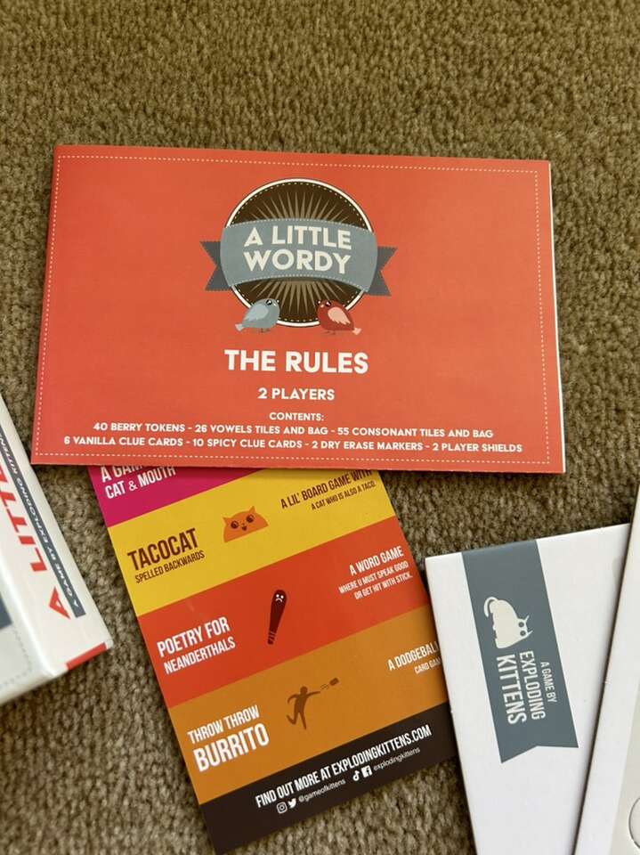 NEW A Little Wordy: A sneaky two-player tile game for aspiring geniuses and would-be word wizards. Ages 10+, 2 players. A game by Exploding Kittens, 2021. New, unplayed condition—unpunched and sealed components. Open box. Text only. Cash or Venmo.