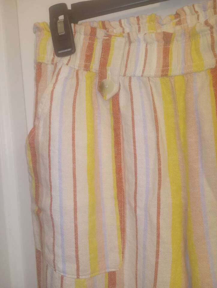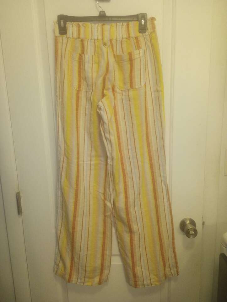 VenmoGently used~Women's SO brand (from Kohl's) striped linen pants with a wide leg. These are brighter than they appear in the photos. Red, yellow, pink, white stripes. Women's size Small. Has pockets on both the front and the back with an elastic waist. $10 cash or Venmo. Will hold with Venmo. From a pet and smoke-free home. Only worn once or twice. Text if interested. Feel free to check out my other ads-lots for sale including lots of women's clothing in the same size.