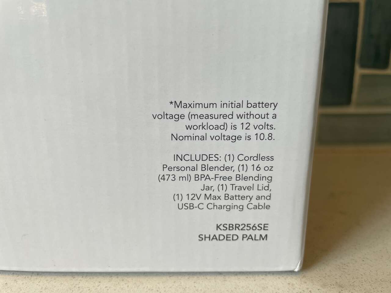 Model KSBR256 includes (1) cordless personal blender, (1) 12v MAX removable battery, (1) USB-C cable, (1) wall adapter, (1) 16 oz BPA-free blending jar, (1) travel lid