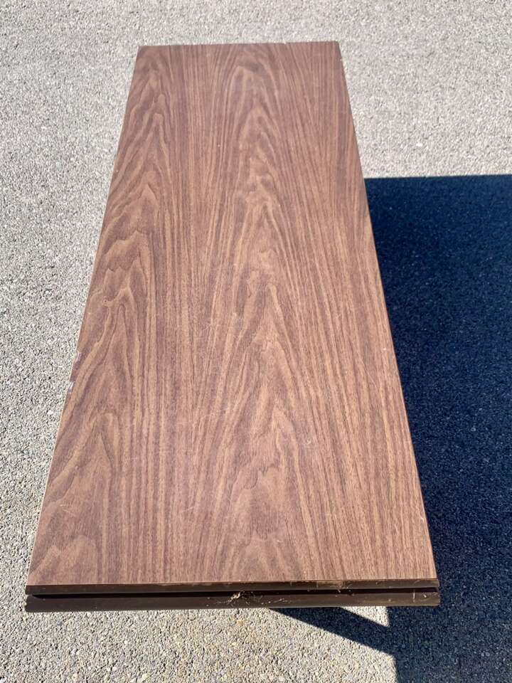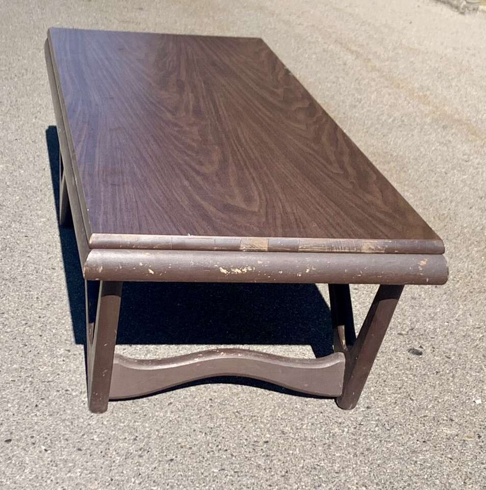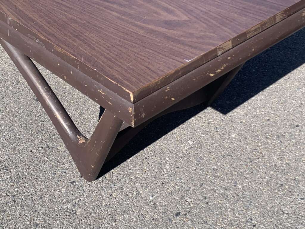The wood grain Formica tabletop, at the time, was a space age material with its durability and was used extensively on the high-end designer furniture pieces. The Walnut around the tabletop frame edge is the signature of Pearsall.