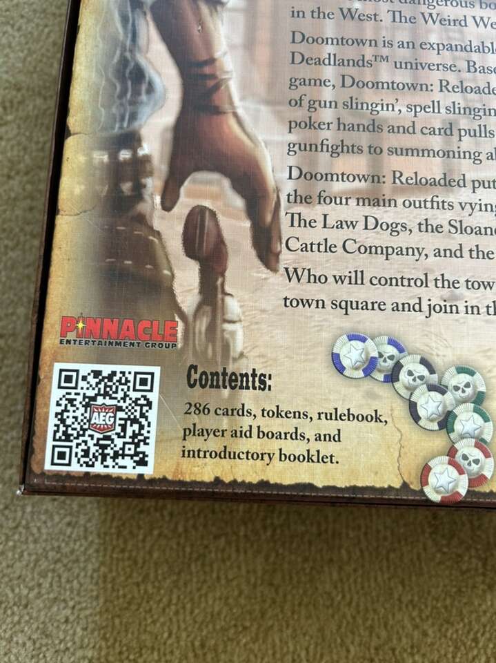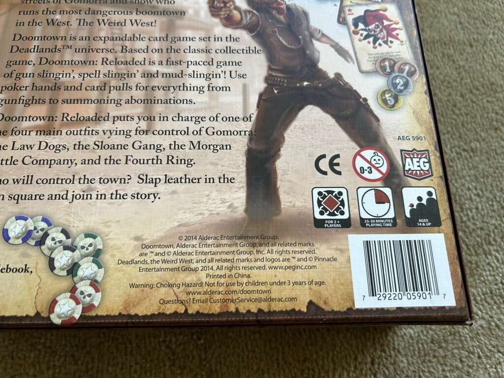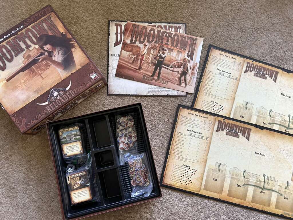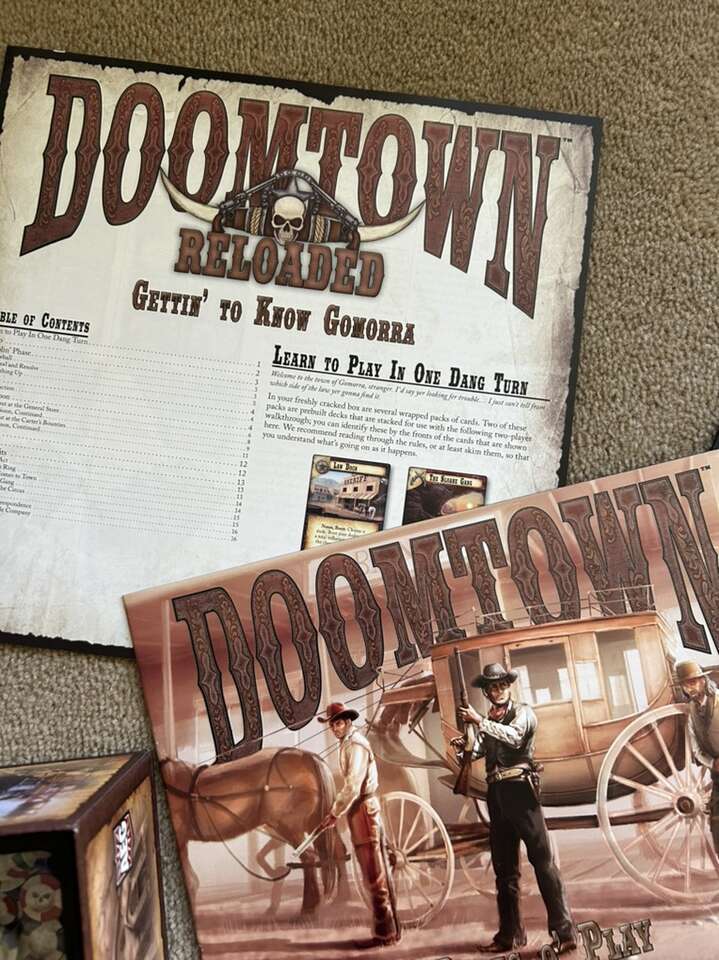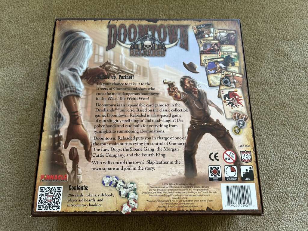 COMPLETE Doomtown Reloaded Game. Base set. 2+ players, ages 14+. By Mark Wootton and David Williams, AEG, Pinnacle, 2014. Complete, no missing pieces. Excellent condition. Text only. Cash or Venmo.