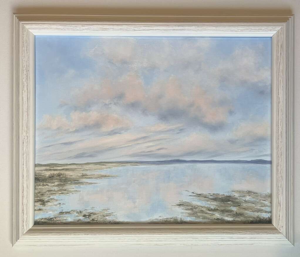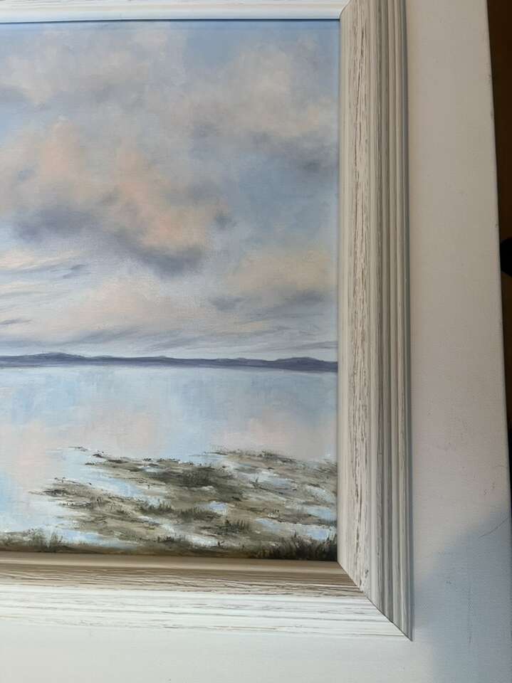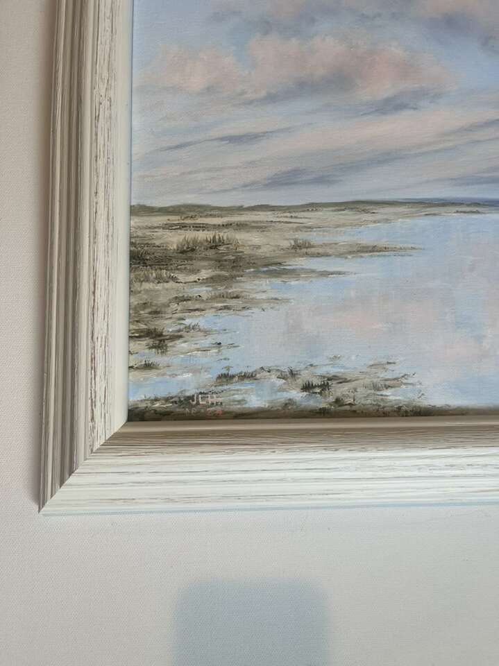 Framed 16x20 inch original landscape oil painting on stretched canvas. Whitewashed driftwood frame. Large sunset sky and reflecting over seascape lake marshland. Painted by seller, Signed and dated. I take Venmo @jen-Hestad . $525 Total measurements 20 x 23.5 inches *Check out more from this seller for more works of various sizes *Instagram @jen_paints_sometimes. *Call or text Jen 801-814-0577