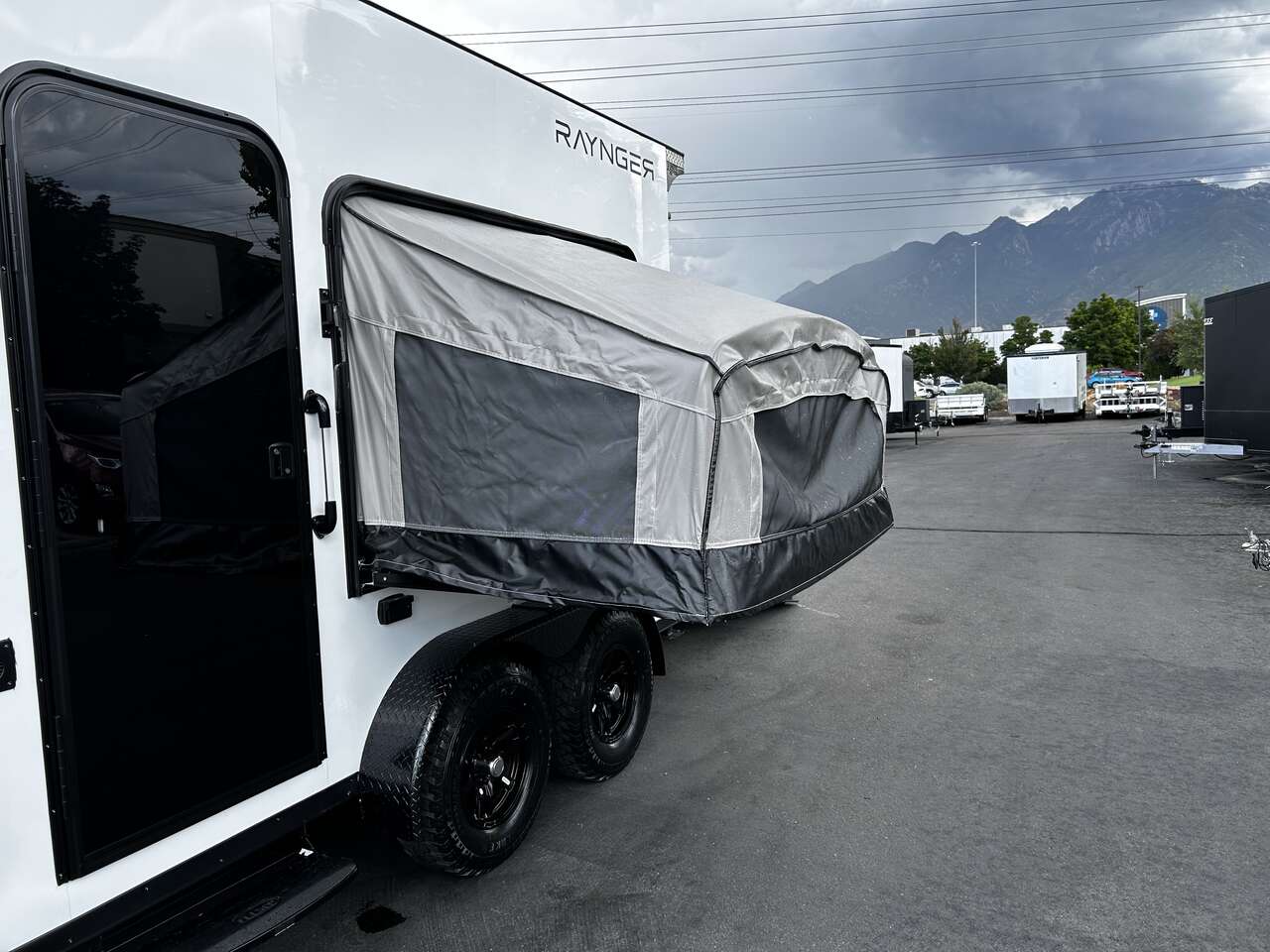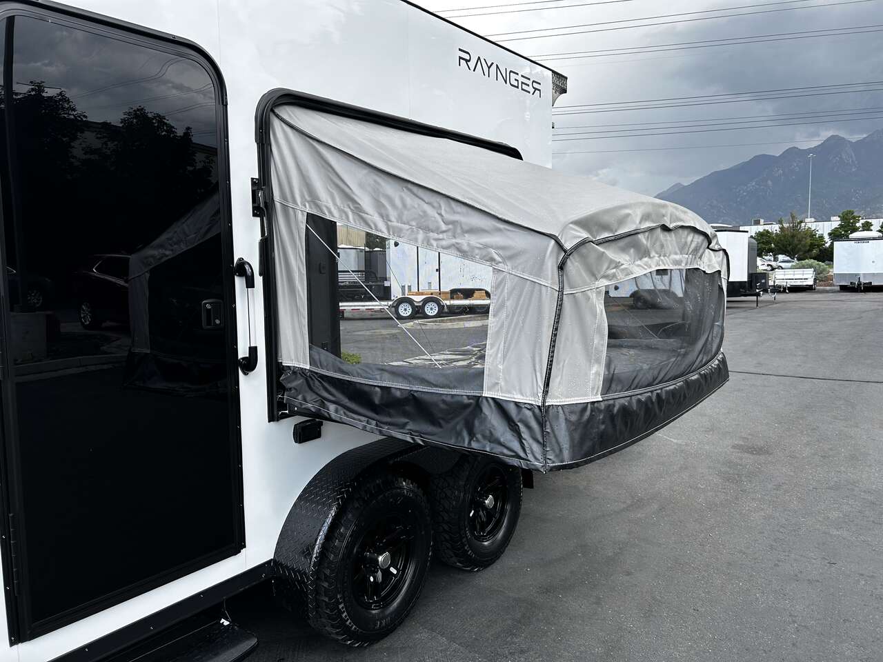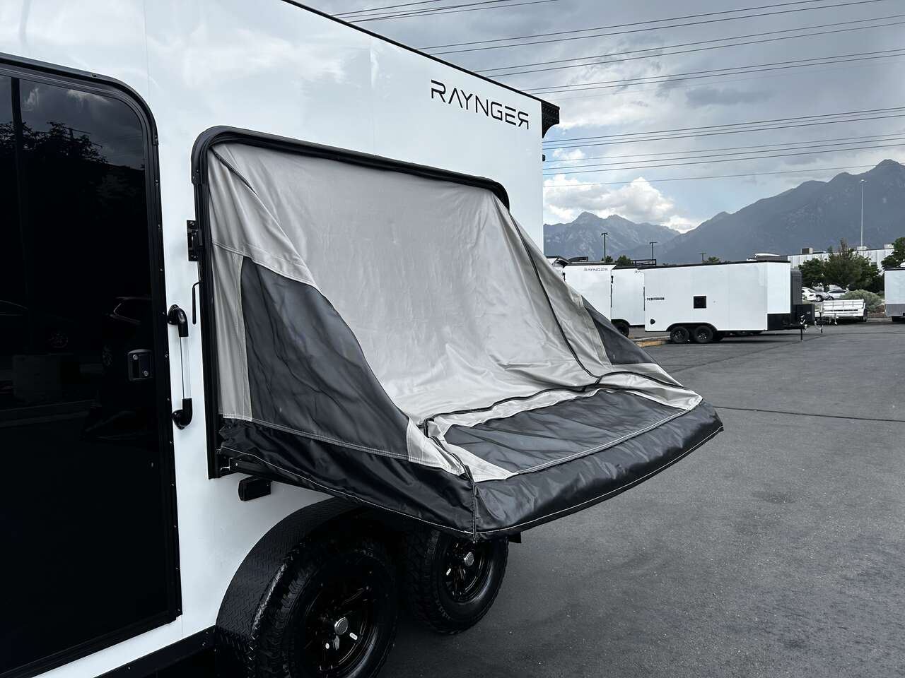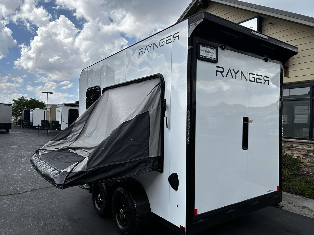 LIMITED TIME $241 A MONTH WITH ZERO DOWN WITH OUR SPECIAL LOCAL CREDIT UNION PARTNER!!! NO PRE-PAYMENT PENALTIES!!! NEW FEATURE, FULL BATH/HALF KITCHEN!! SELF CONTAINED TOILET, 36x36 SHOWER, FRESH WATER TANK, WATER HEATER, WATER PUMP, SINK AND MORE!!! NEW 2025 MODEL!!! RAYNGER PREMIUM OFF ROAD TOY HAULER CAMPER!!! 19 INCH GROUND CLEARANCE!!! OFF ROAD TIRES!!! FULLY INSULATED!!! HEATING AND A/C!!! WET SOUND STEREO!!! FOLD OUT/POP OUT TENT WITH MATTRESS!!! 84 Inch Rear Entry Height/87 INCH INTERIOR HEIGHT!!! 77 Inch Rear Entry Width!!! Aluminum Ventilated Locking Generator Box!!! UPGRADED TORSION AXLES!!! 11.1 Foot Long Garage Space!!! And Much MUCH MORE!!! Check out our Specs!!! Also available in 18 foot models. 18 Foot Models can have 3 Fold Out Beds/Pop Out Tents. 16 Foot and 18 Foot Models will fit ANY stock 4 Seater Side by Side • 6” I Beam Frame• Flat Top Design• Flat Front Design• Wall Posts 16” on Center• Cross Members 16” on Center• Roof Bows 16” on Center• Rust Inhibiting Z-Tech Protection on Chassis• Ameraguard on Tongue• Ameraguard on Rear Bumper• Ameraguard Around All Door Openings and Stepwell• Ameraguard Around Edges of Ramp Door• 3500 LB Spring Axles• 2-5/16” Coupler• One-Piece Aluminum Roof• ST235/75R15 Aluminum Wheels with Chrome Center Caps• 2000# Ramp Door with Eberhard Latch• 30” Tempered Glass RV Door with Screen Door• .030 Exterior Metal with Screwless Sides• 24” Black Stoneguard• 3” Black Bottom Trim• Sand Pad• Black Door Hold• 2.7mm Charcoal Textured Vinyl Ceiling • 9mm Charcoal Textured Vinyl Walls• 3/4” Engineered Wood Floor with Rubber Coin Overlay• (6) 1200 LB Floor D rings Installed with Backer Plates• LED Clearance Lights and Tail Lights• LED Back-up Lights• No Show Wheel Box• Spoiler with Toggle Switch• RV Step• 7’ Interior• (2) 17” Chrome Base Lights with Switch• (1) Black 17” Spot Light with Switch• (1) 30 Amp Panel with Marine Plug• A/C Unit with Heat Strip• (3) Interior Recepts• (1) Exterior Recept• 12V Battery and Charge Line• Prep for Backup Camera• Wet Sounds System• (3) Blue Interior Cabinet Lights• (1) 6’ Section of Flex Lights• Black ATP Rear Header and Hoop• Black ATP Fenders• Insulated Walls & Ceiling• Base Cabinets• Overhead Cabinets with Netting Over Compartments• Pop Out Tent• Black ATP Storage/Generator Box Mounted On Tongue