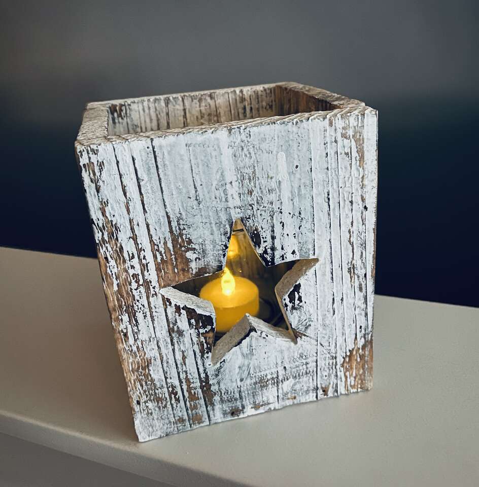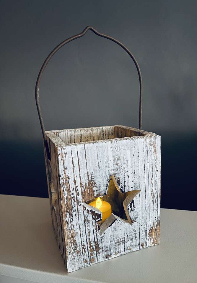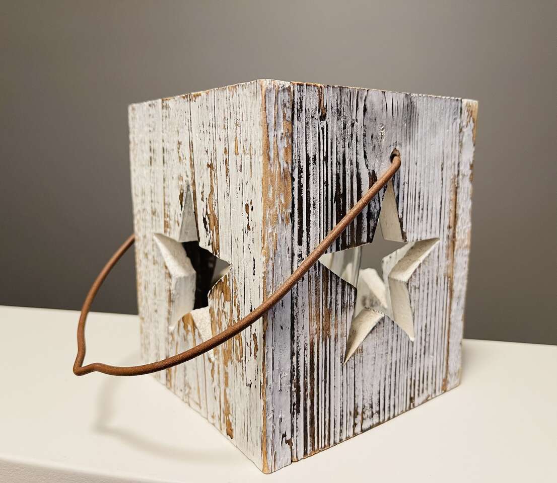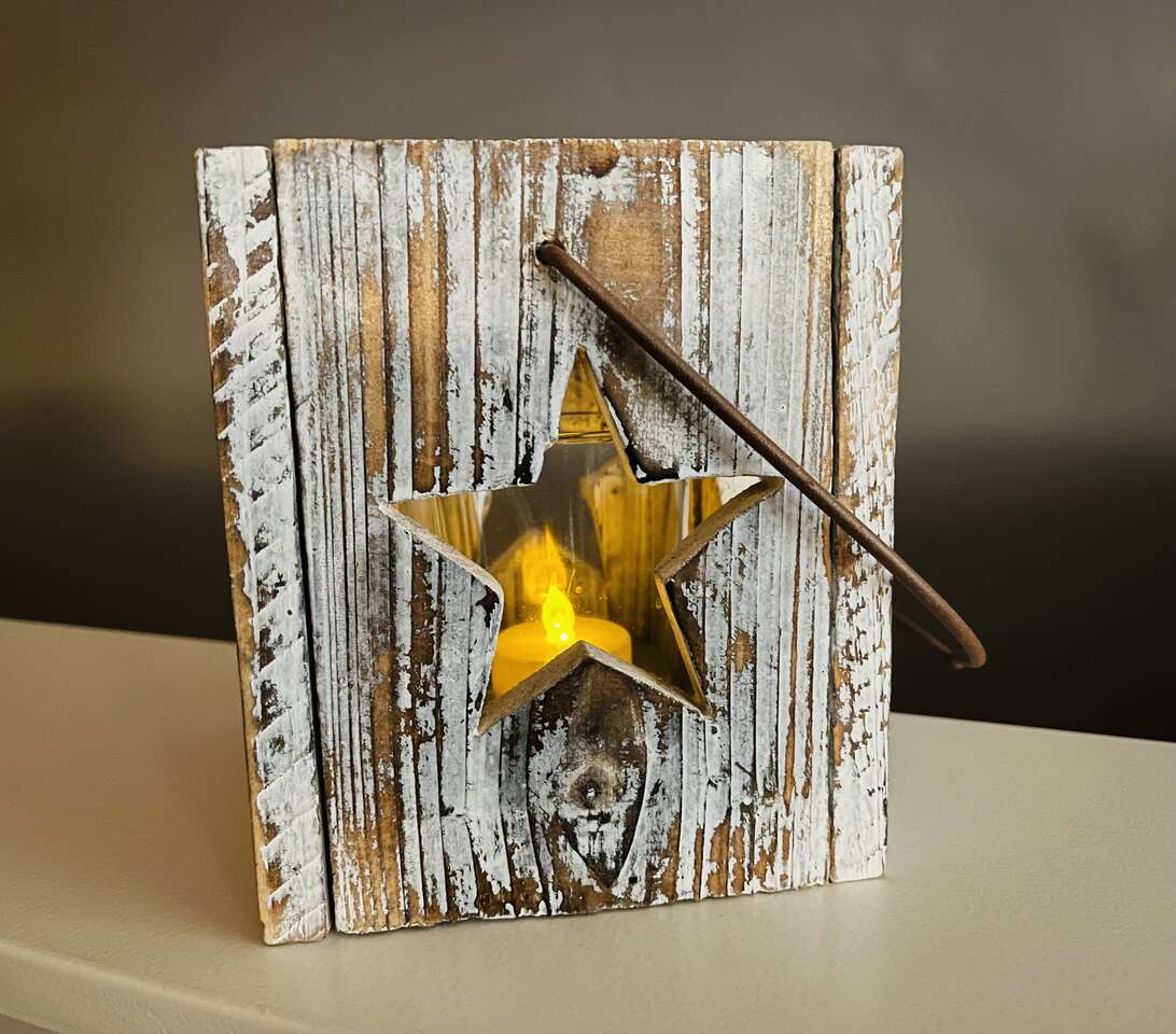 Nice rustic wood star candleholder w/ metal handle and inner clear glass tea light candle holder. 5 point traditional star cutouts on all 4 sides. Nicely distressed wood. Rustic/ shabby chic decor for year round or Christmas decorating. Would recommend using with safer LED tea light candles as pictured.