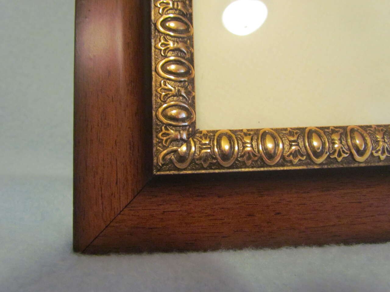 This lovely piece of art will be beautiful on any home wall. It measures approximately 21" wide x 17" tall with a 10 x 13 mat opening. Frame bottom right corner needed some glue, as can be seen on the back of the frame; but it's well put together and has remained so for a long while.