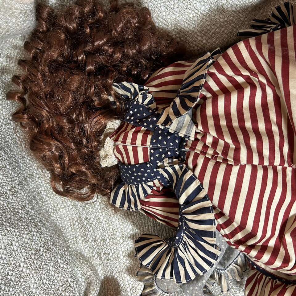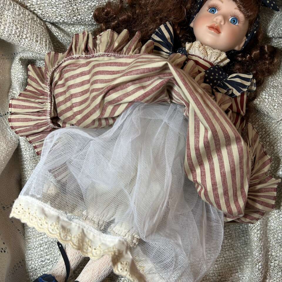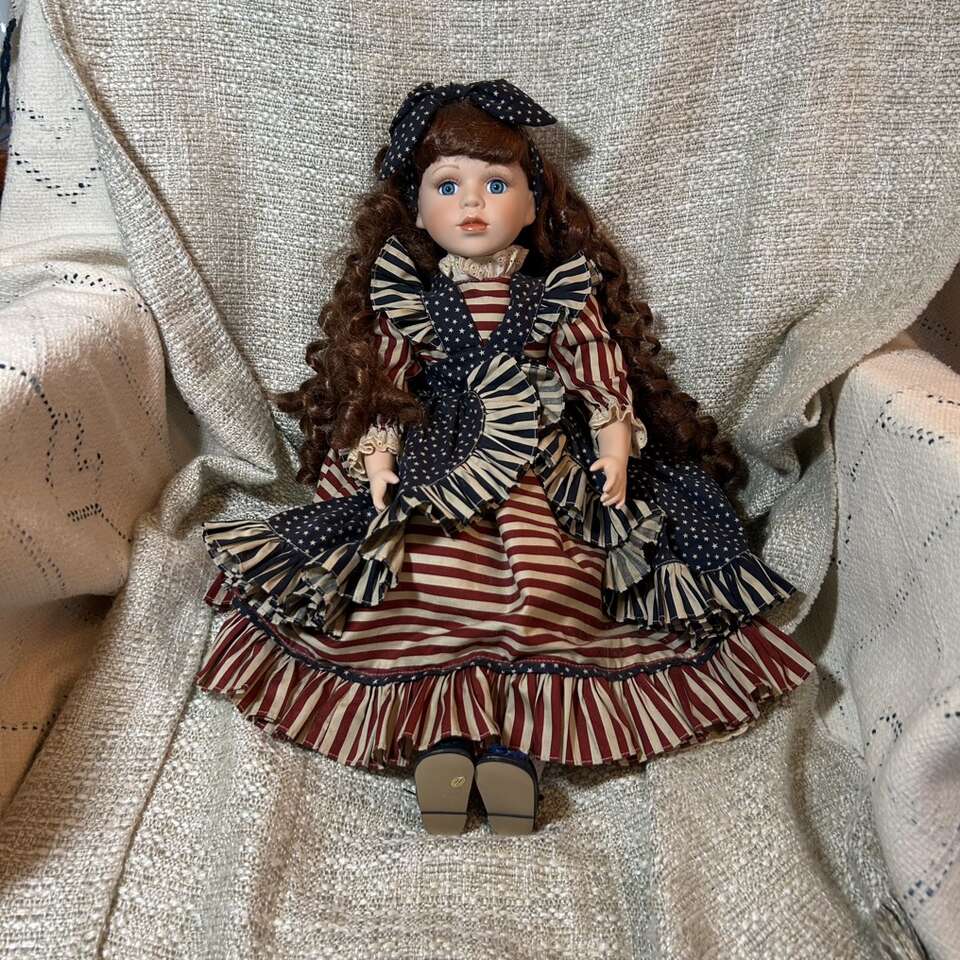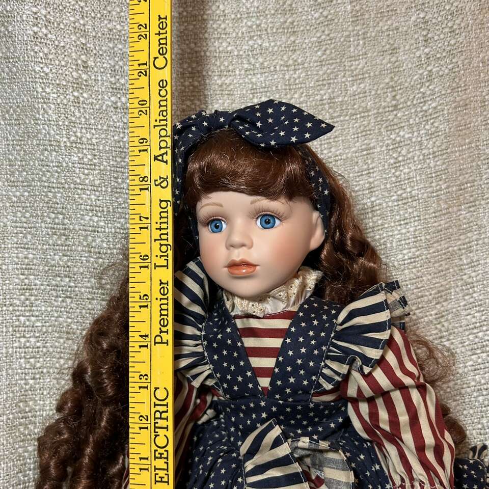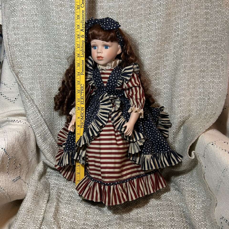 20” “Palmary Collection - 3 Hearts” limited edition - (#351 of 2000) Porcelain Doll with a soft body. She is a “Fourth of July” Doll wearing a patriotic colonial style red, white, & blue (antique white) dress of stars & striped with ruffles and antique white eyelet lace trim. She has navy blue shoes adorned with a medallion type flower & one shoe has the only defect- a broken buckle that I could fix with a couple of stitches, or leave for you to fix the way you want. She has lace stockings, eyelet lace trimmed petty-coat and eyelet lace trimmed bloomers. Elastics in waist, cuffs & bloomers is all tight. Doll has clear blue glass eyes and long, thick curly amber colored hair. Wooden doll stand included. wonderful addition to any patriotic decor. No rips, tears, snags, chips, cracks or crazing. Smoke free. Delivery available to a convenient location when in your area for $5.