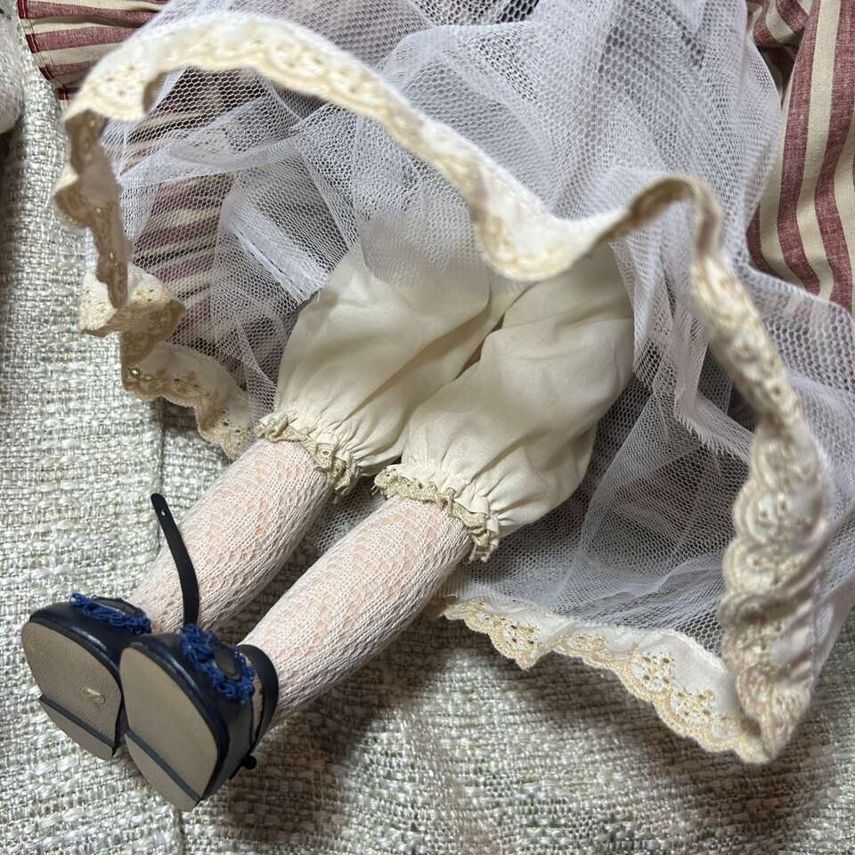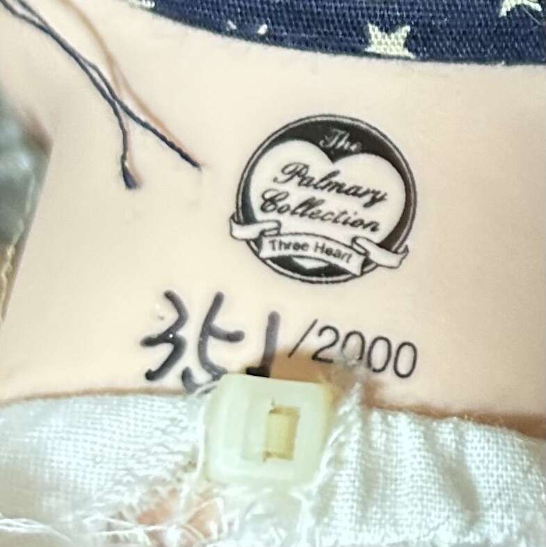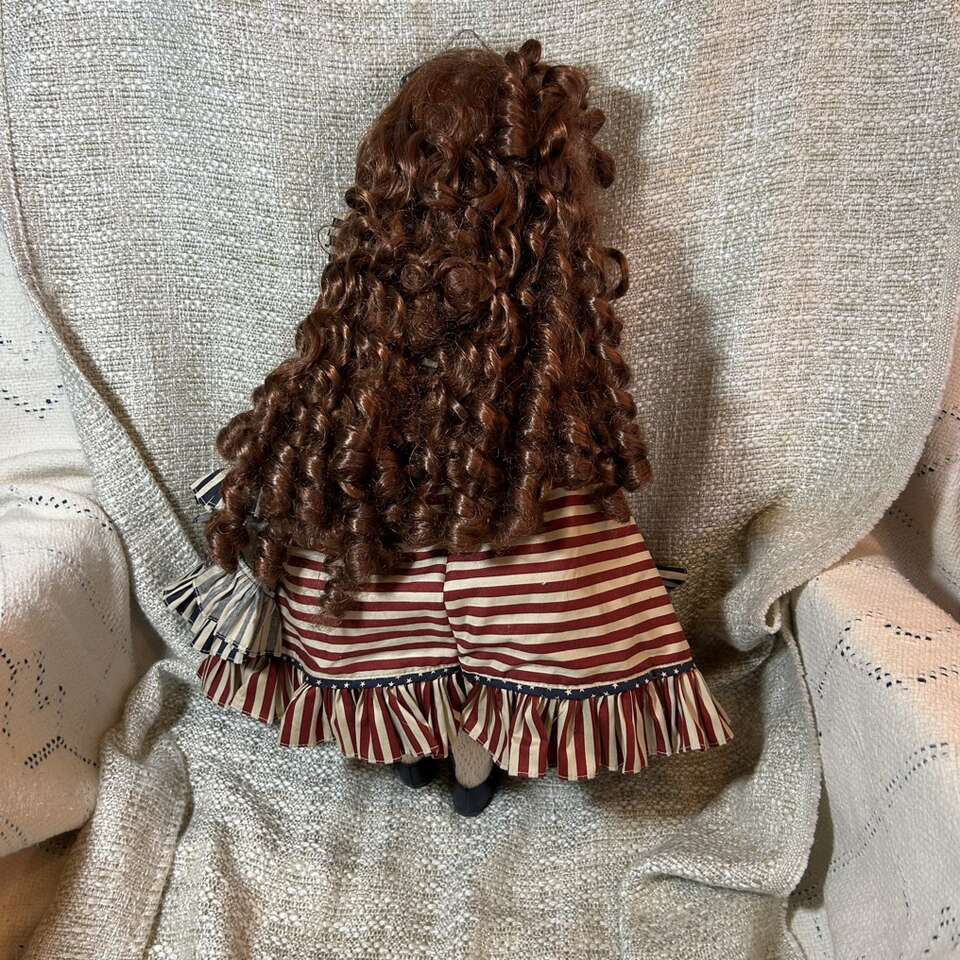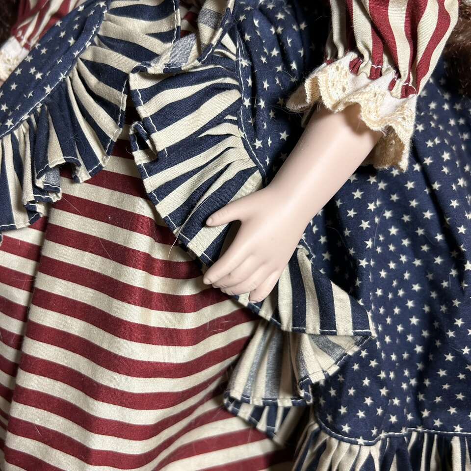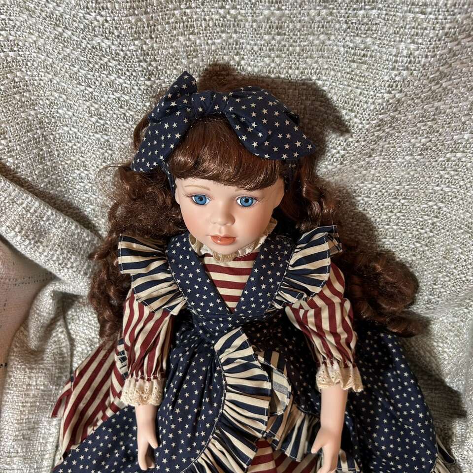 20” “Palmary Collection - 3 Hearts” limited edition - (#351 of 2000) Porcelain Doll with a soft body. She is a “Fourth of July” Doll wearing a patriotic colonial style red, white, & blue (antique white) dress of stars & striped with ruffles and antique white eyelet lace trim. She has navy blue shoes adorned with a medallion type flower & one shoe has the only defect- a broken buckle that I could fix with a couple of stitches, or leave for you to fix the way you want. She has lace stockings, eyelet lace trimmed petty-coat and eyelet lace trimmed bloomers. Elastics in waist, cuffs & bloomers is all tight. Doll has clear blue glass eyes and long, thick curly amber colored hair. Wooden doll stand included. wonderful addition to any patriotic decor. No rips, tears, snags, chips, cracks or crazing. Smoke free. Delivery available to a convenient location when in your area for $5.