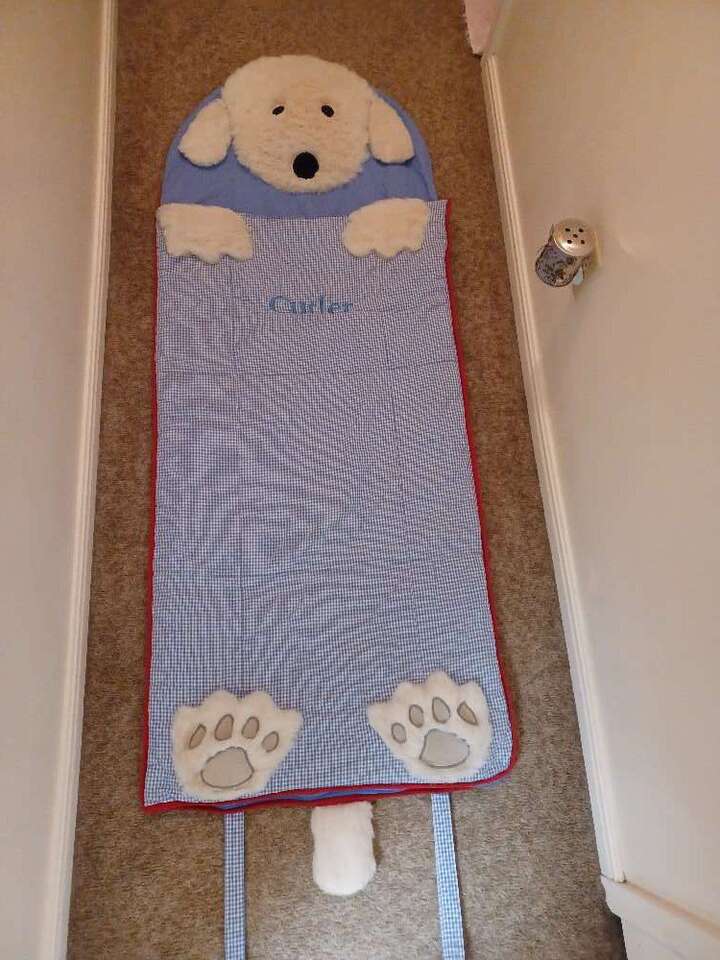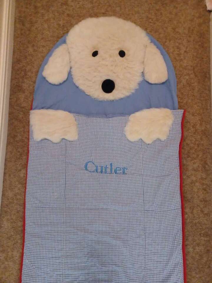 Blue & white dog detail sleeping bag with soft dog head pillow built in. $40 or best offer.