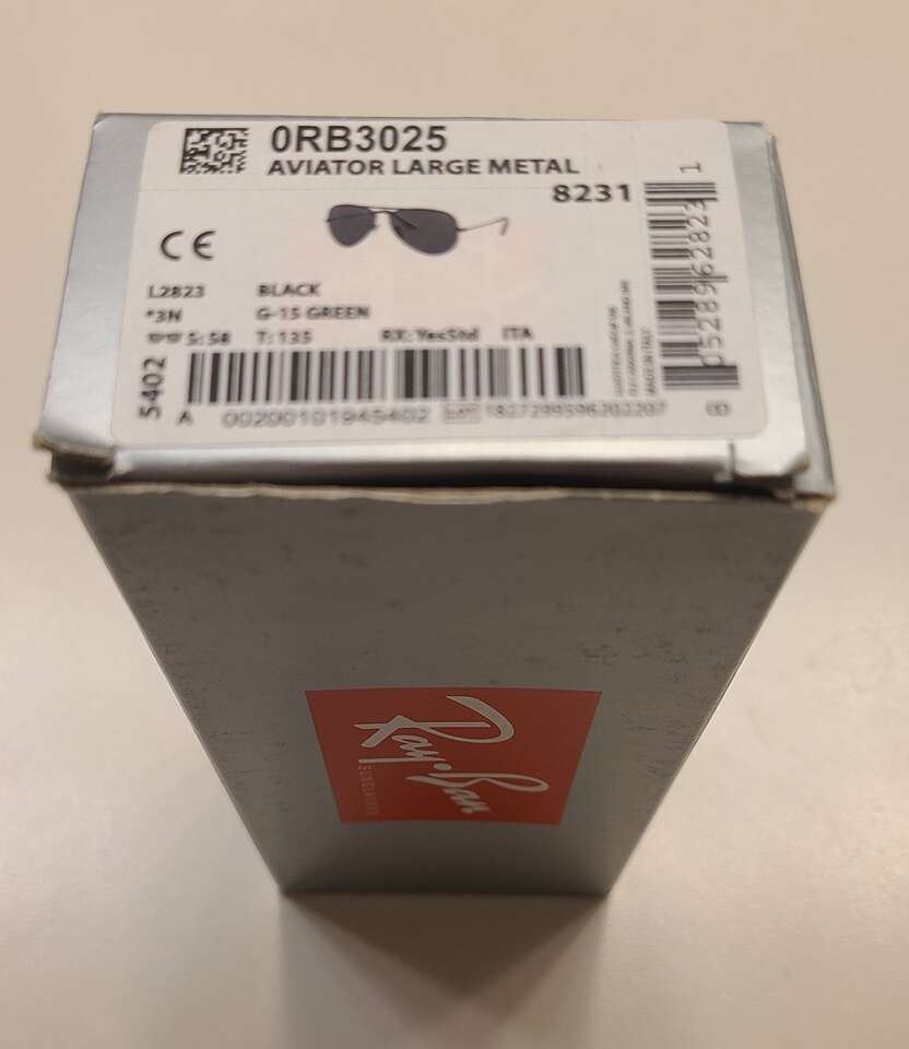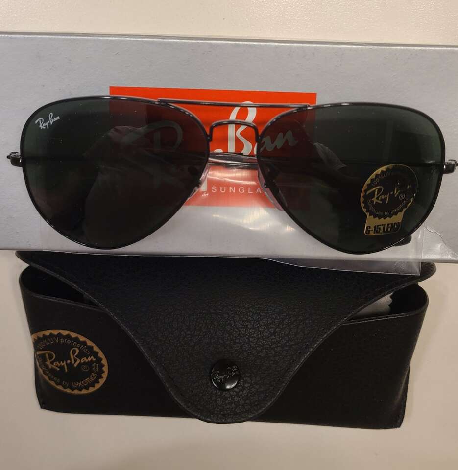 New Ray-Ban RB3025 Classic Aviator Sunglasses with case, box, and papers.