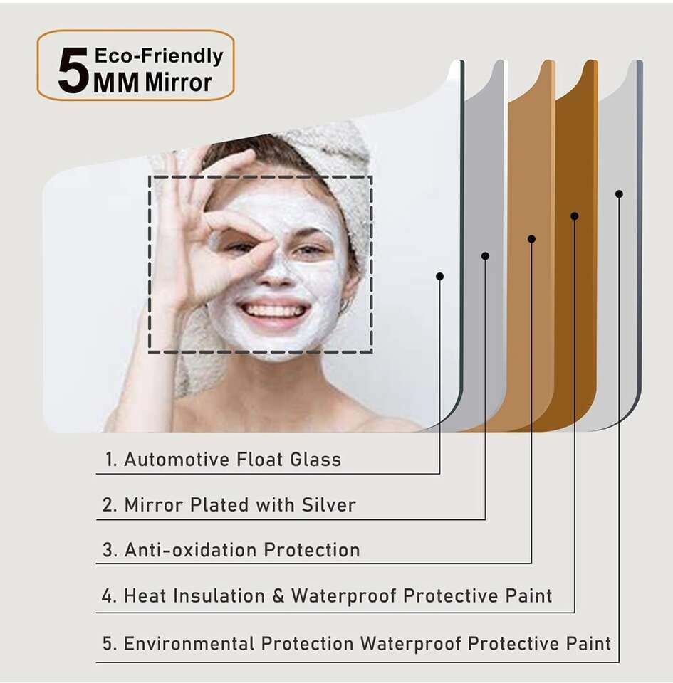5mm Mirror: The vanity bathroom mirror is made of 5mm copper-free, anti-rusting materials with polished edges. The CRI is over 92 which will give you 35% more clarity than a conventional mirror. This allows you to see the most natural reflection of yourself.