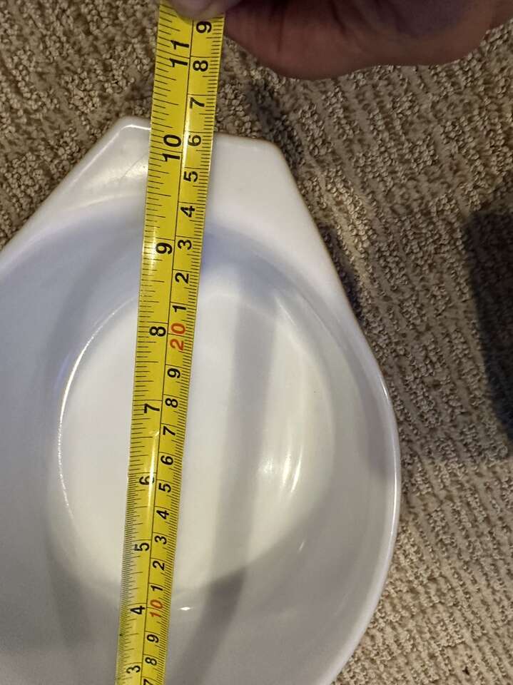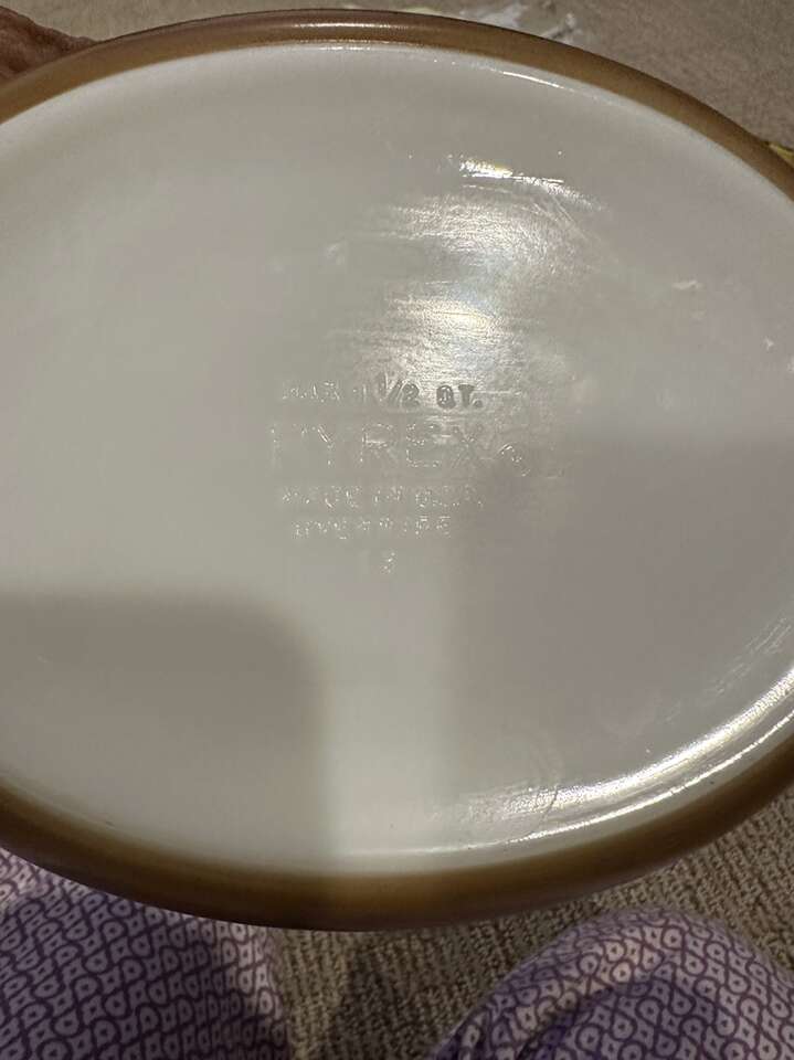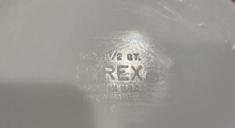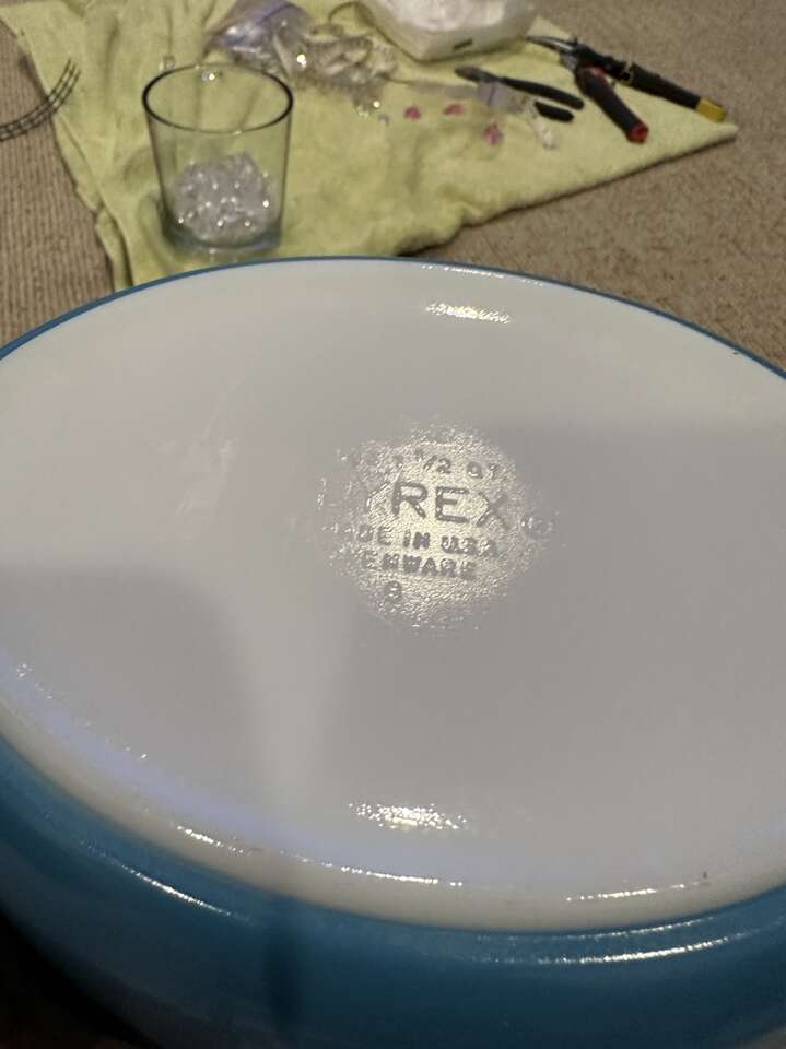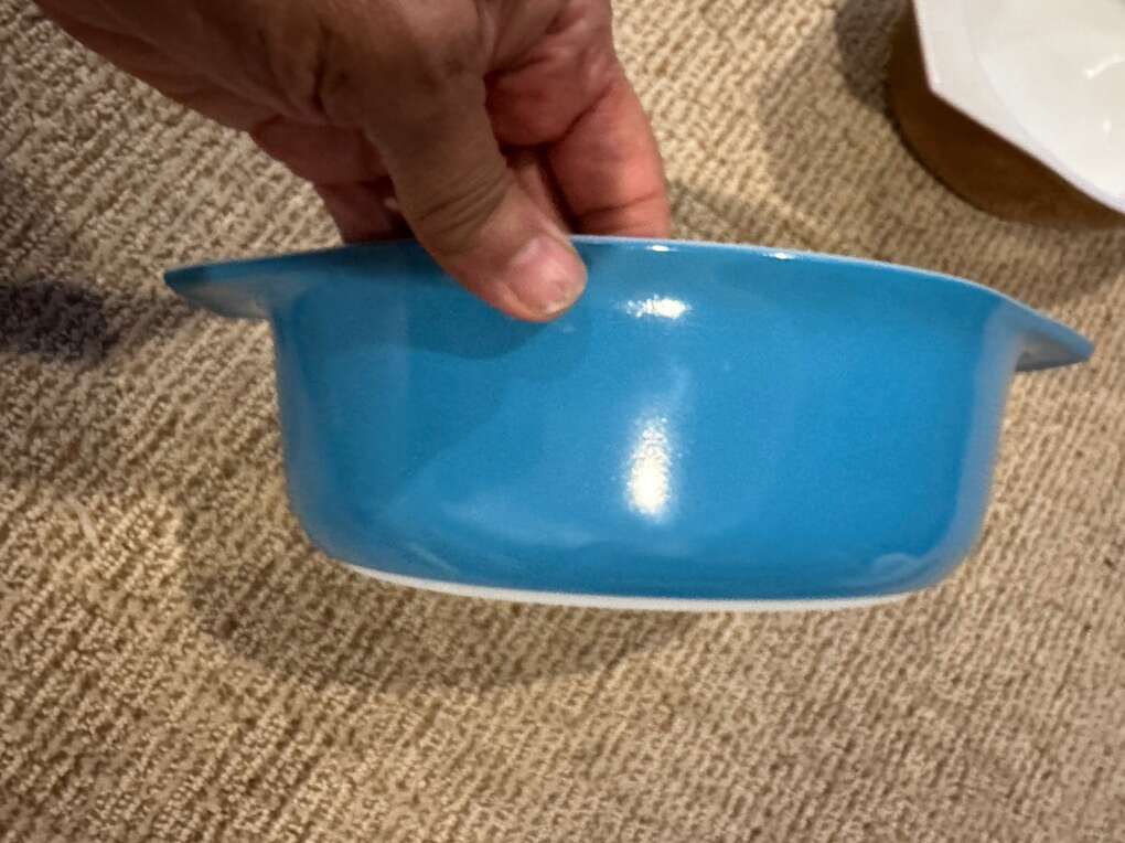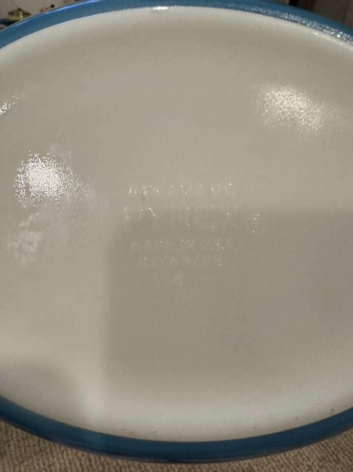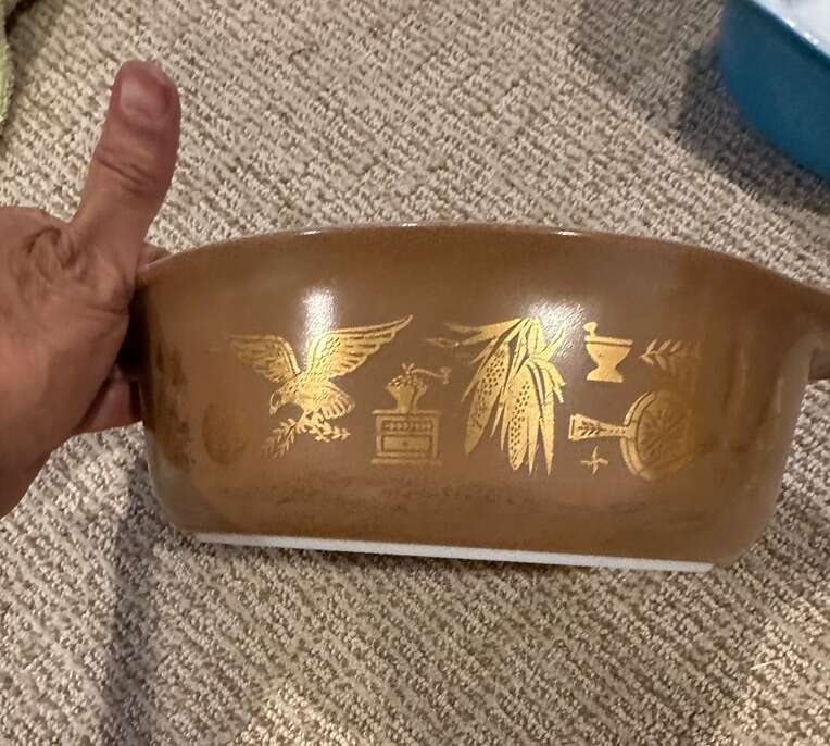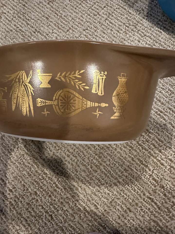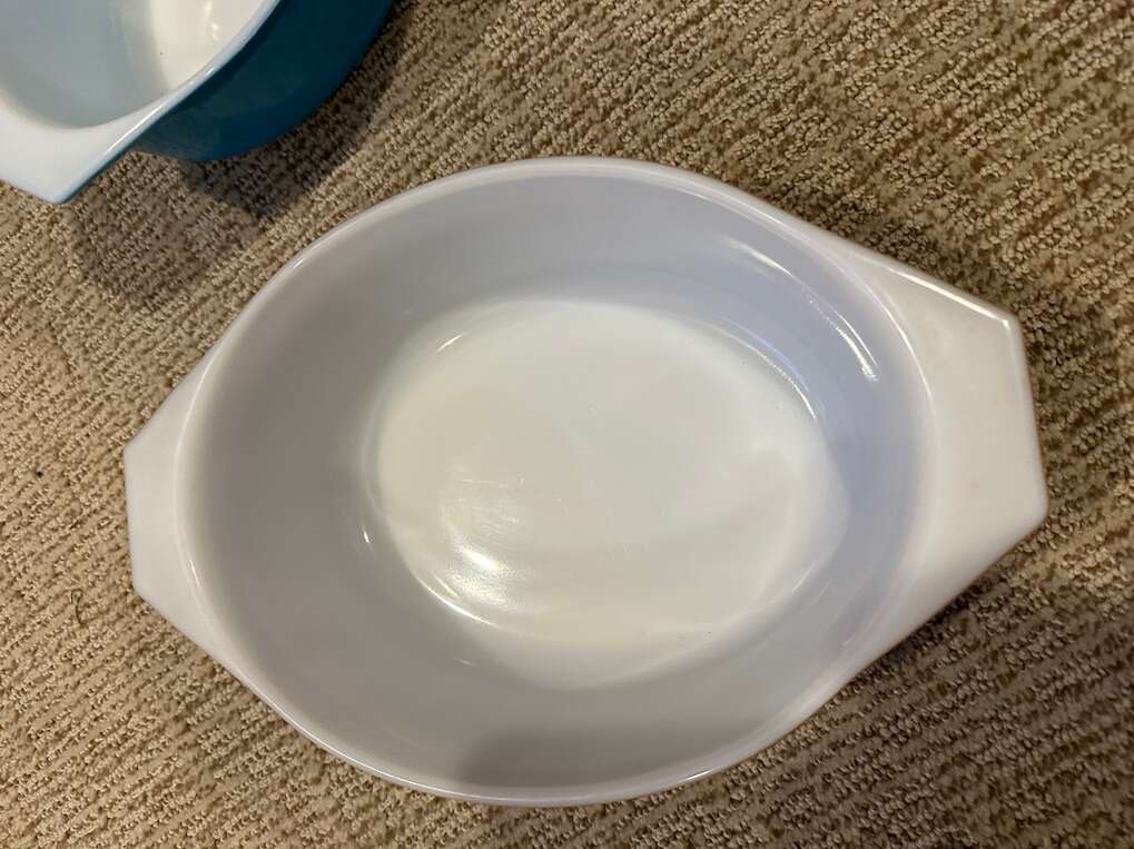 Two vintage casserole dishes. One is light blue and the other is early colonial.