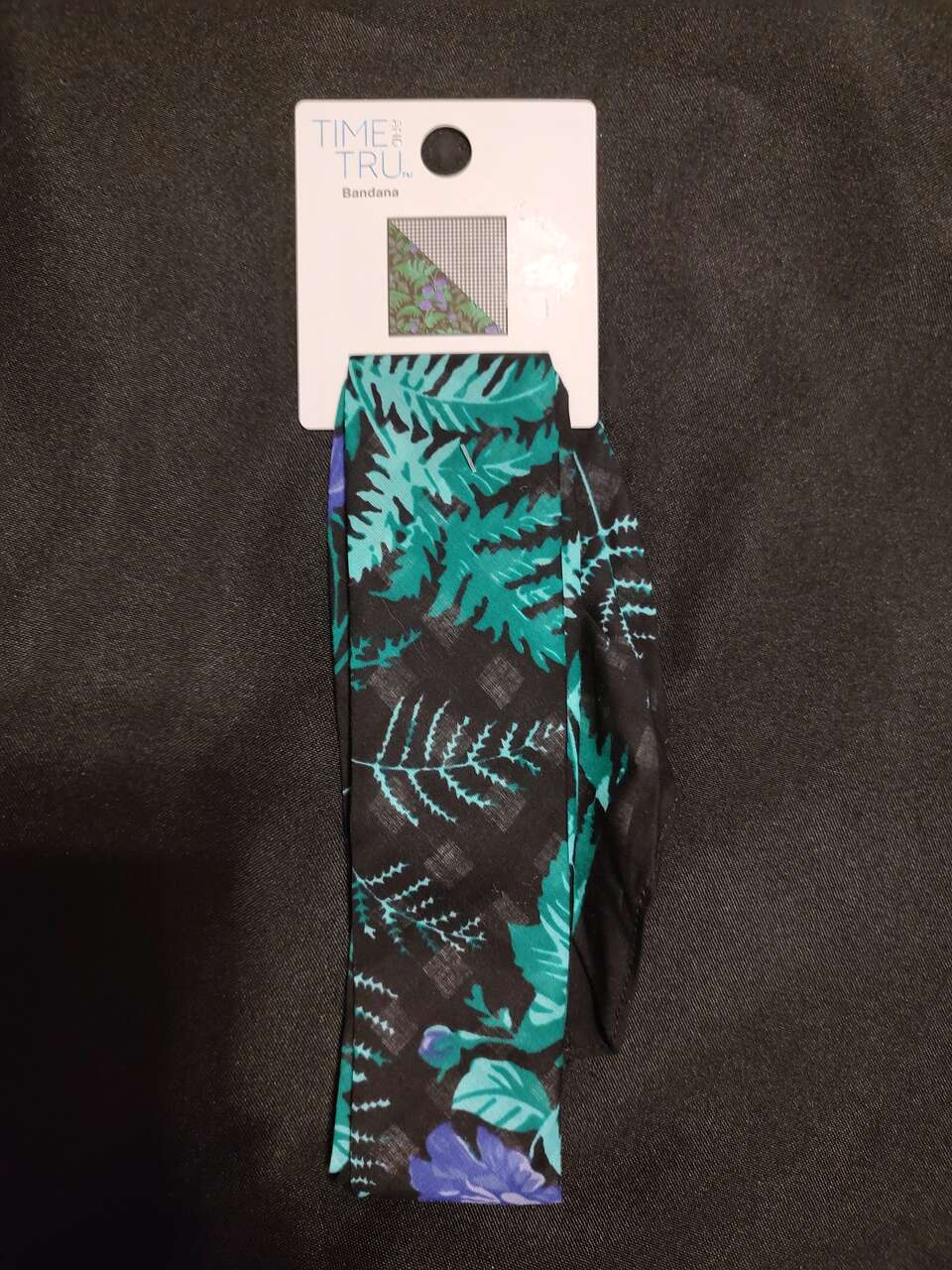 This is a reversible bandana. It has a tropical design on one side and a plaid design on the other side.