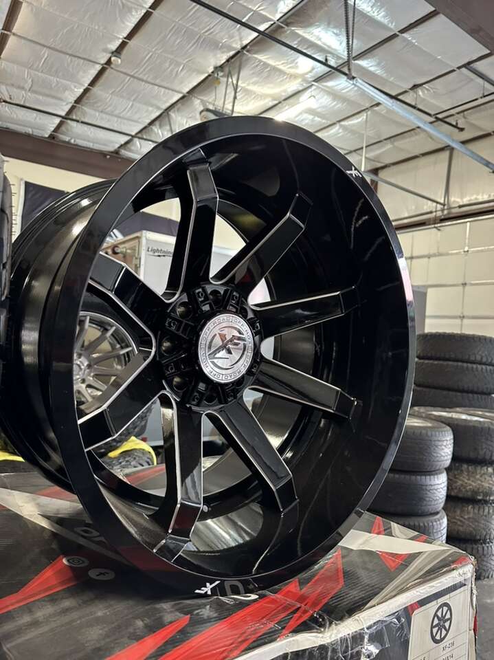 24x14 XF offroad wheels Powder coated black finish with chrome accents -76 offset Brand new in the box, not a single scratch on them. I also have tires as well I will make a package deal.