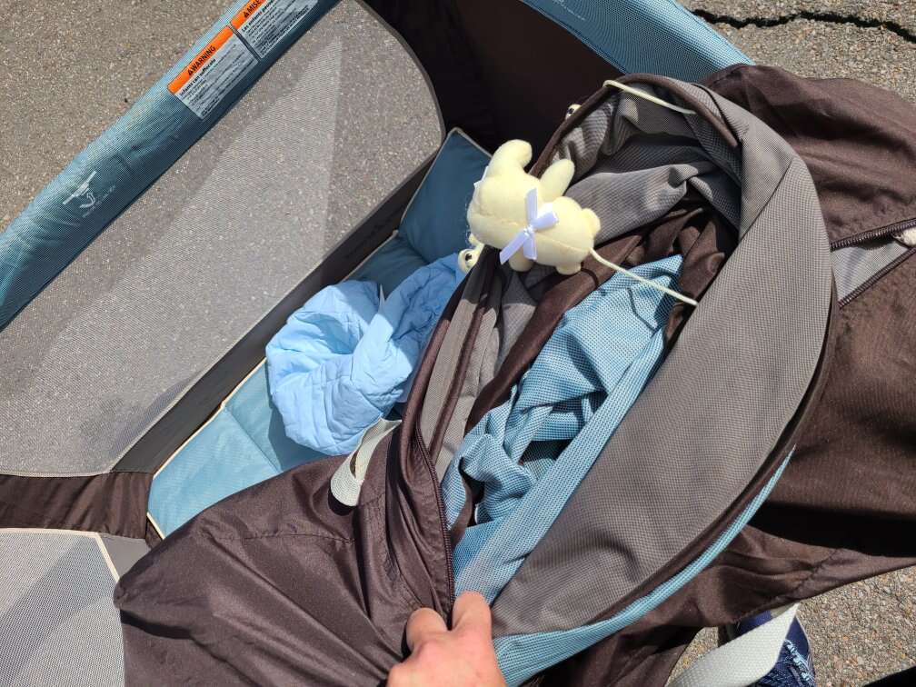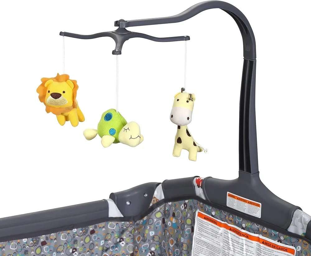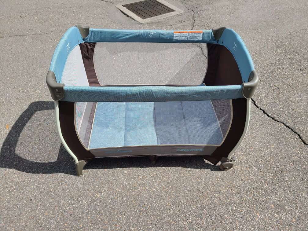 Cute Playpen play yard. great condition. folds easy, comes with carry case. brand new accessories include the bassinet changing table that goes on top and a cute mobile that spins. We never used so they are still new