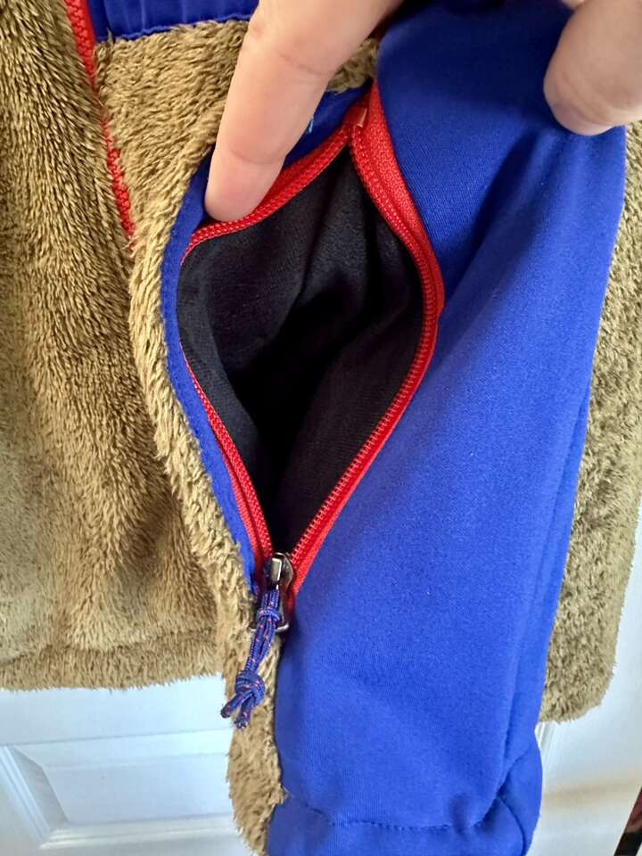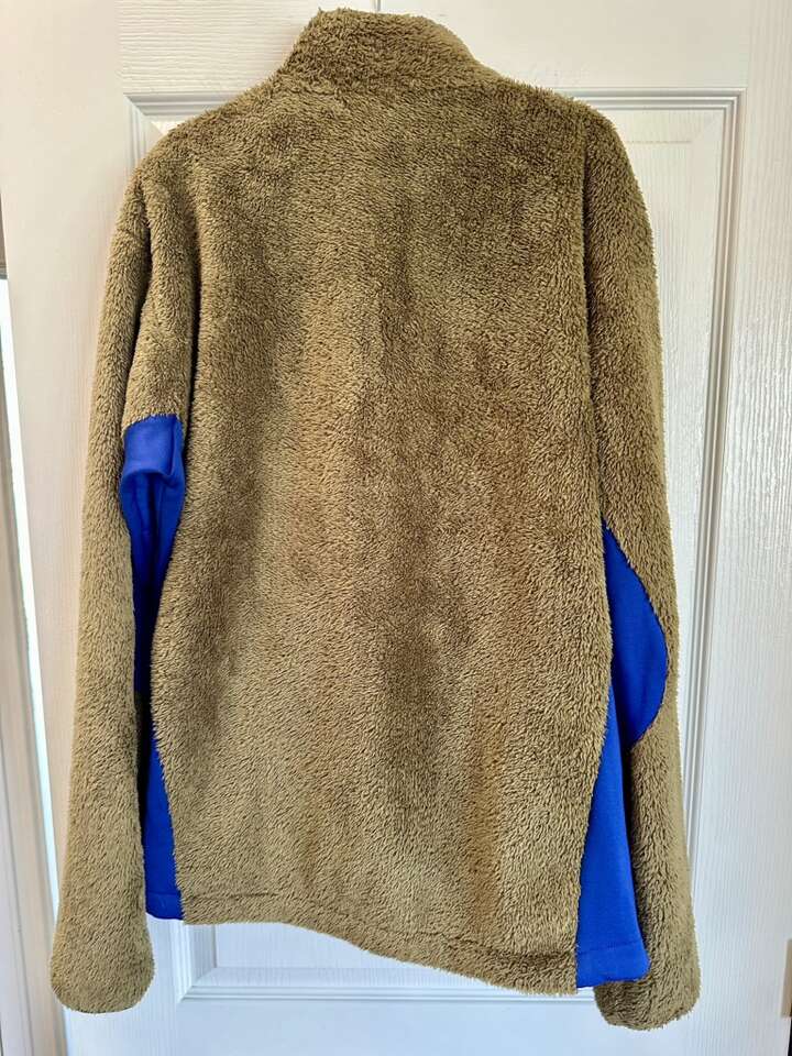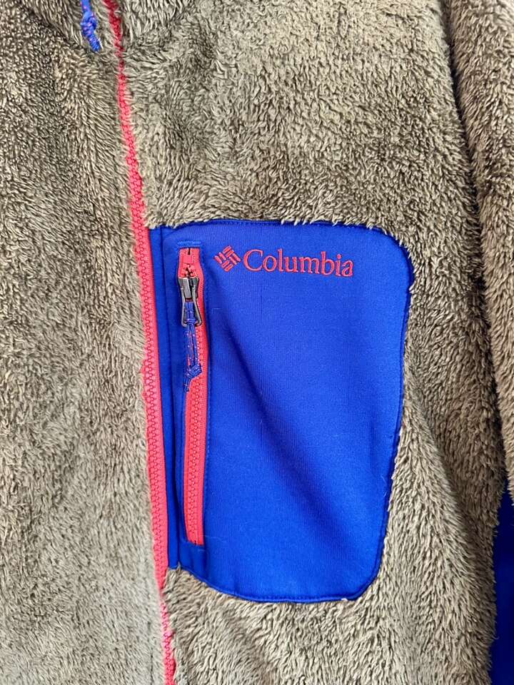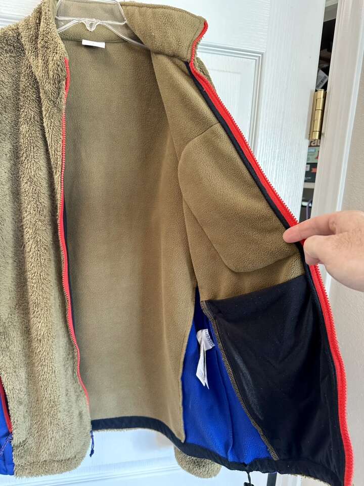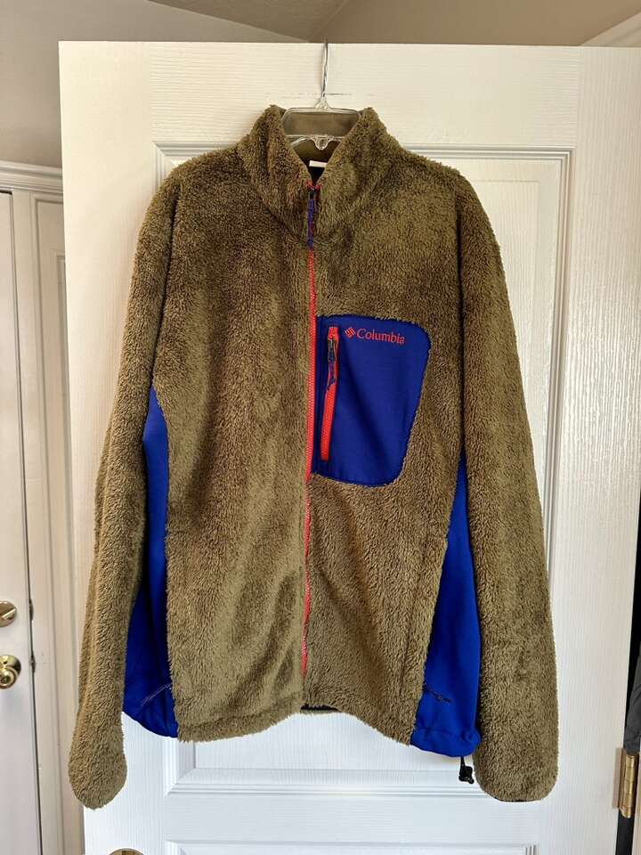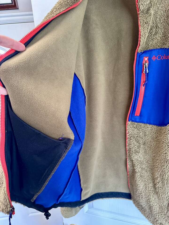 Awesome jacket! Hard to find colors. It’s kind of an olive green with burnt orange and blue accents. 2 front hand zip pockets. 1 chest zip pocket. 2 inside storage pockets.
