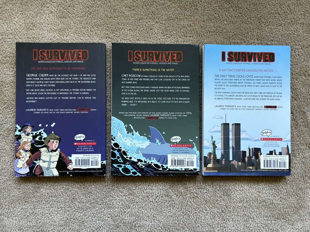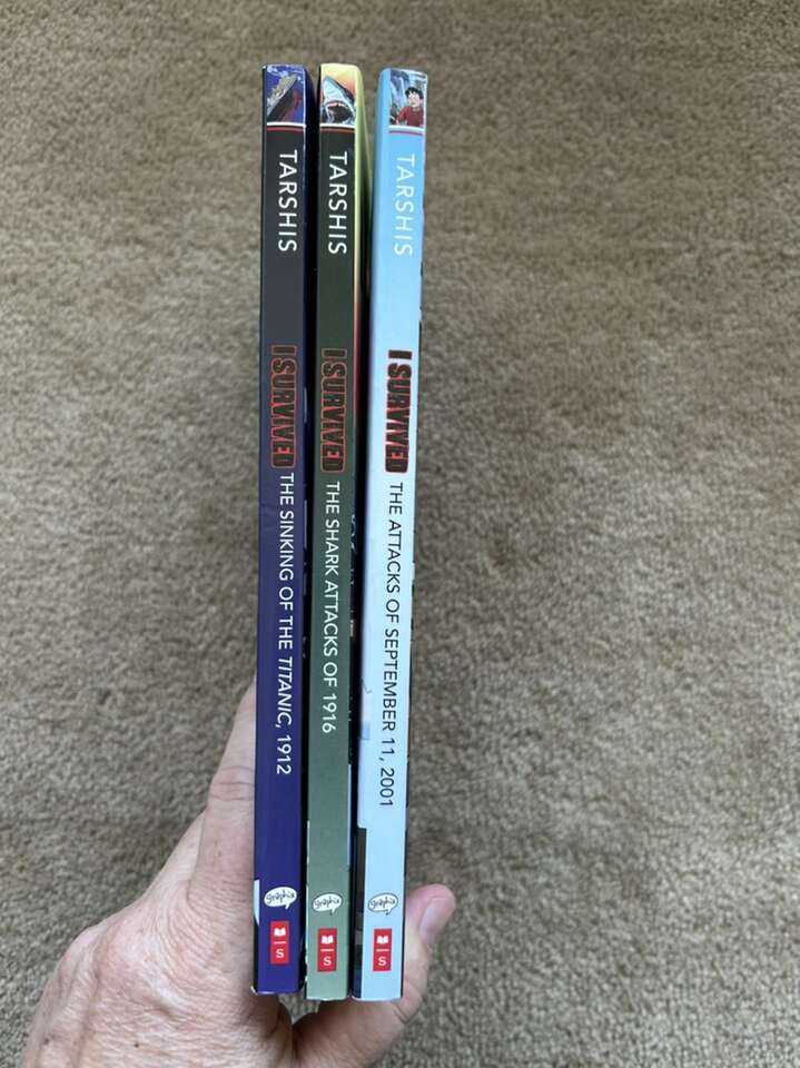 Three “I Survived” Graphic Novels, by Lauren Tarshis, art by Haus Studio, Corey Egbert. I Survived: the Sinking of the Titanic 1912, the Shark Attacks of 1916, and the Attacks of September 11, 2001. Based on the original “I Survived” book series for ages 8-10. Scholastic, 2020-2021. Sturdy paperbacks in very good condition. Text only. Cash or Venmo.