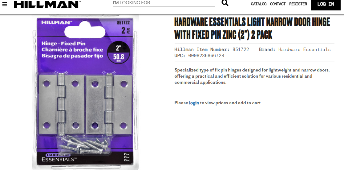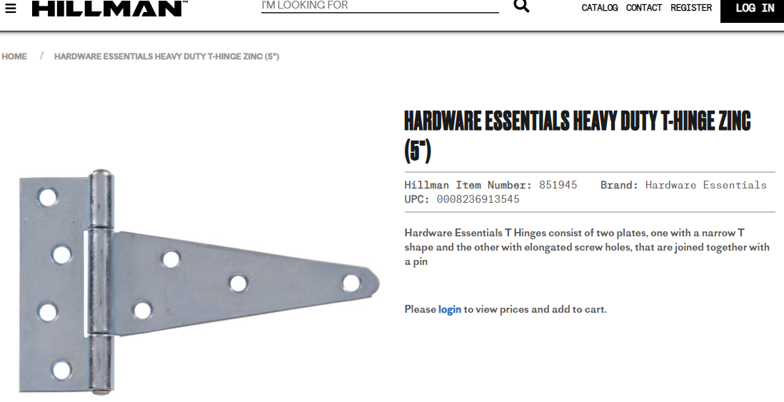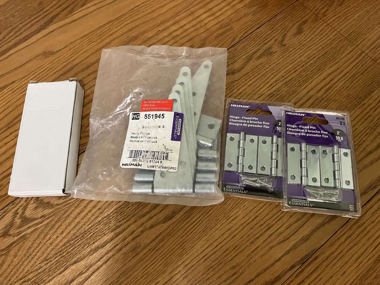 VenmoBrand new Hillman 5" heavy duty T-hinge, zinc plated #851945 (pack of 5), 2" fixed pin hinges two (2-packs), and two heavy duty 4-1/2" x 1-3/4" fixed pin hinges (unbranded). Seperately these hinges sell for over $64. I have 15 boxes (2 pack) of the heavy duty "4-1/2' hinges if you need them text me.