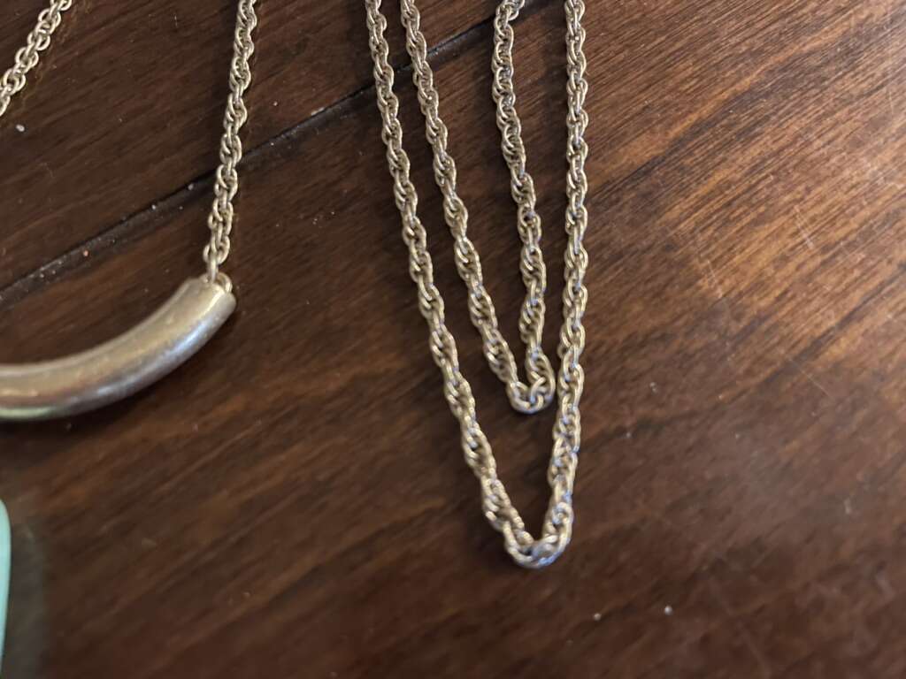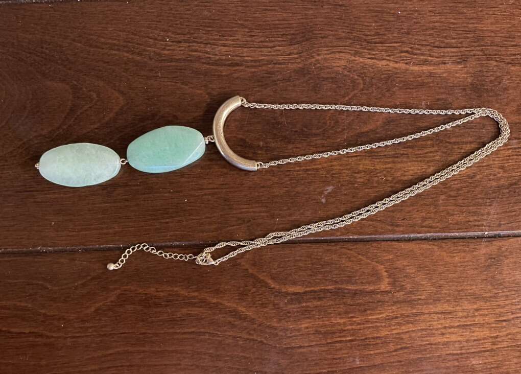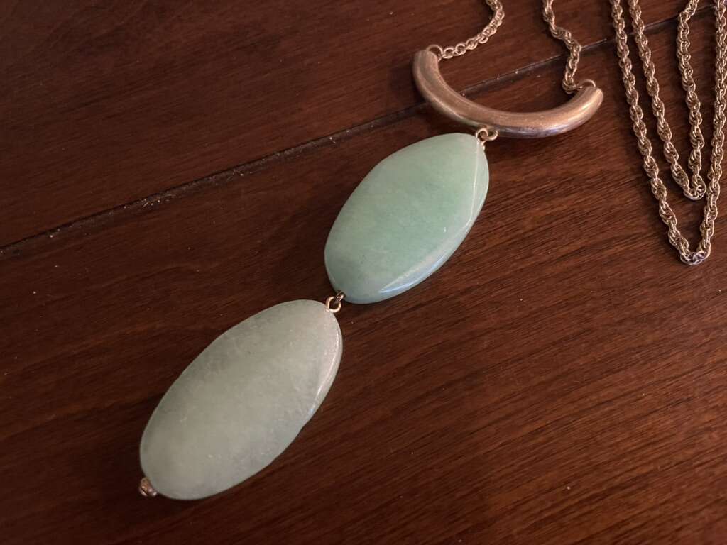 I have a vintage necklace that is gold tone and has a gold U or moon shape with 2 large light green stones. They are a milky color like jade but could be costume jewelry. If you hold it up it hangs about 19 inches down. The stones or beads are just under 2 inches long each. I don’t see any maker marks or metal content markings so I don’t know what the metal is. See my other ads for jewelry, artwork, home decor and more.