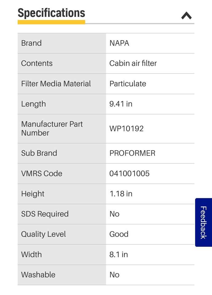 NAPA PROFORMER Cabin Air Filter Part #2230192