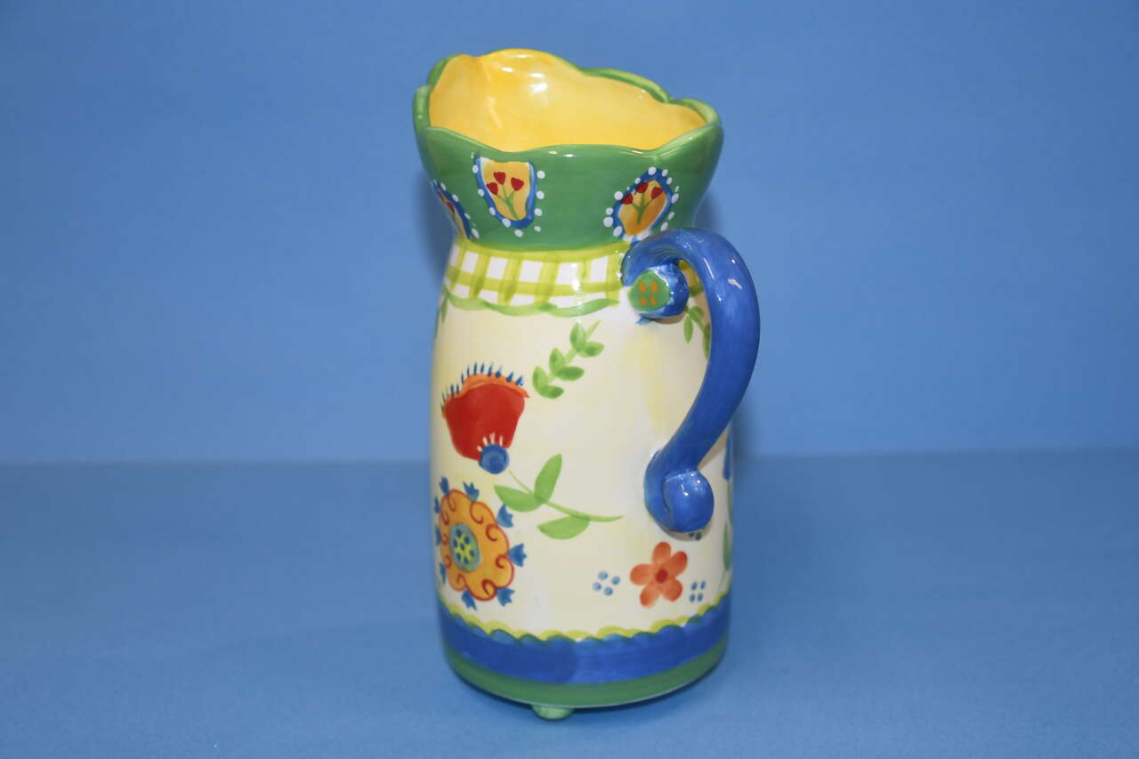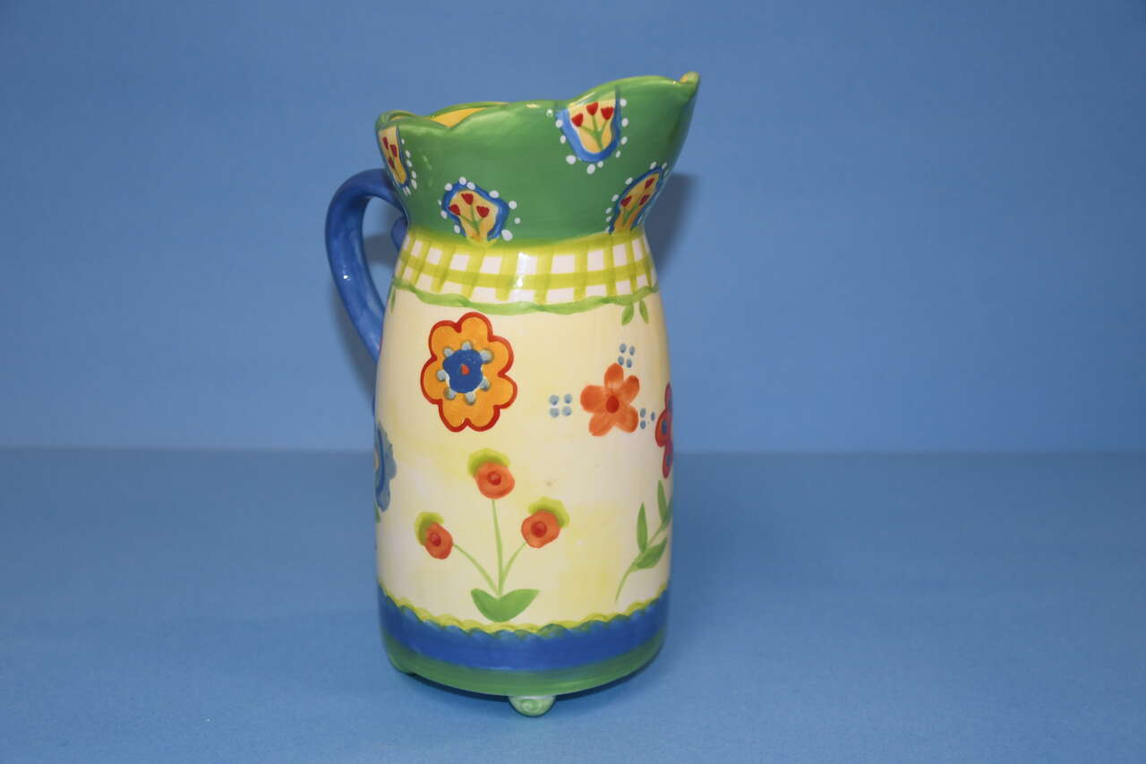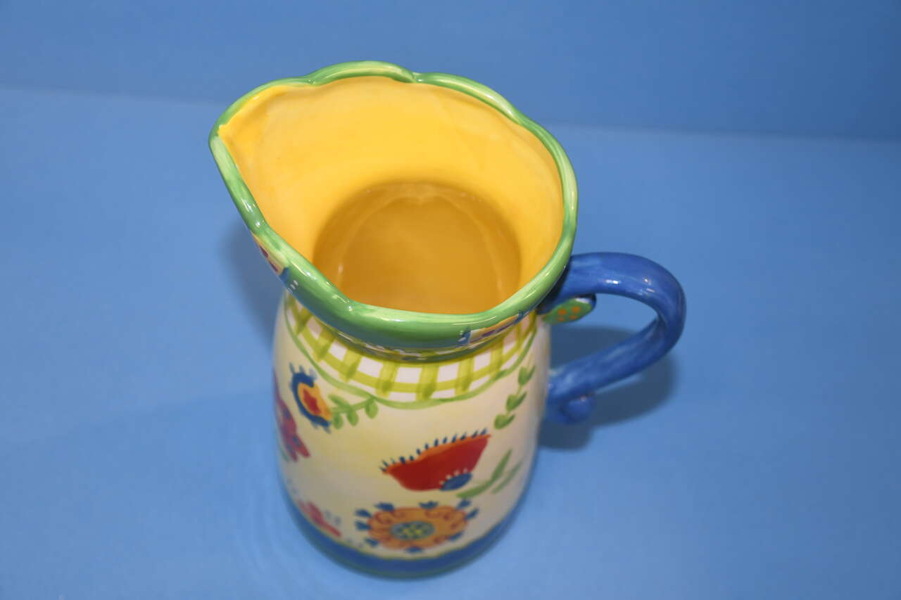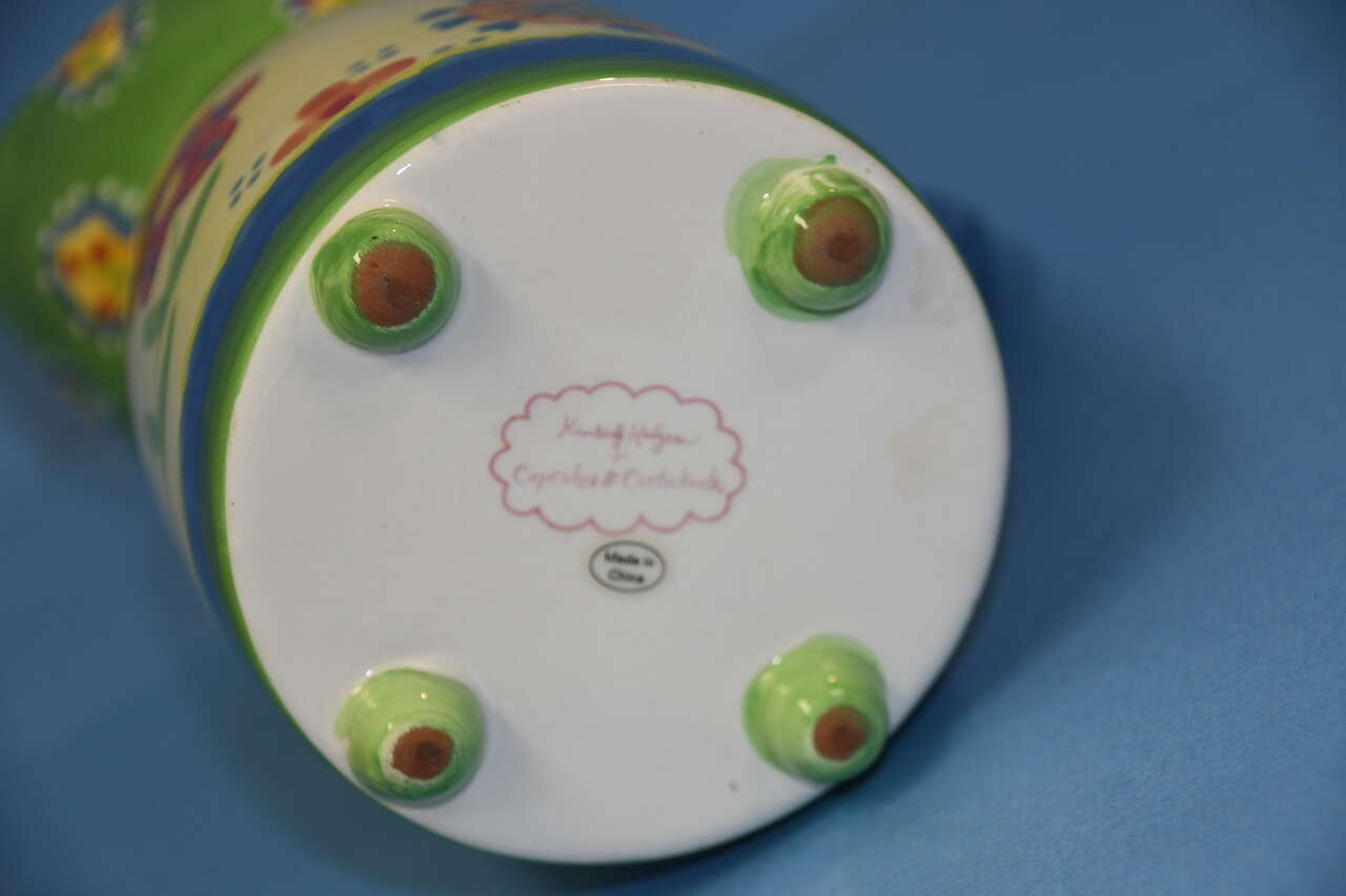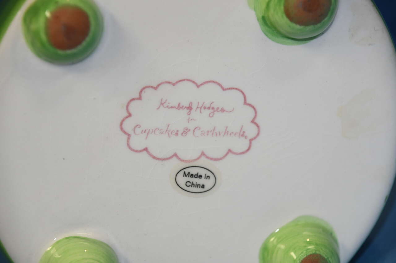 This CUTE CUPCAKES & CARTWHEELS CERAMIC PITCHER by Kimberly Hodges is about 8.5" in height. There are NO CHIPS! Our home is smoke free. Questions??? Please ask. We are located in Plain City. Cash only please.