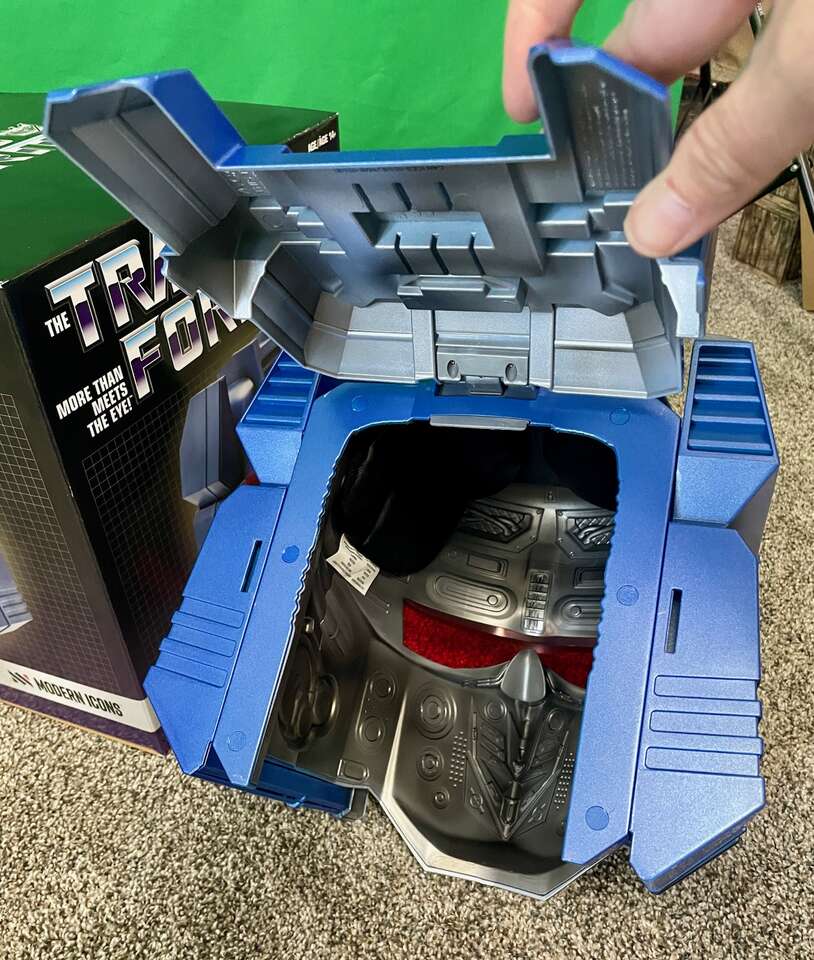 Soundwave helmet: Done in blue and silver with painted highlights. The helmet features a light-up red eye visor, and will play several of Soundwave's iconic phrases, using his eerie vocoded robot voice! Uses three AAA batteries (not included). The helmet has padding for comfortable wear, and an easy-access swing open panel for easy donning and removal! Also includes: Instruction booklet. Full original packaging.