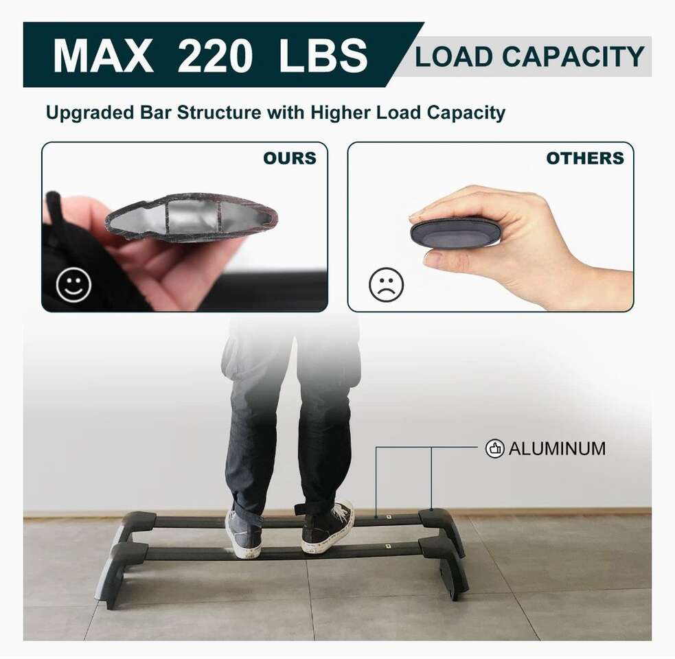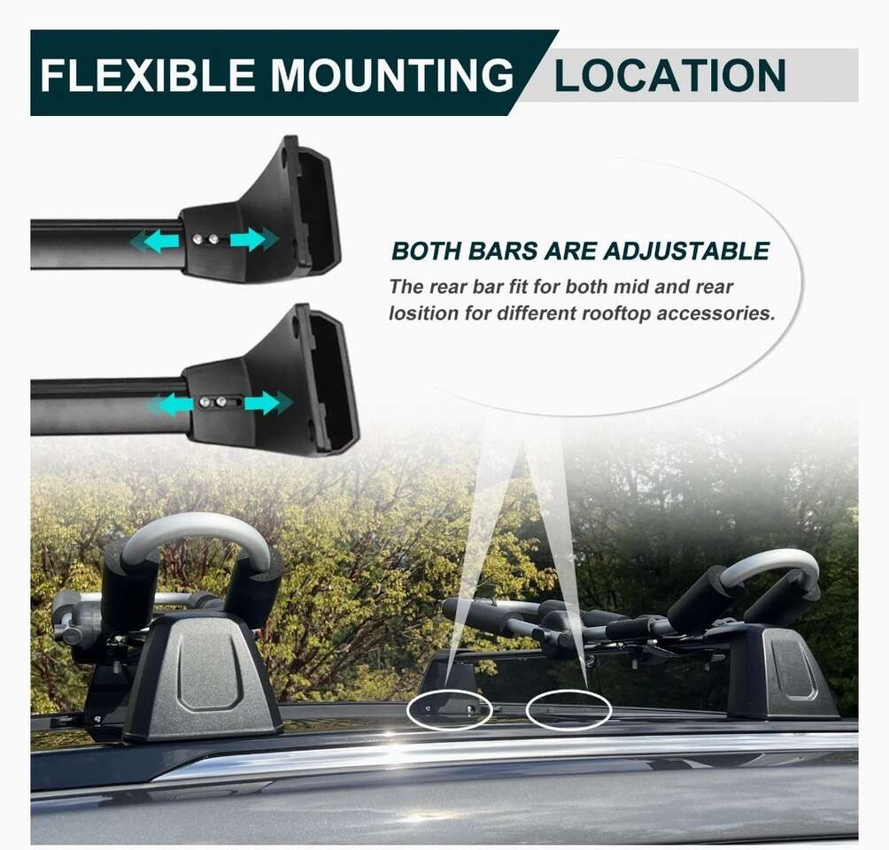 BETTER THAN OEM: Our aftermarket crossbars are upgraded with strong ALUMINUM BRACKET AND CLAMPS, which provides them better capacity versus the OEM aluminum bracket but ABS clamps. FLEXIBLE MOUNTING POSITIONS: The luggage racks are adjustable on both ends of both bars. The rear bar fits for both mid position and rear positions so that you can mount it as expected for different rooftop accessories. EASY TO INSTALL: You can easily mount the crossbars into the existing preset locations on the inside of the roof side rails. No drilling and no cutting. All hardware is included in the package. MEET DIFFERENT NEEDS: Maximum 220 lbs load capacity. The roof bar is compatible with various roof mount carriers such as bikes, kayaks, snowboards, ski racks, and other accessories.