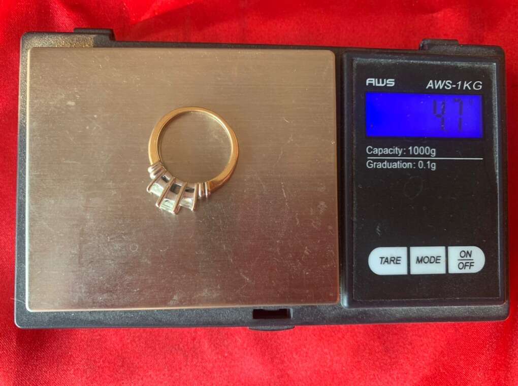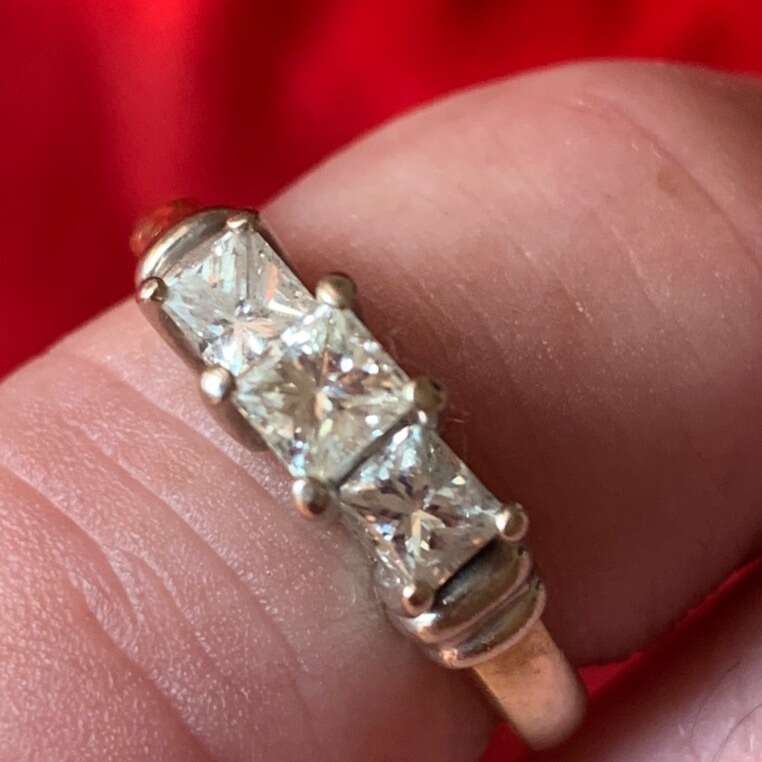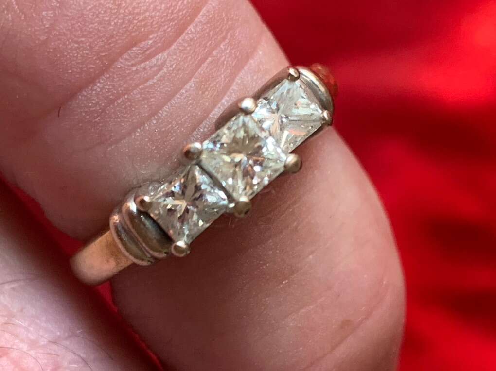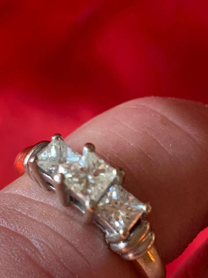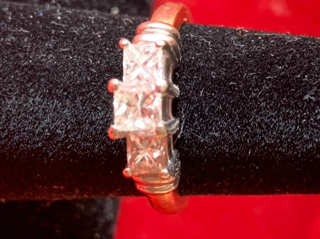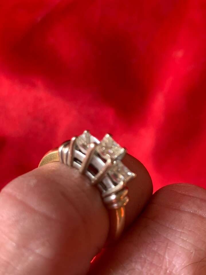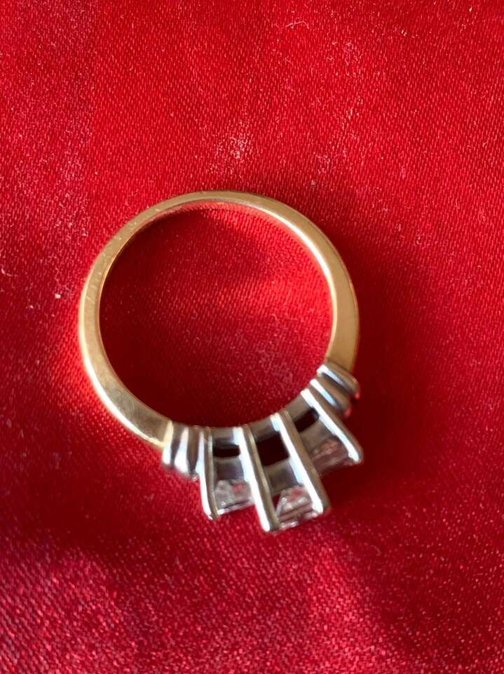 Purchased at Kay Jewelers for $3,500, just upgraded to a larger one and have no use for it, great shape with light normal wear, two tone solid 14k yellow and white gold and about 0.75 carat three stone princess cut diamonds. It weighs 4.7 grams, hallmarked ZEI and size 6.75. Lost papers with details and price when moved but feel free to return it for any reason or if not as described. Cash only