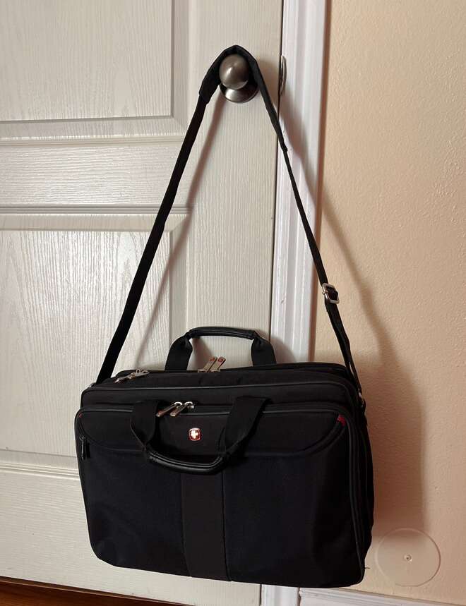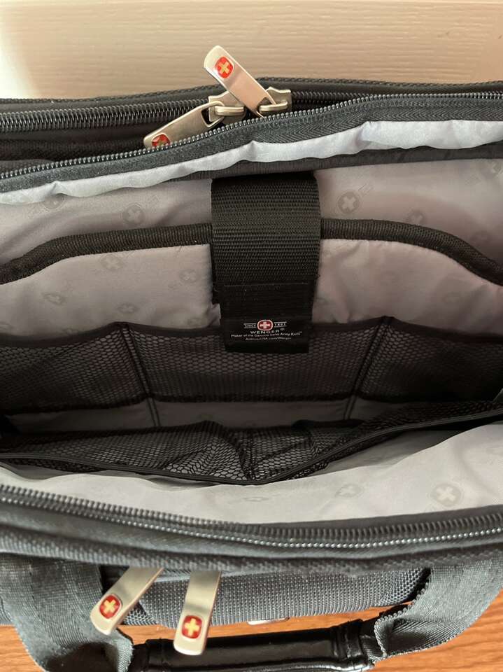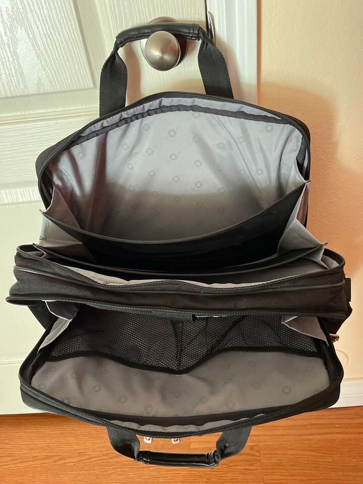 Black Swiss laptop/travel bag with shoulder strap. Total of 23 pockets and compartments. Clean, from smoke free and pet free home. Dimensions: 16” x 7” x 11,2”. Fits under the airline seat. $20